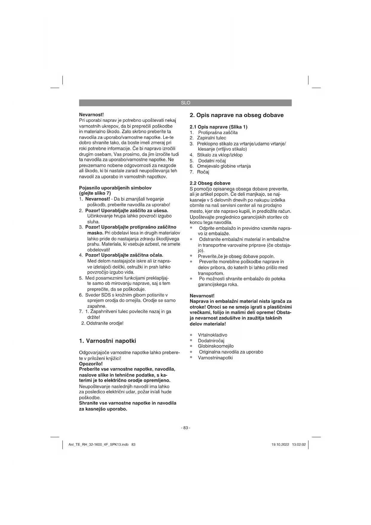 Odgovarjajoče varnostne napotke lahko prebere- te v priloženi knjižici! Opozorilo! Preberite vse varnostne napotke, navodila, naslove slike in tehnične podatke, s ka- terimi je to električno orodje opremljeno. Neupoštevanje naslednjih navodil ima lahko za posledico električni udar, požar in/ali hude poškodbe. Shranite vse varnostne napotke in navodila za kasnejšo uporabo.