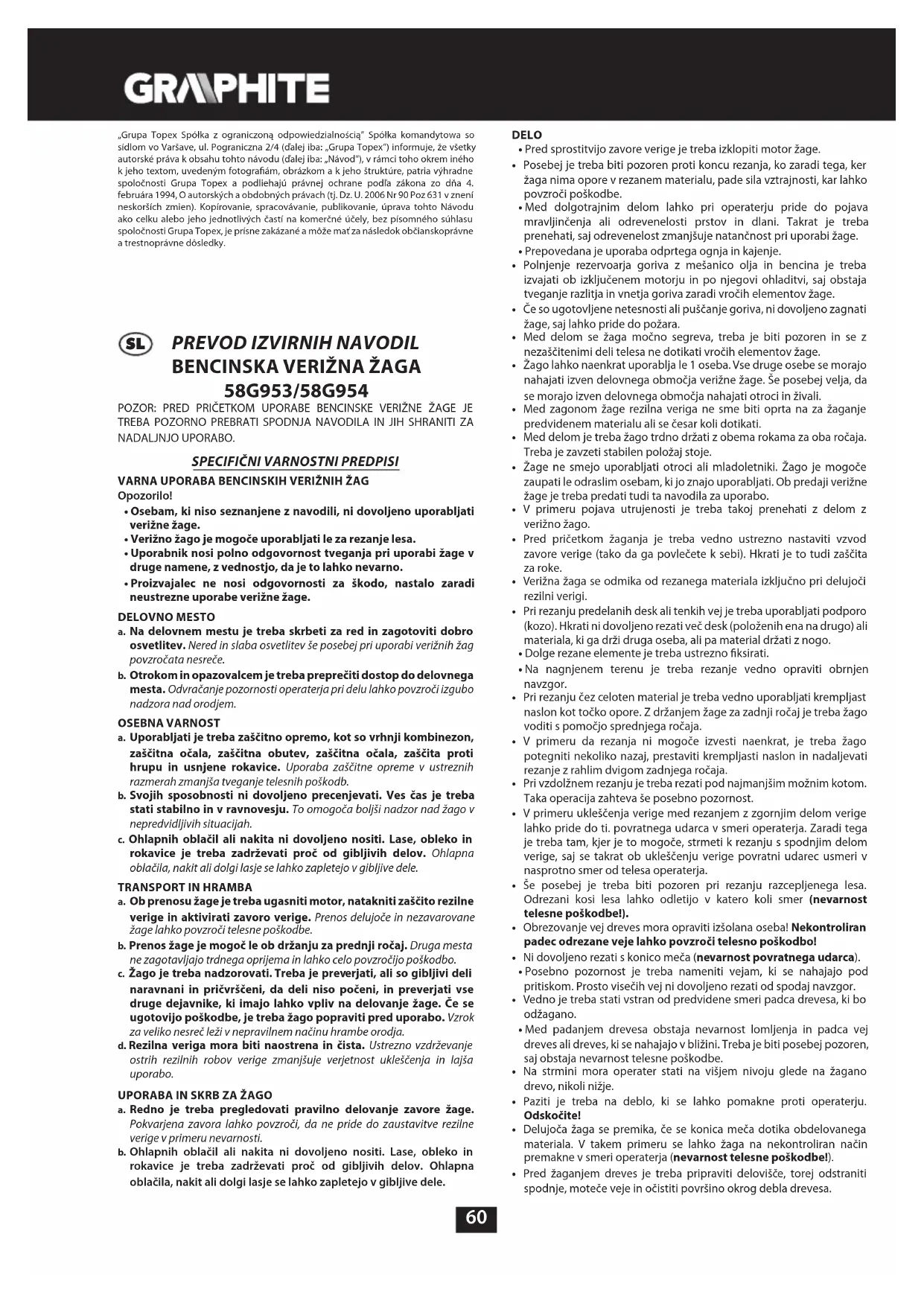 - Uporabnik nosi polno odgovornost tveganja pri uporabi žage v druge namene, z vednostjo, da je to lahko nevarno.