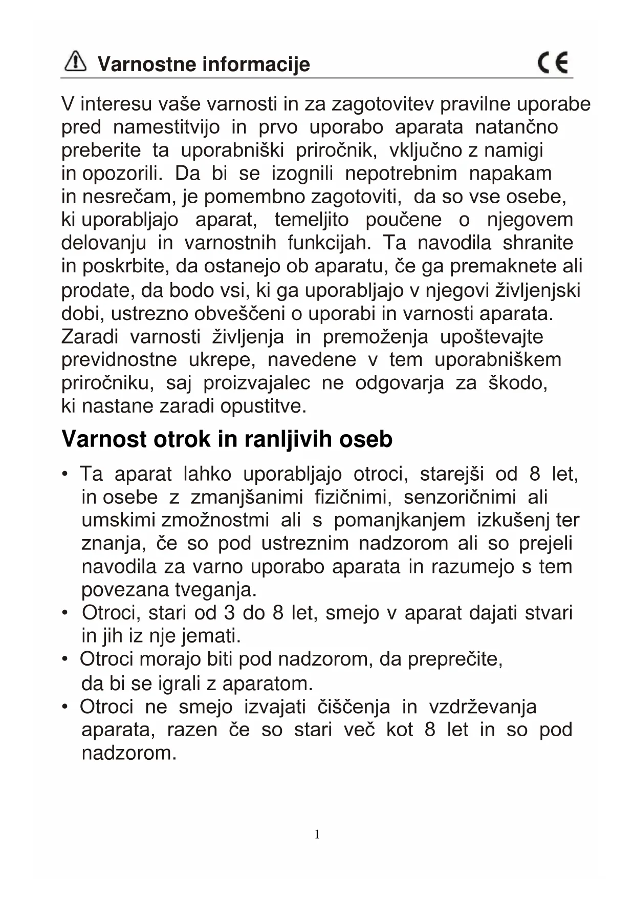- Otroci ne smejo izvajati čiščenja in vzdrževanja aparata, razen če so stari več kot 8 let in so pod nadzorom.Varnostne informacije