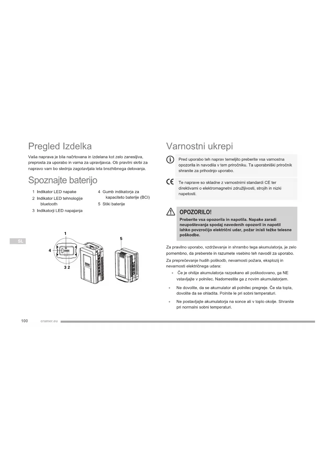 aktivirana. Baterija se polni in prazni. Ko vstavite baterijo v izdelek ali polnilnik, se aktivira tudi Bluetooth. Lučka LED4 je vklopljena Povezava Bluetooth v aplikaciji je vzpostavljena OPOMBA: Ko pritisnete gumb BCI, lučka za Bluetooth zasveti modro za 30 sekund. Če je baterija povezana z aplikacijo, bo modra lučka svetila še naprej. Poleg aktiviranja baterije morate aktivirati tudi Bluetooth na pametnem telefonu. Če je čas povezovanja več kot 30 sekund, ponovno pritisnite gumb BCI, da ponovno aktivirate baterijo, in se prepričajte, da je pametni telefon pripravljen na povezavo. INDIKATOR LED NAPAKE (RDEČA LUČKA LED) Lučka LED5 je izklopljena Običajno Običajni način delovanja Lučka LED5 utripa; LED1, LED2, LED3, LED4 – vse lučke so izklopljene Napaka Previsoka ali prenizka temperatura OPOMBA: Če utripa lučka LED5, baterijski sklop ne bo deloval. Počakajte, da se temperatura baterijskega sklopa pade na običajno raven. Povezovanje baterije z aplikacijo GreenFleet Aplikacija bo uporabniku prinesla dodatno korist. Prenesite aplikacijo in raziščite, kako vam lahko GreenFleet pomaga k večji organiziranosti in učinkovitosti na delu. Za aplikacijo veljajo posebni pogoji in določila, ki si jih lahko ogledate prek mobilne aplikacije. Prenesite aplikacijo: IOS Android Vzdrževanje Rezil OPOZORILO! Zavorna tekočina, gorivo, izdelki na bazi petroleja in pronicajoče olje naj nikoli ne pridejo v stik s plastičnimi deli. Ti vsebujejo kemikalije, ki lahko poškodujejo, oslabijo ali uničijo plastiko.105 cramer.eu