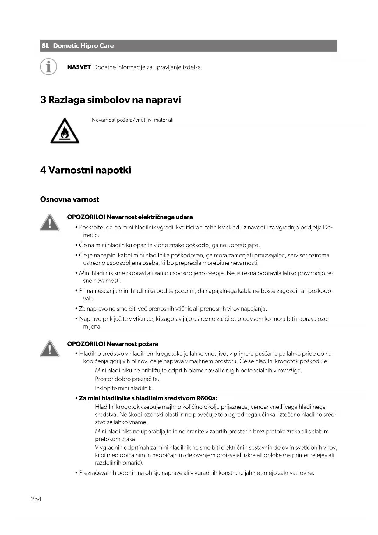 Tehnični podatki......................................................................................................................... 277 1 Pomembna obvestila Pozorno preberite in upoštevajte vsa navodila, smernice in opozorila iz tega priročnika, da zagotovite pravilno vgradnjo, uporabo in vzdrževanje izdelka. Ta navodila MORATE hraniti skupaj z izdelkom. Z uporabo izdelka potrjujete, da ste pozorno prebrali vsa navodila, smernice in opozorila ter razumete in upoštevate vsa določila ter pogoje v tem dokumentu. Strinjate se, da boste izdelek uporabljali samo za predvideni namen uporabe in v skladu z navodili, smernicami in opozorili v tem priročniku ter v skladu z vsemi veljavnimi zakoni in predpisi. Če navodil in opozoril v nadaljevanju ne preberete in ne upoštevate, boste morda poškodovali izdelek ali povzročili materialno škodo v bližini. Pridržujemo si pravico do spre- memb in posodobitev priročnika, vključno z navodili, smernicami in opozorili ter povezano dokumentacijo. Za najnovejše informacije o izdelku obiščite documents.dometi c.com. 2 Razlaga simbolov NEVARNOST! Označuje nevarno situacijo, ki povzroči smrt ali hude poškodbe, če ni preprečena. OPOZORILO! Označuje nevarno situacijo, ki lahko povzroči smrt ali hude poškodbe, če ni preprečena. POZOR! Označuje nevarno situacijo, ki lahko povzroči lažje ali zmerne poškodbe, če ni preprečena. OBVESTILO! Označuje nevarno situacijo, ki lahko povzroči materialno škodo, če ni preprečena. 263SLDometic Hipro Care NASVET Dodatne informacije zaupravljanje izdelka. 3 Razlaga simbolov na napravi Nevarnost požara/vnetljivi materiali 4 Varnostni napotki Osnovna varnost OPOZORILO! Nevarnost električnega udara