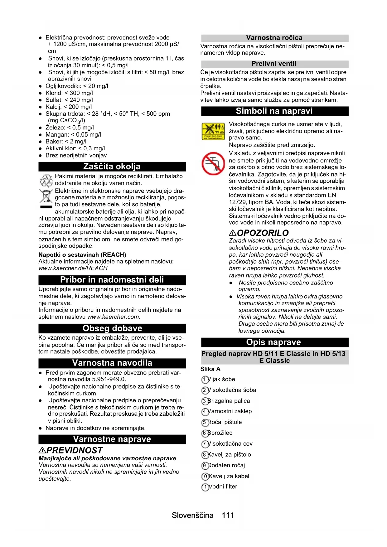/l) ● Železo: < 0,5 mg/l ● Mangan: < 0,05 mg/l ● Baker: < 2 mg/l ● Aktivni klor: < 0,3 mg/l ● Brez neprijetnih vonjav Zaščita okolja Pakirni material je mogoče reciklirati. Embalažo odstranite na okolju varen način. Električne in elektronske naprave vsebujejo dra- gocene materiale z možnostjo recikliranja, pogos- to pa tudi sestavne dele, kot so baterije, akumulatorske baterije ali olja, ki lahko pri napač- ni uporabi ali napačnem odstranjevanju škodujejo zdravju ljudi in okolju. Navedeni sestavni deli so kljub te- mu potrebni za pravilno delovanje naprave. Naprav, označenih s tem simbolom, ne smete odvreči med go- spodinjske odpadke. Napotki o sestavinah (REACH) Aktualne informacije najdete na spletnem naslovu: www.kaercher.de/REACH Pribor in nadomestni deli Uporabljajte samo originalni pribor in originalne nado- mestne dele, ki zagotavljajo varno in nemoteno delova- nje naprave. Informacije o priboru in nadomestnih delih najdete na spletnem naslovu www.kaercher.com. Obseg dobave Ko vzamete napravo iz embalaže, preverite, ali je vse- bina popolna. Če manjka pribor ali če so med transpor- tom nastale poškodbe, obvestite prodajalca. Varnostna navodila ● Pred prvim zagonom morate obvezno prebrati var- nostna navodila 5.951-949.0. ● Upoštevajte nacionalne predpise za čistilnike s te- kočinskim curkom. ● Upoštevajte nacionalne predpise o preprečevanju nesreč. Čistilnike s tekočinskim curkom je treba re- dno preskušati. Rezultat preskusa je treba zabeležiti v pisni obliki. ● Naprave in dodatkov ne spreminjajte. Varnostne naprave 몇 PREVIDNOST Manjkajoče ali poškodovane varnostne naprave Varnostna navodila so namenjena vaši varnosti. Varnostnih navodil nikoli ne spreminjajte in jih vedno upoštevajte. Varnostna ročica Varnostna ročica na visokotlačni pištoli preprečuje ne- nameren vklop naprave. Prelivni ventil Če je visokotlačna pištola zaprta, se prelivni ventil odpre in celotna količina vode bo stekla nazaj na sesalno stran črpalke. Prelivni ventil nastavi proizvajalec in ga zapečati. Nasta- vitev lahko izvaja samo služba za pomoč strankam. Simboli na napravi Opis naprave Pregled naprav HD 5/11 E Classic in HD 5/13 E Classic Slika A 1 Vijak šobe 2 Visokotlačna šoba 3 Brizgalna palica 4 Varnostni zaklep 5 Ročaj pištole 6 Sprožilec 7 Visokotlačna cev 8 Kavelj za pištolo 9 Dodaten ročaj 10 Kavelj za kabel 11 Vodni filter Visokotlačnega curka ne usmerjate v ljudi, živali, priključeno električno opremo ali na- pravo samo. Napravo zaščitite pred zmrzaljo. V skladu z veljavnimi predpisi naprave nikoli ne smete priključiti na vodovodno omrežje za oskrbo s pitno vodo brez sistemskega lo- čevalnika. Zagotovite, da je priključek na hi- šni vodovodni sistem, s katerim se uporablja visokotlačni čistilnik, opremljen s sistemskim ločevalnikom v skladu s standardom EN 12729, tipom BA. Voda, ki teče skozi sistem- ski ločevalnik je klasificirana kot nepitna. Sistemski ločevalnik vedno priključite na do- vod vode in nikoli neposredno na napravo. 몇 OPOZORILO Zaradi visoke hitrosti odvoda iz šobe za vi- sokotlačno vodo prihaja do visoke ravni hru- pa, kar lahko povzroči neugodje ali poškoduje sluh (npr. povzroči tinitus) ose- bam v neposredni bližini. Nenehna visoka raven hrupa lahko povzroči gluhost. ● Nosite predpisano osebno zaščitno opremo. ● Visoka raven hrupa lahko ovira glasovno komunikacijo in zmanjša ali prepreči sposobnost zaznavanja zvočnih opozo- rilnih signalov. Nikoli ne delajte sami. Druga oseba mora biti prisotna zunaj de- lovnega območja.112 Slovenščina 12 Tok za shranjevanje brizgalne palice (za dolgo briz- galno palico) 13 Priključek za dovod vode 14 Odvod vode 15 Stikalo za vklop 16 Potisna ročica, zgoraj (podaljšana) Pregled naprav HD 5/11 EX Plus Classic in HD 5/13 EX Plus Classic Slika B 1 Vijak šobe 2 Visokotlačna šoba 3 Brizgalna palica 4 Varnostni zaklep 5 Ročaj pištole 6 Sprožilec 7 Visokotlačna cev 8 Potisna ročica, zgoraj (podaljšana) 9 Dodaten ročaj 10 Kavelj za kabel 11 Vodni filter 12 Tok za shranjevanje brizgalne palice (za dolgo briz- galno palico) 13 Priključek za dovod vode 14 Odvod vode 15 Stikalo za vklop 16 Ročica za navijanje 17 Držalo za brizgalno palico 18 Nastavek za odstranjevanje umazanije Prvi zagon NEVARNOST Nevarnost poškodb zaradi električnega udara Inštalacijo dovoda vode, električnih priključkov in viso- kotlačnega omrežja smejo izvesti samo pooblaščeni tehnični strokovnjaki. Barvno kodiranje ● Nadzorni elementi za postopek čiščenja so rumene barve. Razpakiranje
