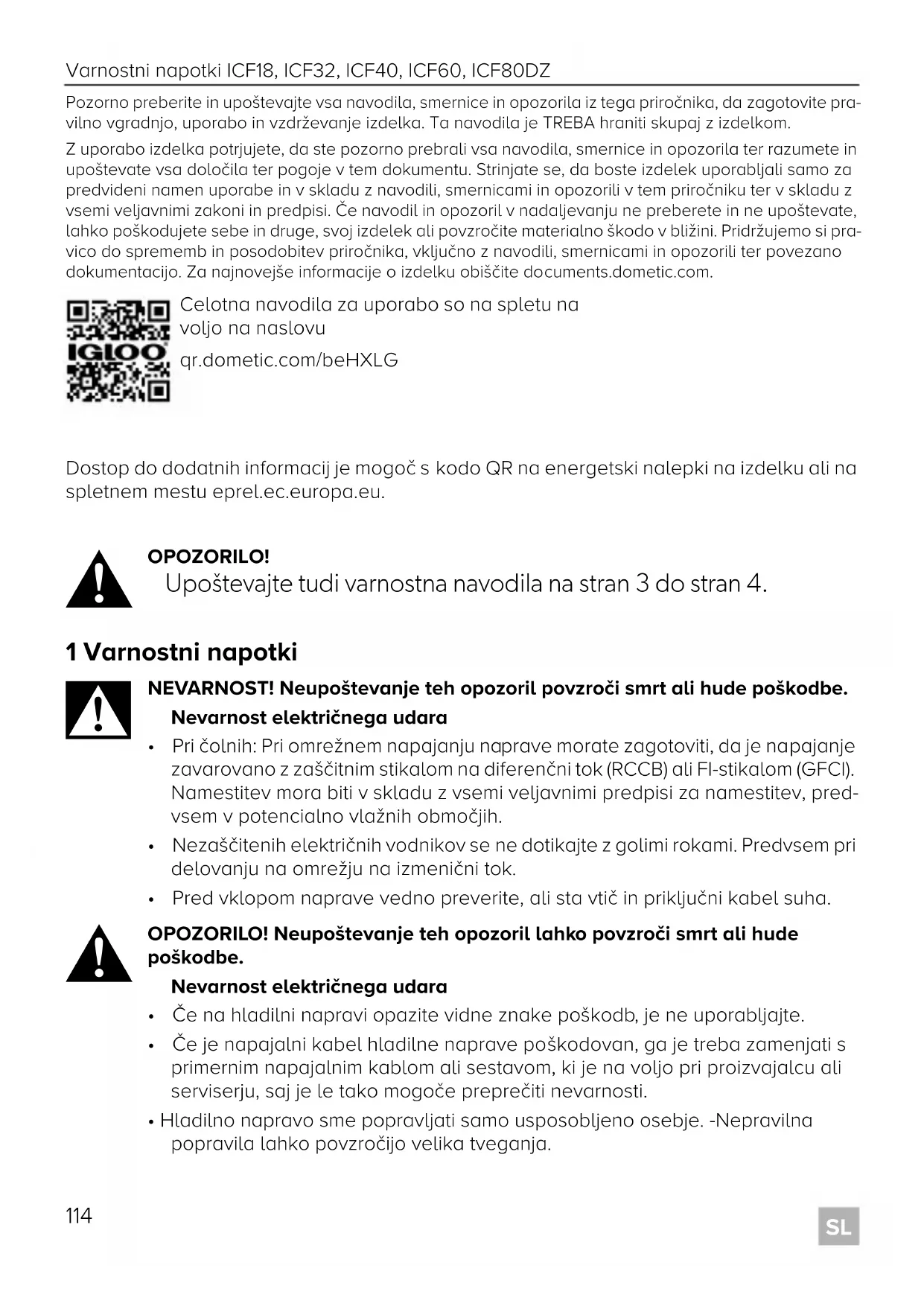 Pozorno preberite in upoštevajte vsa navodila, smernice in opozorila iz tega priročnika, da zagotovite pra- vilno vgradnjo, uporabo in vzdrževanje izdelka. Ta navodila je TREBA hraniti skupaj z izdelkom. Z uporabo izdelka potrjujete, da ste pozorno prebrali vsa navodila, smernice in opozorila ter razumete in upoštevate vsa določila ter pogoje v tem dokumentu. Strinjate se, da boste izdelek uporabljali samo za predvideni namen uporabe in v skladu z navodili, smernicami in opozorili v tem priročniku ter v skladu z vsemi veljavnimi zakoni in predpisi. Če navodil in opozoril v nadaljevanju ne preberete in ne upoštevate, lahko poškodujete sebe in druge, svoj izdelek ali povzročite materialno škodo v bližini. Pridržujemo si pra- vico do sprememb in posodobitev priročnika, vključno z navodili, smernicami in opozorili ter povezano dokumentacijo. Za najnovejše informacije o izdelku obiščite documents.dometic.com. Dostop do dodatnih informacij je mogoč s kodo QR na energetski nalepki na izdelku ali na spletnem mestu eprel.ec.europa.eu.