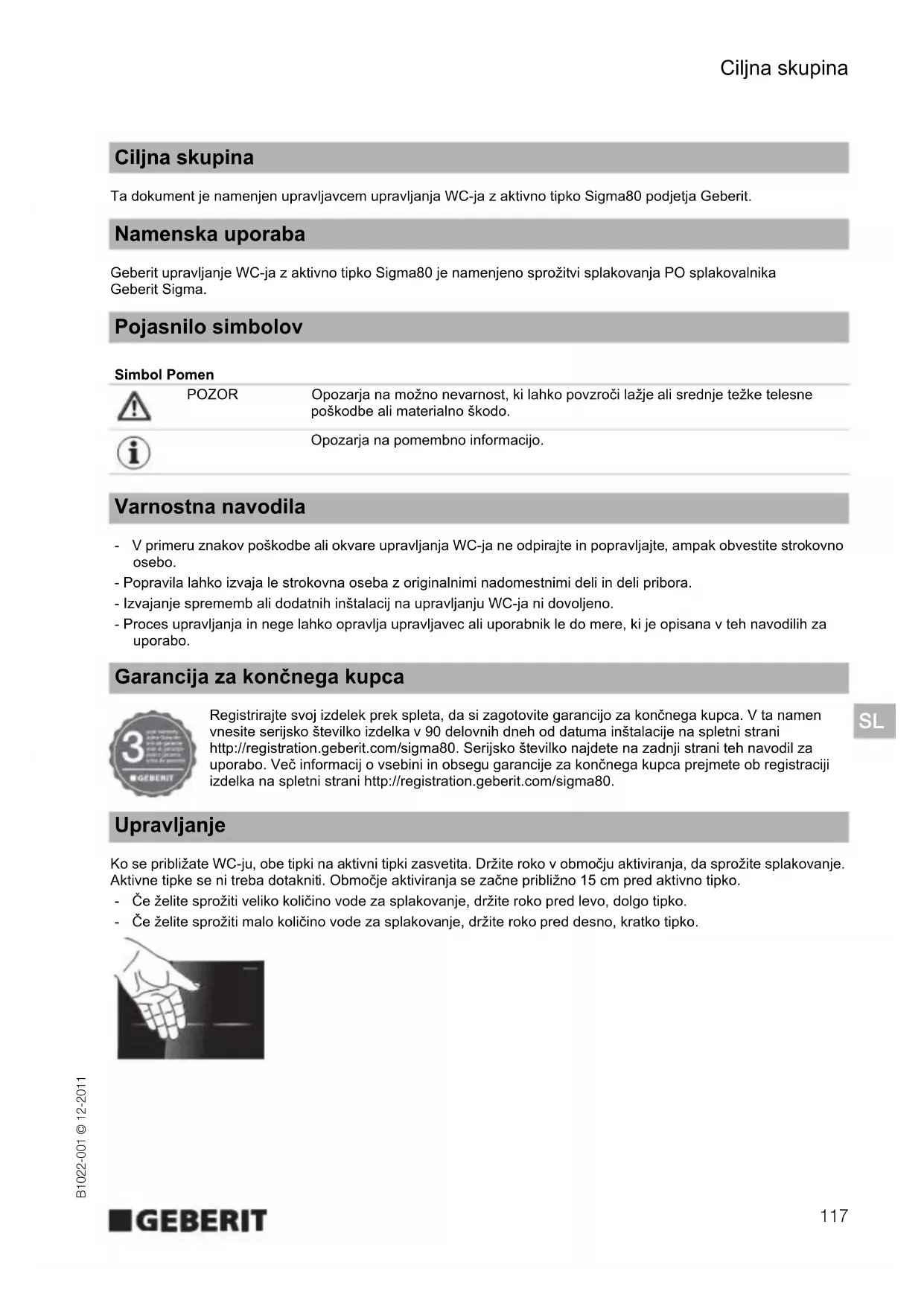 Ta dokument je namenjen upravljavcem upravljanja WC-ja z aktivno tipko Sigma80 podjetja Geberit. Geberit upravljanje WC-ja z aktivno tipko Sigma80 je namenjeno sprožitvi splakovanja PO splakovalnika Geberit Sigma. - V primeru znakov poškodbe ali okvare upravljanja WC-ja ne odpirajte in popravljajte, ampak obvestite strokovno osebo. - Popravila lahko izvaja le strokovna oseba z originalnimi nadomestnimi deli in deli pribora. - Izvajanje sprememb ali dodatnih inštalacij na upravljanju WC-ja ni dovoljeno. - Proces upravljanja in nege lahko opravlja upravljavec ali uporabnik le do mere, ki je opisana v teh navodilih za uporabo. Registrirajte svoj izdelek prek spleta, da si zagotovite garancijo za končnega kupca. V ta namen vnesite serijsko številko izdelka v 90 delovnih dneh od datuma inštalacije na spletni strani http://registration.geberit.com/sigma80. Serijsko številko najdete na zadnji strani teh navodil za uporabo. Več informacij o vsebini in obsegu garancije za končnega kupca prejmete ob registraciji izdelka na spletni strani http://registration.geberit.com/sigma80. Ko se približate WC-ju, obe tipki na aktivni tipki zasvetita. Držite roko v območju aktiviranja, da sprožite splakovanje. Aktivne tipke se ni treba dotakniti. Območje aktiviranja se začne približno 15 cm pred aktivno tipko. - Če želite sprožiti veliko količino vode za splakovanje, držite roko pred levo, dolgo tipko. - Če želite sprožiti malo količino vode za splakovanje, držite roko pred desno, kratko tipko. Ciljna skupina Namenska uporaba Pojasnilo simbolov Simbol Pomen POZOR Opozarja na možno nevarnost, ki lahko povzroči lažje ali srednje težke telesne poškodbe ali materialno škodo. Opozarja na pomembno informacijo. Varnostna navodila Garancija za končnega kupca Upravljanje118 Nastavitve B1022-001 © 12-2011 Pri Geberit upravljanju WC-ja z aktivno tipko Sigma80 lahko izvedete določene nastavitve. Navodila za to najdete na naslednjih straneh. Pregled Pri Geberit upravljanju WC-ja z aktivno tipko Sigma80 lahko izvedete dodatne nastavitve. Če želite spremeniti katero od nastavitev iz spodnje tabele, se obrnite na strokovno osebo. Nastavitve Nastavitev Opis Tovarniška nastavitev A Aktiviranje ali deaktiviranje čistilne funkcije Aktivno tipko in WC lahko očistite brez sprožitve splakovanja. Aktivirate lahko čistilno funkcijo in jo po končanem čiščenju znova deaktivirate. Čistilna funkcija se samodejno deaktivira po 3 min.
