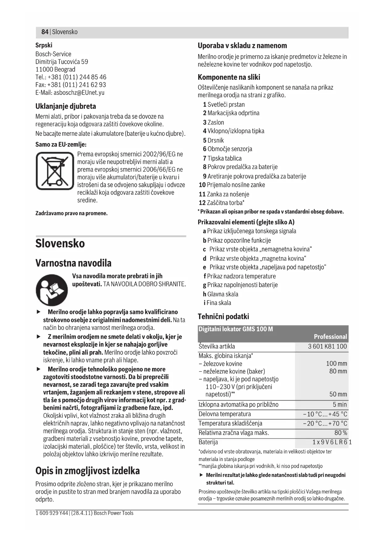 - Prikazan ali opisan pribor ne spada v standardni obseg dobave. Prikazovalni elementi (glejte sliko A) a Prikaz izključenega tonskega signala b Prikaz opozorilne funkcije c Prikaz vrste objekta „nemagnetna kovina“ d Prikaz vrste objekta „magnetna kovina“ e Prikaz vrste objekta „napeljava pod napetostjo“ f Prikaz nadzora temperature g Prikaz napolnjenosti baterije h Glavna skala i Fina skala Tehnični podatki Digitalni lokator GMS 100 M Professional Številka artikla 3 601 K81 100 Maks. globina iskanja* – železove kovine – neželezne kovine (baker) – napeljava, ki je pod napetostjo 110–230 V (pri priključeni napetosti)** 100 mm 80 mm 50 mm Izklopna avtomatika po približno 5min Delovna temperatura –10 °C...+45 °C Temperatura skladiščenja –20 °C...+70 °C Relativna zračna vlaga maks. 80 % Baterija 1x9V6LR61 *odvisno od vrste obratovanja, materiala in velikosti objektov ter materiala in stanja podloge**manjša globina iskanja pri vodnikih, ki niso pod napetostjo f Merilni rezultat je lahko glede natančnosti slab tudi pri neugodni strukturi tal.Prosimo upoštevajte številko artikla na tipski ploščici Vašega merilnega orodja – trgovske oznake posameznih merilnih orodij so lahko drugačne. OBJ_BUCH-1418-001.book Page 84 Thursday, April 28, 2011 9:54 AMSlovensko | 85 Bosch Power Tools 1 609 929 Y44 | (28.4.11) Izjava o skladnosti Izjavljamo pod izključno odgovornostjo, da proizvod, ki je opisan pod „Tehnični podatki“ ustreza naslednjim standardom oz. standardiziranim dokumentom: EN 61010-1:2010-10, EN 61326-1:2006-05, EN 301489-3:2002-08, EN 301489-1:2008-04, EN 300330-1:2010-02, EN 300330-2:2010-02 ustrezno določilom Direktiv 2004/108/ES, 1999/5/ES. Robert Bosch GmbH, Power Tools Division D-70745 Leinfelden-Echterdingen Leinfelden, 23.03.2011 Montaža Namestitev/zamenjava baterije Pri uporabi merilnega orodja priporočamo uporabo alkalnih manganskih baterij. Pokrov predalčka za baterije 8 odprite tako, da najprej v smeri puščice pritisnite aretiranje 9, nato pa v smeri navzgor odprite pokrov predalčka. V predalček vložite baterijo, ki je priložena dobavi. Pri tem upoštevajte pravilen položaj polov, ki naj ustreza prikazu v notranjosti predalčka. Prikaz napolnjenosti baterije g vselej prikazuje aktualni status baterije: – baterija je polno napolnjena – baterija s kapaciteto 2/3 ali manj – baterija s kapaciteto 1/3 ali manj – prosimo menjajte baterijo f Če merilnega orodja dalj časa ne boste uporabljali, odstranite iz njega baterijo. Med daljšim skladiščenjem lahko baterija korodira ali se samodejno izprazni. Delovanje f Zavarujte merilno orodje pred vlago in direktnim sončnim sevanjem. f Merilnega orodja ne izpostavljajte extremnim temperaturam ali temperaturnim nihanjem. Pustite, da se temperatura pri večjih temperaturnih nihanjih najprej uravna, preden jo vklopite. Ekstremne tem- perature ali temperaturna nihanja lahko negativno vplivajo na natančnost merilnega orodja in prikaz na displeju. f Uporaba ali obratovanje oddajniniških naprav, kot so npr. WLAN, UMTS, letališki radar, oddajniki ali mikrovalovi, lahko v bližnji okolici vplivajo na merilno funkcijo. Zagon Vklop/izklop f Pred vklopom merilnega orodja preverite, če je območje senzorja 6 suho. Merilno orodje po potrebi obrišite s krpo. f Če je bilo merilno orodje izpostavljeno močnim temperaturnim spremembam, pred vklopom počakajte, da se temperatura izravna. Za vklop merilnega orodja prosimo pritisnite vklopno/ izklopno tipko 4. Za izklop merilnega orodja ponovno pritisnite vklopno/ izklopno tipko 4. Če pribl. 5 min ne pritisnite tipke na merilnem orodju in če ne iščete objektov, potem se merilno orodje zaradi varovanja baterije avtomatsko izklopi. Vklop/izklop zvočnega signala Zvočni signal lahko vklopite ali izklopite tako, da pri vklopljenem merilnem orodju za nekaj sekund pritisnete vklopno/izklopno tipko 4. Pri izklopljenem zvočnem signalu se pojavi na displeju prikaz a. Način delovanja (glejte sliki A –B) Z merilnim orodjem se preizkuša podloga senzorskega območja 6 v smeri merjenja z do maks. globine registriranja (glejte „Tehnični podatki“). Prepoznajo se objekti, ki se razlikujejo od materiala stene. Premikajte merilno orodje vedno ravno z rahlim pritiskom nad podlago, brez da bi jo vzdignili ali spremenili pritisni tlak. Med merjenjem se morajo drsniki 5 vedno stikati s podlago. Postopek meritve Po vklopu prstan 1 sveti zeleno. Namestite merilno orodje na površino, ki jo želite pregledati in jo premikajte v smeri osi x in y. Ko se prebližuje merilno orodje objektu, potem se odklon v glavni skali h povečuje in obroč 1 sveti rumeno. Ko pa se oddaljuje, se odklon zmanjša. Nad objektom prikazuje glavna skala h maksimalni odklon; obroč 1 sveti rdeče in zaslišite zvočni signal. Pri manjših ali globlje ležečih objektih lahko sveti obroč 1 še rumeno, zvočni signal pa izostane. f Širši objekti se ne prikazujejo po celotni dolžini skozi svetleč obroč oz. zvočni signal. Trajanje obratovanja pribl.