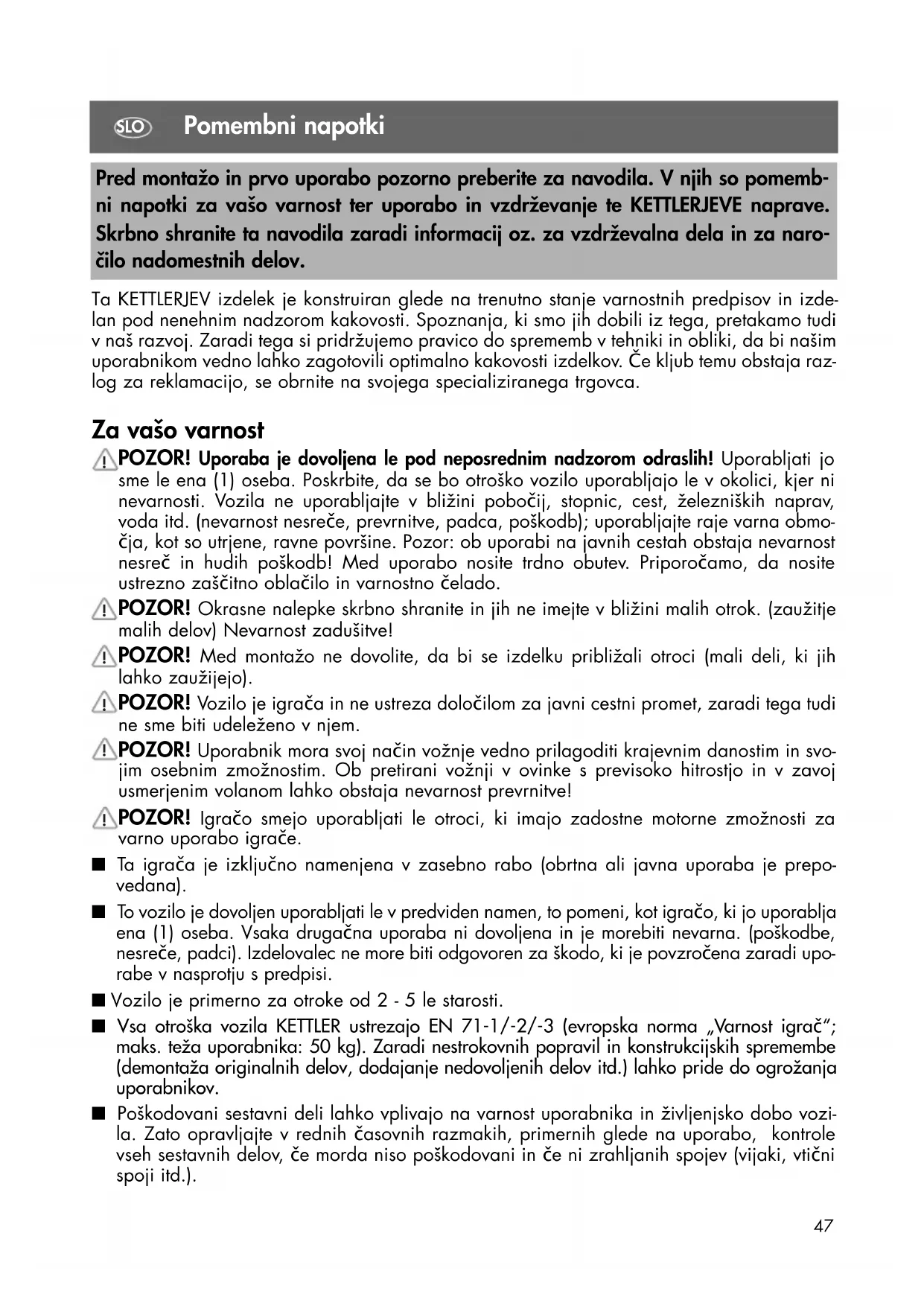 SK47 Pomembni napotki Ta KETTLERJEV izdelek je konstruiran glede na trenutno stanje varnostnih predpisov in izde- lan pod nenehnim nadzorom kakovosti. Spoznanja, ki smo jih dobili iz tega, pretakamo tudi v naš razvoj. Zaradi tega si pridržujemo pravico do sprememb v tehniki in obliki, da bi našim uporabnikom vedno lahko zagotovili optimalno kakovosti izdelkov. Če kljub temu obstaja raz- log za reklamacijo, se obrnite na svojega specializiranega trgovca. Za vašo varnost POZOR! Uporaba je dovoljena le pod neposrednim nadzorom odraslih! Uporabljati jo sme le ena (1) oseba. Poskrbite, da se bo otroško vozilo uporabljajo le v okolici, kjer ni nevarnosti. Vozila ne uporabljajte v bližini pobočij, stopnic, cest, železniških naprav, voda itd. (nevarnost nesreče, prevrnitve, padca, poškodb); uporabljajte raje varna obmo- čja, kot so utrjene, ravne površine. Pozor: ob uporabi na javnih cestah obstaja nevarnost nesreč in hudih poškodb! Med uporabo nosite trdno obutev. Priporočamo, da nosite ustrezno zaščitno oblačilo in varnostno čelado. POZOR! Okrasne nalepke skrbno shranite in jih ne imejte v bližini malih otrok. (zaužitje malih delov) Nevarnost zadušitve! POZOR! Med montažo ne dovolite, da bi se izdelku približali otroci (mali deli, ki jih lahko zaužijejo). POZOR! Vozilo je igrača in ne ustreza določilom za javni cestni promet, zaradi tega tudi ne sme biti udeleženo v njem. POZOR! Uporabnik mora svoj način vožnje vedno prilagoditi krajevnim danostim in svo- jim osebnim zmožnostim. Ob pretirani vožnji v ovinke s previsoko hitrostjo in v zavoj usmerjenim volanom lahko obstaja nevarnost prevrnitve! POZOR! Igračo smejo uporabljati le otroci, ki imajo zadostne motorne zmožnosti za varno uporabo igrače. ■ Ta igrača je izključno namenjena v zasebno rabo (obrtna ali javna uporaba je prepo- vedana). ■ To vozilo je dovoljen uporabljati le v predviden namen, to pomeni, kot igračo, ki jo uporablja ena (1) oseba. Vsaka drugačna uporaba ni dovoljena in je morebiti nevarna. (poškodbe, nesreče, padci). Izdelovalec ne more biti odgovoren za škodo, ki je povzročena zaradi upo- rabe v nasprotju s predpisi. ■ Vozilo je primerno za otroke od 2 - 5 le starosti. ■ Vsa otroška vozila KETTLER ustrezajo EN 71-1/-2/-3 (evropska norma „Varnost igrač“; maks. teža uporabnika: 50 kg). Zaradi nestrokovnih popravil in konstrukcijskih spremembe (demontaža originalnih delov, dodajanje nedovoljenih delov itd.) lahko pride do ogrožanja uporabnikov. ■ Poškodovani sestavni deli lahko vplivajo na varnost uporabnika in življenjsko dobo vozi- la. Zato opravljajte v rednih časovnih razmakih, primernih glede na uporabo, kontrole vseh sestavnih delov, če morda niso poškodovani in če ni zrahljanih spojev (vijaki, vtični spoji itd.). Pred montažo in prvo uporabo pozorno preberite za navodila. V njih so pomemb- ni napotki za vašo varnost ter uporabo in vzdrževanje te KETTLERJEVE naprave. Skrbno shranite ta navodila zaradi informacij oz. za vzdrževalna dela in za naro- čilo nadomestnih delov.