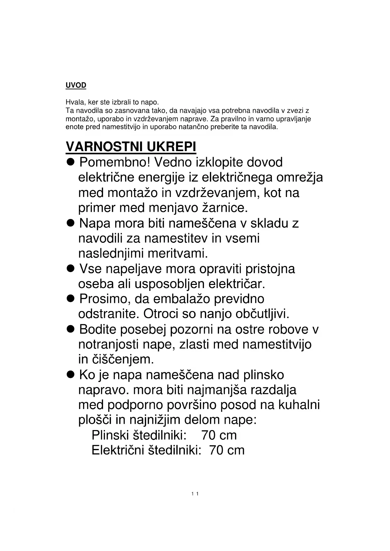 109UVOD Hvala, ker ste izbrali to napo. Ta navodila so zasnovana tako, da navajajo vsa potrebna navodila v zvezi z montažo, uporabo in vzdrževanjem naprave. Za pravilno in varno upravljanje enote pred namestitvijo in uporabo natančno preberite ta navodila. Pomembno! Vedno izklopite dovod električne energije iz električnega omrežja med montažo in vzdrževanjem, kot na primer med menjavo žarnice. VARNOSTNI UKREPI Napa mora biti nameščena v skladu z navodili za namestitev in vsemi naslednjimi meritvami. Vse napeljave mora opraviti pristojna oseba ali usposobljen električar. Prosimo, da embalažo previdno odstranite. Otroci so nanjo občutljivi. Bodite posebej pozorni na ostre robove v notranjosti nape, zlasti med namestitvijo in čiščenjem. Ko je napa nameščena nad plinsko napravo. mora biti najmanjša razdalja med podporno površino posod na kuhalni plošči in najnižjim delom nape: Plinski štedilniki: 70 cm Električni štedilniki: 70 cm 110Štedilniki na oglje ali olje: 80 cm Prepričajte se, da na ceveh ni zavojev večjih od 90 stopinj, saj bo to zmanjšalo učinkovitost nape. Napa je namenjena samo za uporabo v gospodinjstvu. ko kuhate na plinskem štedilniku, vedno postavite pokrove na lonce in ponve. Ne poskušajte uporabljati nape brez filtrov za mast ali če so filtri preveč zamaščeni! V načinu ekstrakcije zraka bo zrak iz prostora odstranjen z napo. Prepričajte se, da upoštevate ustrezne ukrepe za prezračevanje. Napa iz prostora odstrani neprijetne vonjave, vendar ne odstrani pare. Če kuhinjsko napo uporabljate istočasno kot aparate, ki zgorevajo plin ali druga goriva, morate poskrbeti za zadostno prezračevanje Ne namestite nad štedilnik z visokim žarom. Med uporabo ne pustite ponve brez nadzora, saj se lahko pregreta masti ali olj vnamejo. 111 Nikoli ne puščajte odprtega ognja pod napo. Če je napa poškodovana, je ne poskušajte uporabljati. Če je napajalni kabel poškodovan, ga mora zamenjati predstavnik proizvajalca, pooblaščene servisne službe ali druga strokovno usposobljena oseba, da se izognete nevarnosti. To napravo lahko uporabljajo otroci od osmega leta naprej ter osebe z zmanjšanimi telesnimi, čutnimi ali razumskimi sposobnostmi ali s pomanjkanjem izkušenj ter znanja le pod nadzorom ali če so dobili ustrezna navodila glede varne uporabe naprave in če se zavedajo nevarnosti, ki obstajajo. Otroci se ne smejo igrati z napravo. Čiščenja in uporabniškega vzdrževanja ne smejo izvajati otroci brez nadzora. Pozor: Naprava in dostopni deli se med uporabo segrejejo. Ne dotikajte se grelcev. Otroci mlajši od 8 let morajo biti izven dosega nape, razen če so pod stalnim nadzorom. 112– Zagotoviti je treba ustrezno prezračevanje prostora, ko se napa uporablja istočasno kot aparati, ki zgorevajo plin ali druga goriva – Če čiščenja ne izvajate v skladu z navodili, obstaja nevarnost požara – Pod kuhinjsko napo ne flambirajte. – POZOR: Pri uporabi pripomočkov za kuhanje se dostopni deli močno segrejejo –Zrak ne sme biti izločen v vod, ki je namenjen odvajanju dima iz naprav na plin ali drugo gorivo. – Najmanjša razdalja med podporno površino za posode na kuhalni plošči in najnižjim delom kuhinjske nape. (Ko je kuhinjska napa nad plinskim aparatom, mora biti ta razdalja vsaj 70 cm) – Izpolniti je treba predpise za odvajanje zraka. Aparat redno čistite v skladu z metodo, ki je opisana v poglavju VZDRŽEVANJE
