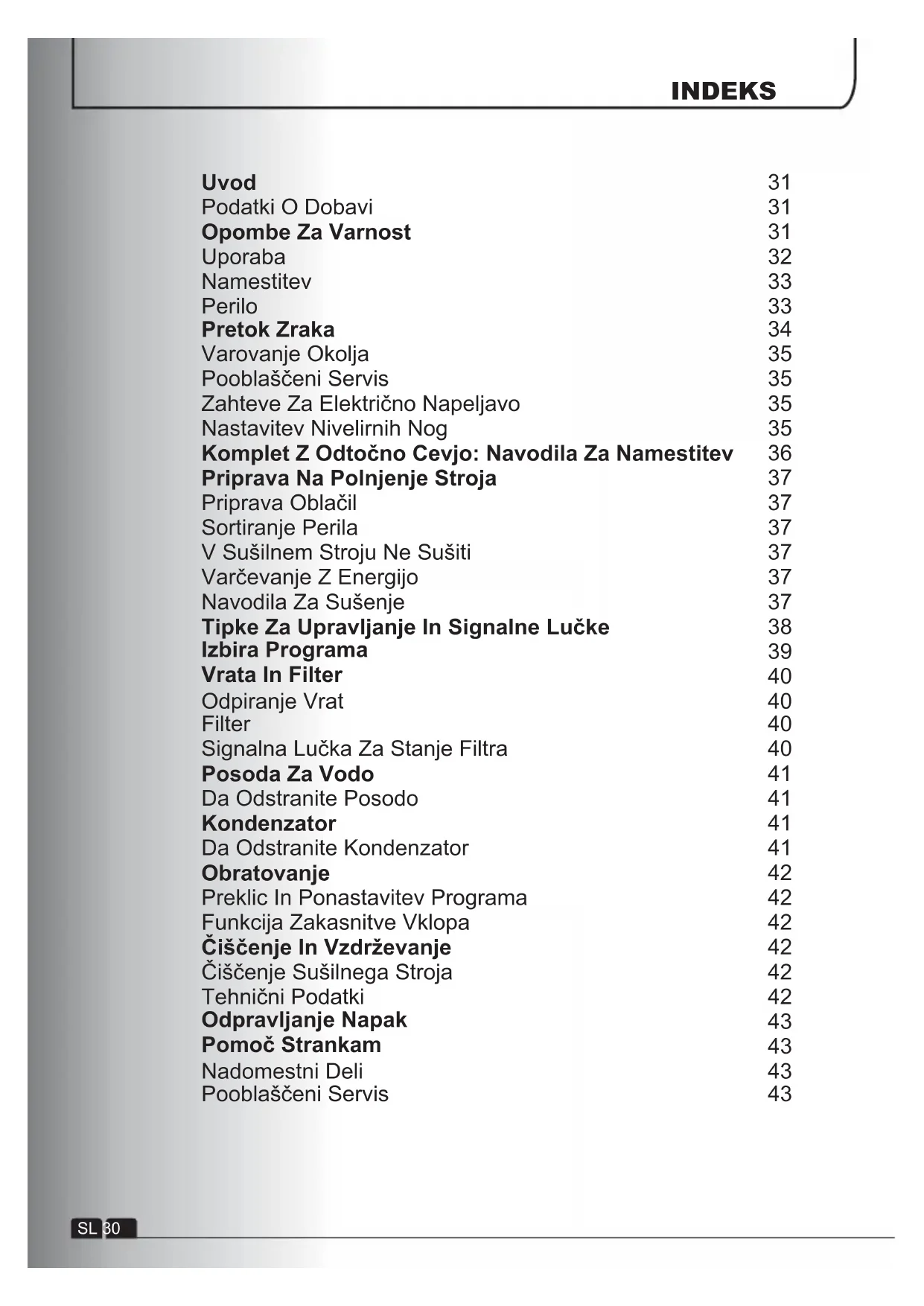Ⴠ Aparat lahko uporabljajo otroci, starejši od 8 let, in osebe z zmanjšanimi fizičnimi, zaznavnimi ali umskimi sposobnosti ali s pomanjkljivimi izkušnjami in predznanjem, vendar le pod nadzorom in če so jim bila razložena navodila za varno uporabo aparata in če se zavedajo s tem povezanih tveganj. Otroci se ne smejo igrati z aparatom, prav tako otroci ne smejo čistiti in vzdrževati aparata brez nadzora. Ⴠ OPOZORILO: Napačna uporaba sušilnega stroja lahko povzroči požar. Ⴠ Aparat je namenjen samo uporabi v gospodinjstvih in podobnih okoljih: - kuhinjah za osebje v pisarnah, delavnicah ali drugih delovnih okoljih; - na kmetijah; - za stranke v hotelih, motelih in drugih bivalnih okoljih; - v penzionih. Za drugačno uporabo v okoljih, ki se razlikujejo od uporabe v gospodinjstvih, kot na primer uporaba komercialne namene s strani strokovnjakov ali izučenih uporabnikov, ta aparat ni namenjen. Nenamenska uporaba aparata lahko skrajša njegovo življenjsko dobo in izniči veljavnost garancije. Proizvajalec ne prevzema nikakšrne odgovornosti, skladno z veljavnimi zakoni, za morebitno škodo na aparatu ali poškodbe ali izgubo zaradi nenamenske uporabe, tudi če je bil aparat uporabljan v gospodinjstvu. Ⴠ Ta naprava je namenjena izključno uporabi v gospodinjstvih, z njo lahko sušite le gospodinjski tekstil in oblačila. Če ne boste upoštevali zgornjih navodil, lahko ogrozite varnost naprave. Če bi napaka na stroju nastala zaradi nepravilne uporabe, vam lahko zaračunamo klic servisne službe. Prepričajte se, da med. prevozom stroj ni bil poškodovan. Če se je poškodoval, pokličite pooblaščeni servis. SL 31UVOD Uporaba