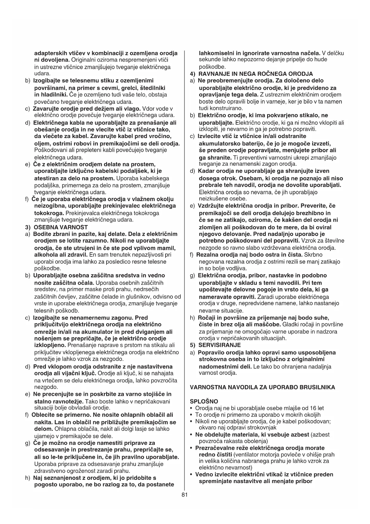 a) Ne preobremenjujte orodja. Za določeno delo uporabljajte električno orodje, ki je predvideno za opravljanje tega dela. Z ustreznim električnim orodjem boste delo opravili bolje in varneje, ker je bilo v ta namen tudi konstruirano. b) Električno orodje, ki ima pokvarjeno stikalo, ne uporabljajte. Električno orodje, ki ga ni možno vklopiti ali izklopiti, je nevarno in ga je potrebno popraviti. c) Izvlecite vtič iz vtičnice in/ali odstranite akumulatorsko baterijo, če jo je mogoče izvzeti, še preden orodje popravljate, menjujete pribor ali ga shranite. Ti preventivni varnostni ukrepi zmanjšajo tveganje za nenamenski zagon orodja. d) Kadar orodja ne uporabljaje ga shranjujte izven dosega otrok. Osebam, ki orodja ne poznajo ali niso prebrale teh navodil, orodja ne dovolite uporabljati. Električna orodja so nevarna, če jih uporabljajo neizkušene osebe. e) Vzdržujte električna orodja in pribor. Preverite, če premikajoči se deli orodja delujejo brezhibno in če se ne zatikajo, oziroma, če kakšen del orodja ni zlomljen ali poškodovan do te mere, da bi oviral njegovo delovanje. Pred nadaljnjo uporabo je potrebno poškodovani del popraviti. Vzrok za številne nezgode so ravno slabo vzdrževana električna orodja. f) Rezalna orodja naj bodo ostra in čista. Skrbno negovana rezalna orodja z ostrimi rezili se manj zatikajo in so bolje vodljiva. g) Električna orodja, pribor, nastavke in podobno uporabljajte v skladu s temi navodili. Pri tem upoštevajte delovne pogoje in vrsto dela, ki ga nameravate opraviti. Zaradi uporabe električnega orodja v druge, nepredvidene namene, lahko nastanejo nevarne situacije. h) Ročaji in površine za prijemanje naj bodo suhe, čiste in brez olja ali maščobe. Gladki ročaji in površine za prijemanje ne omogočajo varne uporabe in nadzora orodja v nepričakovanih situacijah.