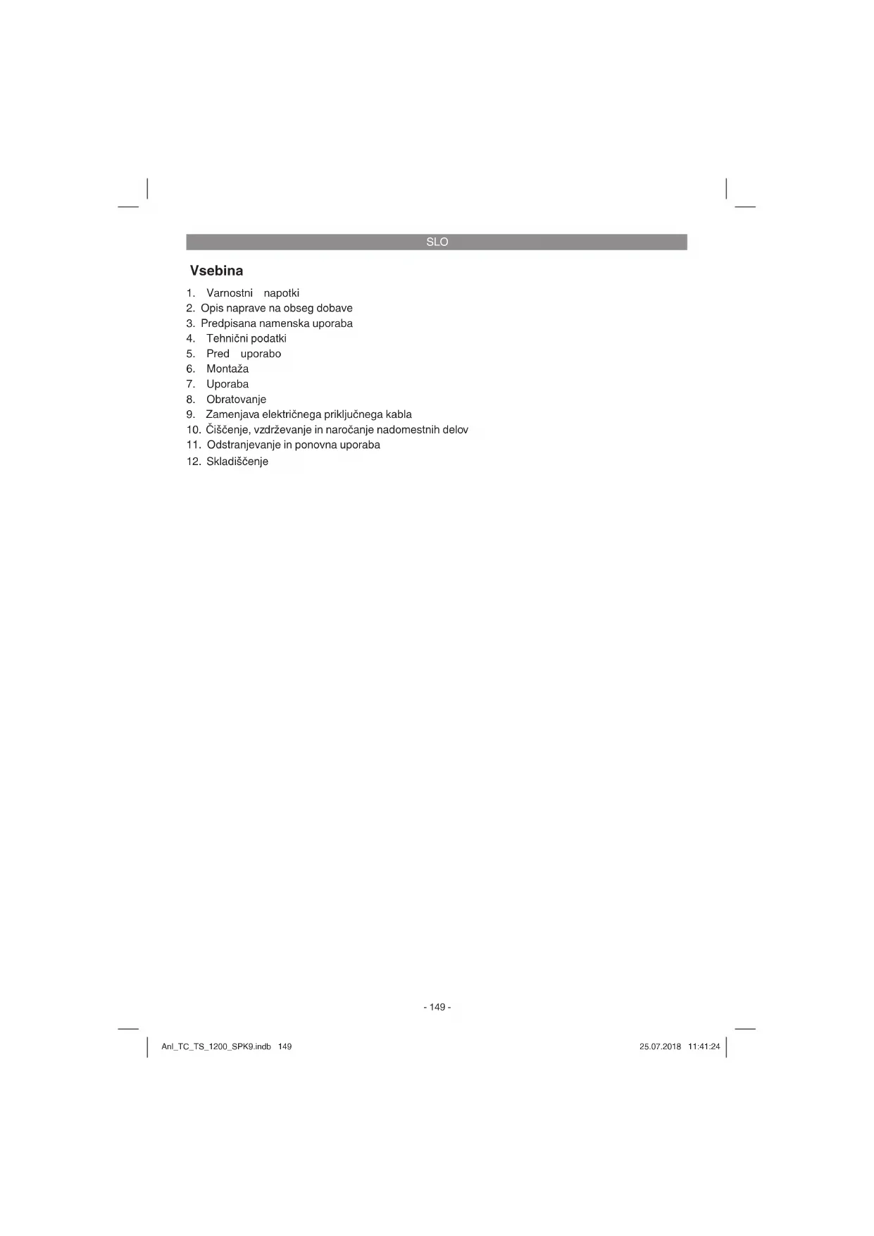 uporaba Naprava se nahaja v embalaži, da ne bi prišlo do poškodb med transportom. Ta embalaža je surovi- na in s tem ponovno uporabna ali pa jo je možno reciklirati. Naprava in njen pribor sta izdelana iz različnih materialov kot npr. kovine in plastika. Okvarjene naprave ne sodijo med gospodin- jske odpadke. Napravo odložite na ustreznem zbirališču, da bo pravilno odstranjena. Če ne poz- nate primernih zbirališč, se pozanimajte pri svoji občinski upravi. Anl_TC_TS_1200_SPK9.indb 156Anl_TC_TS_1200_SPK9.indb 156 25.07.2018 11:41:2525.07.2018 11:41:25SLO