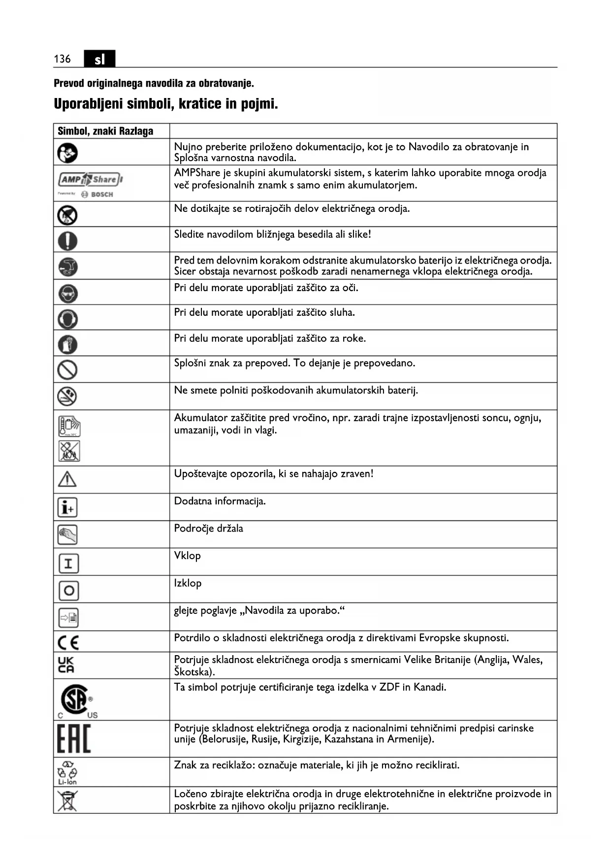 | EAC | Potruje skladnost elektricnega orodja z nacionalnimi tehnčnimi predpis carinske unije (Belorusije, Rusije, Kirgizije, Kazahstana in Armenije). |
