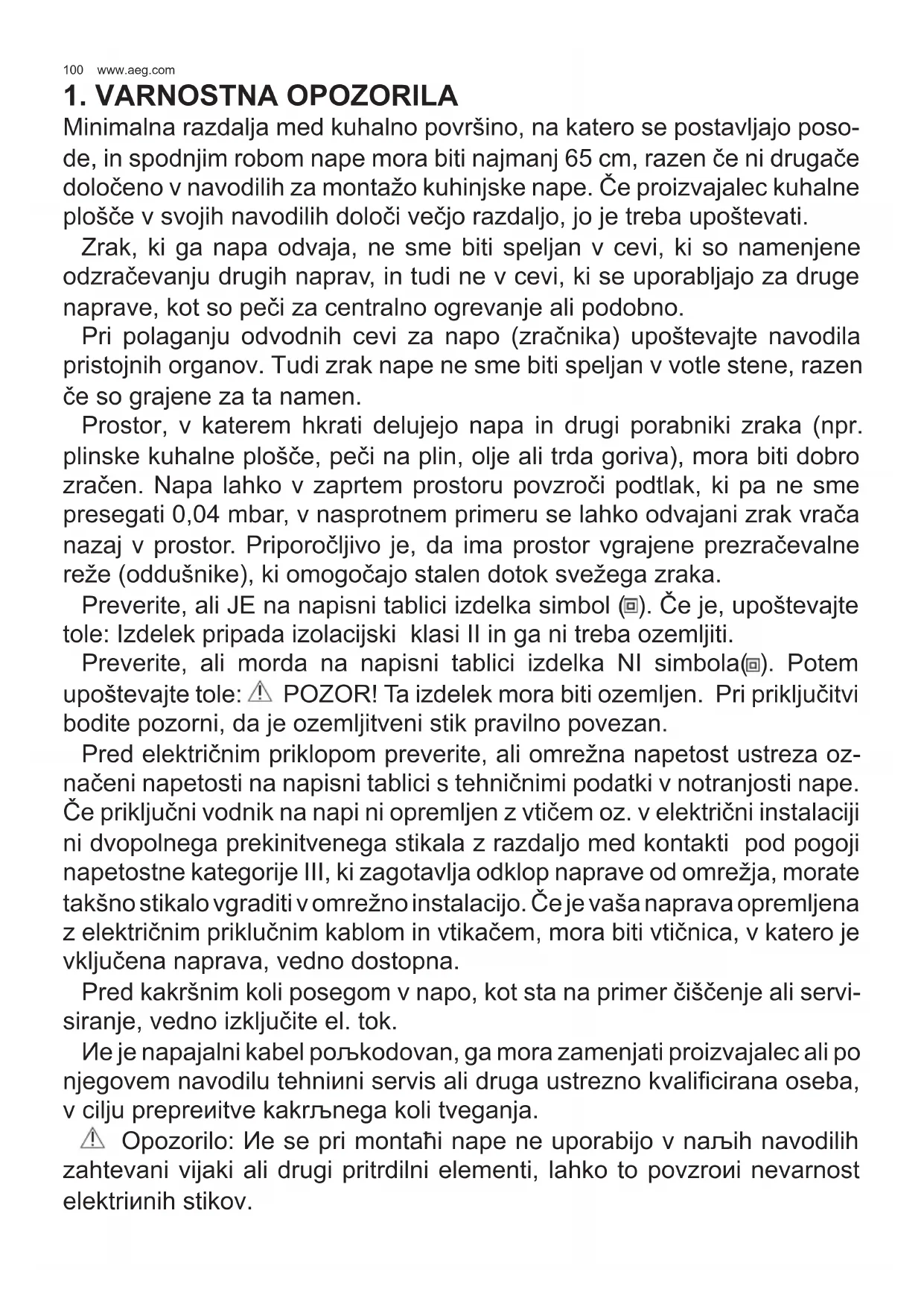 Vedno priporočamo uporabo originalnih rezervnih delov. Kadar se obrnete na pooblaščeni center za pomoč, se prepričajte, ali imate pri roki naslednje podatke: model, šifro izdelka (pnc), serijsko številko. Te informacije se nahajajo na deklaracijski ploščici. Opozorilo/pozor - pomembne varnostne informacije Splošne informacije in nasveti Informacije v zvezi z okoljem Pridržana pravica do sprememb.100 www.aeg.com