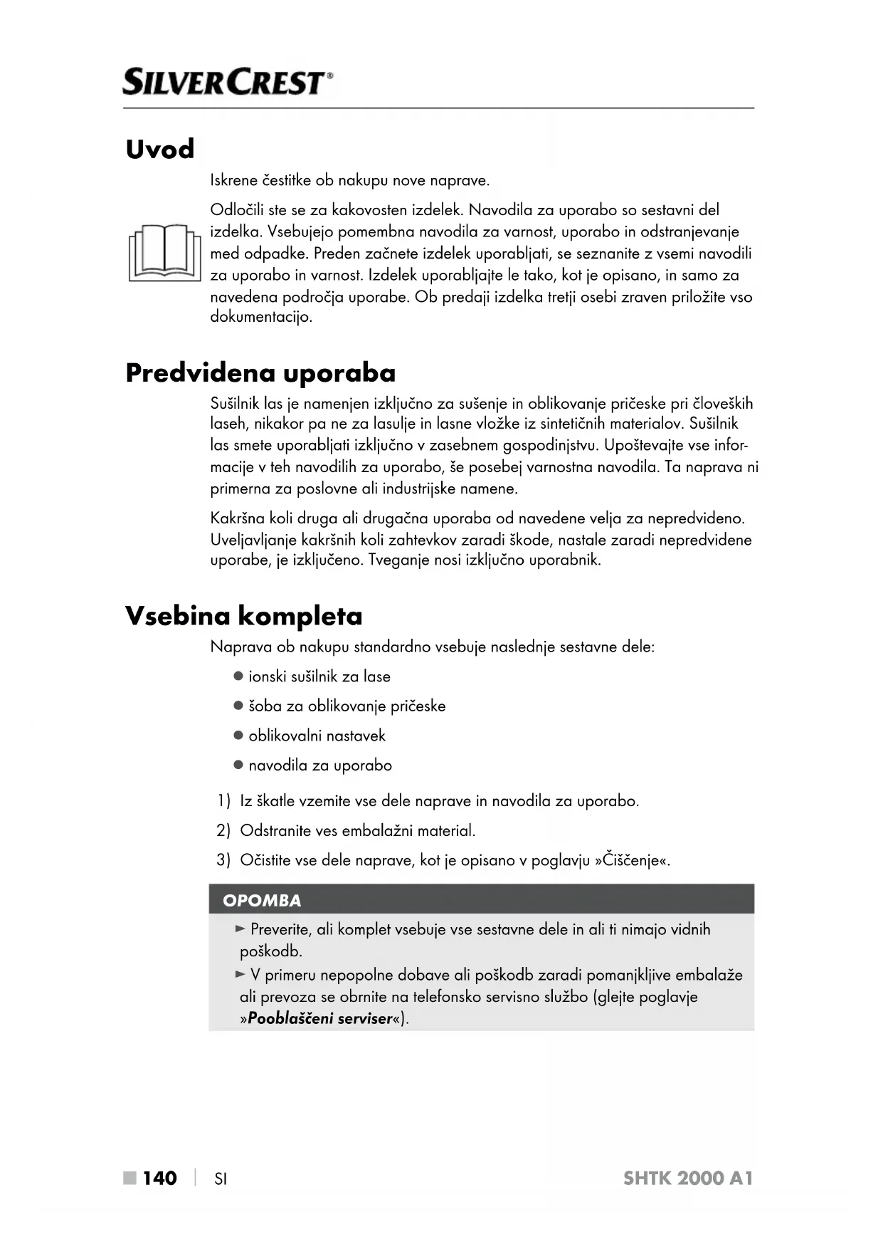 SI SHTK 2000 A1 Uvod Iskrene čestitke ob nakupu nove naprave. Odločili ste se za kakovosten izdelek. Navodila za uporabo so sestavni del izdelka. Vsebujejo pomembna navodila za varnost, uporabo in odstranjevanje med odpadke. Preden začnete izdelek uporabljati, se seznanite z vsemi navodili za uporabo in varnost. Izdelek uporabljajte le tako, kot je opisano, in samo za navedena področja uporabe. Ob predaji izdelka tretji osebi zraven priložite vso dokumentacijo. Predvidena uporaba Sušilnik las je namenjen izključno za sušenje in oblikovanje pričeske pri človeških laseh, nikakor pa ne za lasulje in lasne vložke iz sintetičnih materialov. Sušilnik las smete uporabljati izključno v zasebnem gospodinjstvu. Upoštevajte vse infor- macije v teh navodilih za uporabo, še posebej varnostna navodila. Ta naprava ni primerna za poslovne ali industrijske namene. Kakršna koli druga ali drugačna uporaba od navedene velja za nepredvideno. Uveljavljanje kakršnih koli zahtevkov zaradi škode, nastale zaradi nepredvidene uporabe, je izključeno. Tveganje nosi izključno uporabnik. Vsebina kompleta Naprava ob nakupu standardno vsebuje naslednje sestavne dele: ▯ ionski sušilnik za lase ▯ šoba za oblikovanje pričeske ▯ oblikovalni nastavek ▯ navodila za uporabo
