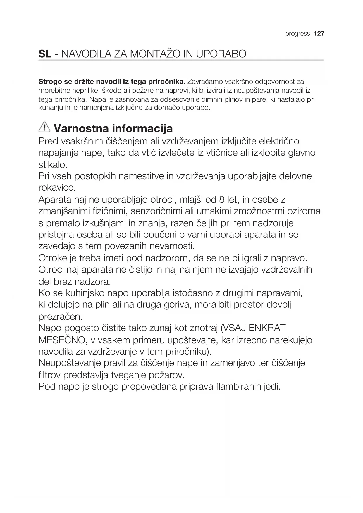 Digestoř je vybavena funkcí pro “bezdrátové” (wireless) připojení k varné desce, pro automatickou regulaci nejvhodnějšího výkonu. Konzultujte návod na použití varné desky a zkontrolujte, zda je varná deska s touto funkcí kompatibilní. V případě prvního zapojení do elektrické sítě nebo při náhlém přerušení dodávky elektrického proudu (blackout) vyčkejte 1 minutu, než se obnoví připojení digestoře k varné desce. Osvětlení Digestoř je vybavena osvětlovacím systémem založeným na technologii DIOD. DIODY zaručují optimální osvětlení, s trvanlivostí až 10 krát delší než tradiční svídtila a umožňují úspory 90% elektrické energie. Pozor! Nedívejte se přímo do LED světla. Pro výměnu žárovek kontaktujte servisní středisko, pověřené prodejem náhradních dílů.progress 127 SL NAVODILA ZA MONTAŽO IN UPORABO Strogo se držite navodil iz tega priročnika. Zavračamo vsakršno odgovornost za morebitne neprilike, škodo ali požare na napravi, ki bi izvirali iz neupoštevanja navodil iz tega priročnika. Napa je zasnovana za odsesovanje dimnih plinov in pare, ki nastajajo pri kuhanju in je namenjena izključno za domačo uporabo. Varnostna informacija Pred vsakršnim čiščenjem ali vzdrževanjem izključite električno napajanje nape, tako da vtič izvlečete iz vtičnice ali izklopite glavno stikalo. Pri vseh postopkih namestitve in vzdrževanja uporabljajte delovne rokavice. Aparata naj ne uporabljajo otroci, mlajši od 8 let, in osebe z zmanjšanimi fizičnimi, senzoričnimi ali umskimi zmožnostmi oziroma s premalo izkušnjami in znanja, razen če jih pri tem nadzoruje pristojna oseba ali so bili poučeni o varni uporabi aparata in se zavedajo s tem povezanih nevarnosti. Otroke je treba imeti pod nadzorom, da se ne bi igrali z napravo. Otroci naj aparata ne čistijo in naj na njem ne izvajajo vzdrževalnih del brez nadzora. Ko se kuhinjsko napo uporablja istočasno z drugimi napravami, ki delujejo na plin ali na druga goriva, mora biti prostor dovolj prezračen. Napo pogosto čistite tako zunaj kot znotraj (VSAJ ENKRAT MESEČNO, v vsakem primeru upoštevajte, kar izrecno narekujejo navodila za vzdrževanje v tem priročniku). Neupoštevanje pravil za čiščenje nape in zamenjavo ter čiščenje filtrov predstavlja tveganje požarov. Pod napo je strogo prepovedana priprava flambiranih jedi.128 progress Varnostna navodila Odprti ogenj je škodljiv za filtre in lahko povzroči požar, zato je uporaba slednjega v vsakem primeru prepovedana. Cvrtje zahteva stalen nadzor, da se pregreto olje ne bi vnelo. Pozor! Med delovanjem kuhalne plošče se dostopni deli nape lahko močno segrejejo. Pri menjavi uporabite le tip žarnice, ki je naveden v poglavju o vzdrževanju/ zamenjavi žarnice v teh navodilih. Pozor! Naprave ne priključujte na električno omrežje, dokler inštalacija ni v celoti zaključena. Kar zadeva tehnične in varnostne ukrepe za odvod dimov, morate strogo upoštevati določbe pristojnih krajevnih organov. Vsesani zrak se ne sme usmerjati v cevovod, ki služi kot odvod za pline, katere proizvajajo naprave, ki delujejo na plin ali druga goriva. Nape ne uporabljajte oziroma je ne puščajte z nepravilno nameščenimi žarnicami, saj obstaja tveganje električnega udara. Nape nikoli ne uporabljajte, če rešetka ni pravilno nameščena! Nape NIKOLI ne uporabljajte kot odlagalne površine, razen če je to izrecno dovoljeno. Za nameščanje izdelka uporabite le priložene pritrdilne vijake. Če jih ni na voljo, pa kupite pravo vrsto vijakov. Uporabite vijake prave dolžine, ki so navedeni v navodilih za namestitev. V primeru dvomov se posvetujte s pooblaščenim servisnim centrom ali s podobno usposobljeno osebo. Pozor! Če pri montaži vijakov in pritrdilnih elementov ne upoštevate teh navodil, obstaja nevarnost električnega udara. Skrb za varstvo okolja Reciklirajte materiale, ki jih označuje simbol . Embalažo odložite v ustrezne zabojnike za reciklažo. Pomagajte zaščititi okolje in zdravje ljudi ter reciklirati odpadke električnih in elektronskih naprav. Naprav, označenih s simbolom , ne odstranjujte z gospodinjskimi odpadki. Izdelek vrnite na krajevno zbirališče za recikliranje ali se obrnite na občinski urad. Uporaba Napa je izdelana za uporabo v odzračevalni izvedbi z zunanjim odvodom , ali v obtočni izvedbi z notranjim kroženjem . Inštalacija Omrežna napetost mora ustrezati napetosti, navedeni na nalepki z lastnostmi, nameščeni v notranjosti nape. Če ima napa vtič, slednjega vstavite v vtičnico, ki je skladna z veljavnimi predpisi in se nahaja na takem mestu, ki bo dostopno tudi po vgradnji naprave. Če napa nima vtiča (neposredna povezava na omrežje) ali se vtič nahaja na takem mestu, ki po vgradnji naprave ne bi bilo dostopno, namestite dvopolno stikalo, skladno s predpisi, ki zagotavlja popoln izklop iz omrežja v pogojih prenapetostnega razreda III, skladno s predpisi o inštalaciji. Pozor! pred ponovnim priklopom tokokroga nape na omrežno napajanje in kontrolo pravilnega delovanja, vselej preverite, ali je omrežni kabel pravilno nameščen.progress 129 Minimalna razdalja med podporno površino posod na kuhalni površini in spodnjim delom nape za kuhinjske prostore ne sme biti manjša od 50cm pri električnih štedilnikih in 65cm pri plinskih ali mešanih štedilnikih. Če je v navodilih za instalacijo plinskega kuhalnika napisana večja razdalja, jo je treba tudi upoštevati. Vzdrževanje Pozor! Pred vsakršnim čiščenjem ali vzdrževanjem izključite električno napajanje nape, tako da vtič izvlečete iz vtičnice ali izklopite glavno stikalo. Napa zahteva pogosto čiščenje, tako zunaj kot znotraj. Za čiščenje uporabljajte krpo, navlaženo s tekočimi nevtralnimi detergenti. Izogibajte se uporabi izdelkov, ki vsebujejo abrazivne snovi. NE UPOBLJAJTE ALKOHOLA! Pozor! Neupoštevanje pravil za čiščenje naprave in zamenjavo filtrov predstavlja tveganje požaro