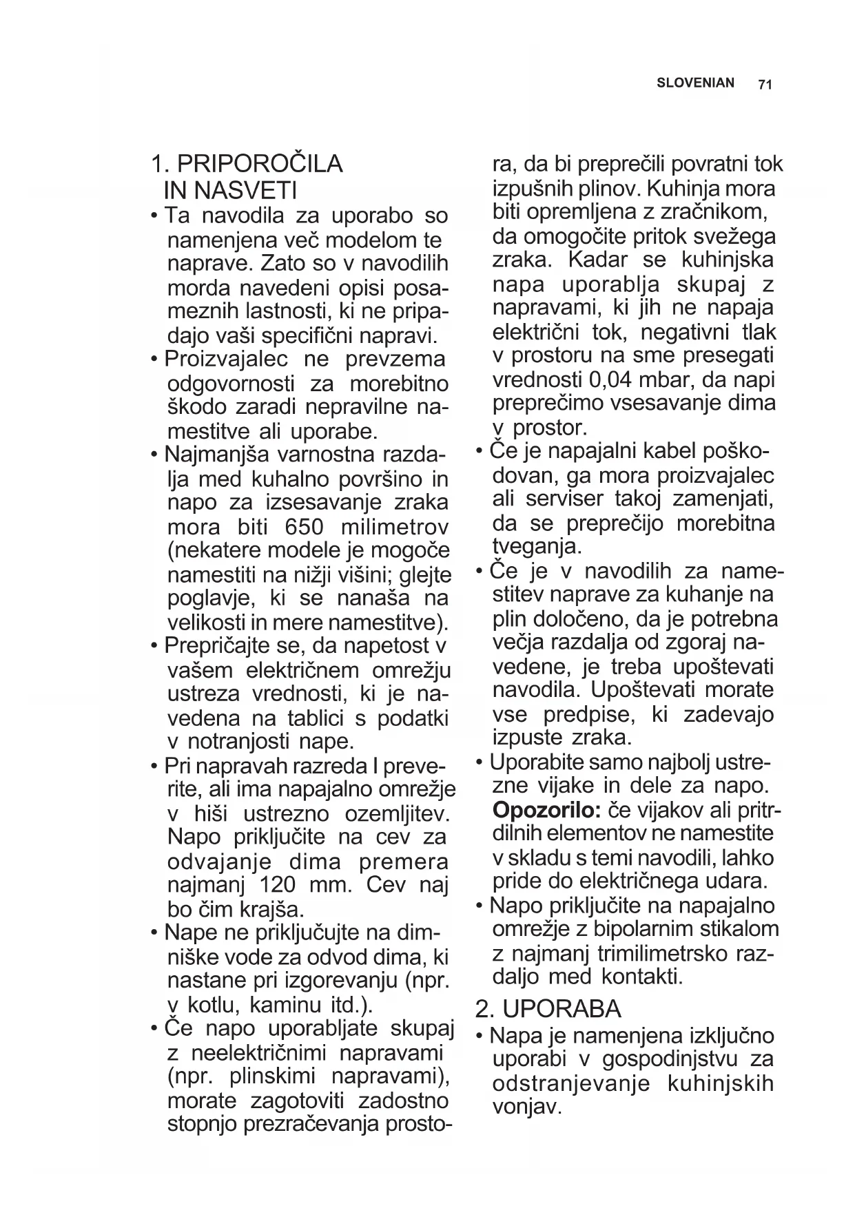 - Če napo uporabljate skupaj z neelektričnimi napravami (npr. plinskimi napravami), morate zagotoviti zadostno stopnjo prezračevanja prosto- ra, da bi preprečili povratni tok izpušnih plinov. Kuhinja mora biti opremljena z zračnikom, da omogočite pritok svežega zraka. Kadar se kuhinjska napa uporablja skupaj z napravami, ki jih ne napaja električni tok, negativni tlak v prostoru na sme presegati vrednosti 0,04 mbar, da napi preprečimo vsesavanje dima v prostor.