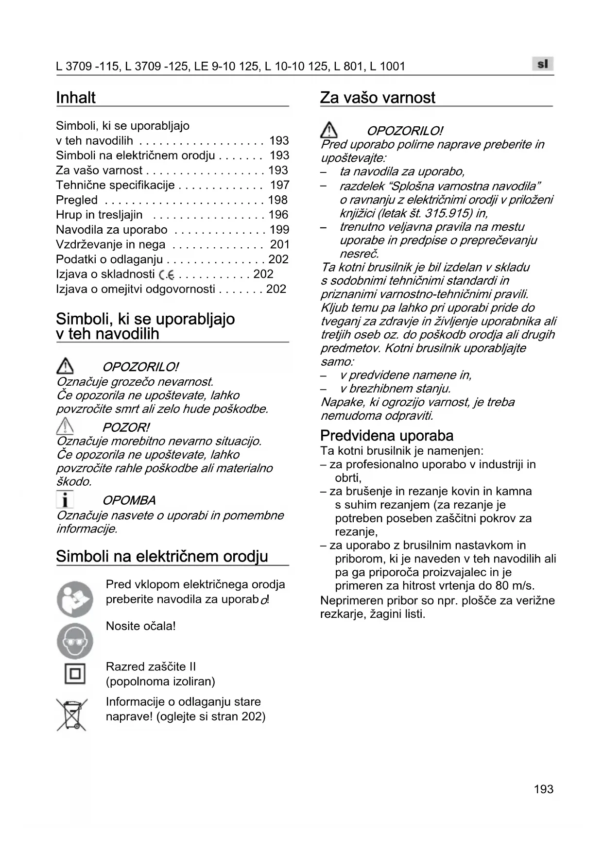 v brezhibnem stanju. Napake, ki ogrozijo varnost, je treba nemudoma odpraviti. Predvidena uporaba Ta kotni brusilnik je namenjen: – za profesionalno uporabo v industriji in obrti, – za brušenje in rezanje kovin in kamna s suhim rezanjem (za rezanje je potreben poseben zaščitni pokrov za rezanje, – za uporabo z brusilnim nastavkom in priborom, ki je naveden v teh navodilih ali pa ga priporoča proizvajalec in je primeren za hitrost vrtenja do 80 m/s. Neprimeren pribor so npr. plošče za verižne rezkarje, žagini listi.L 3709 -115, L 3709 -125, LE 9-10 125, L 10-10 125, L 801, L 1001
