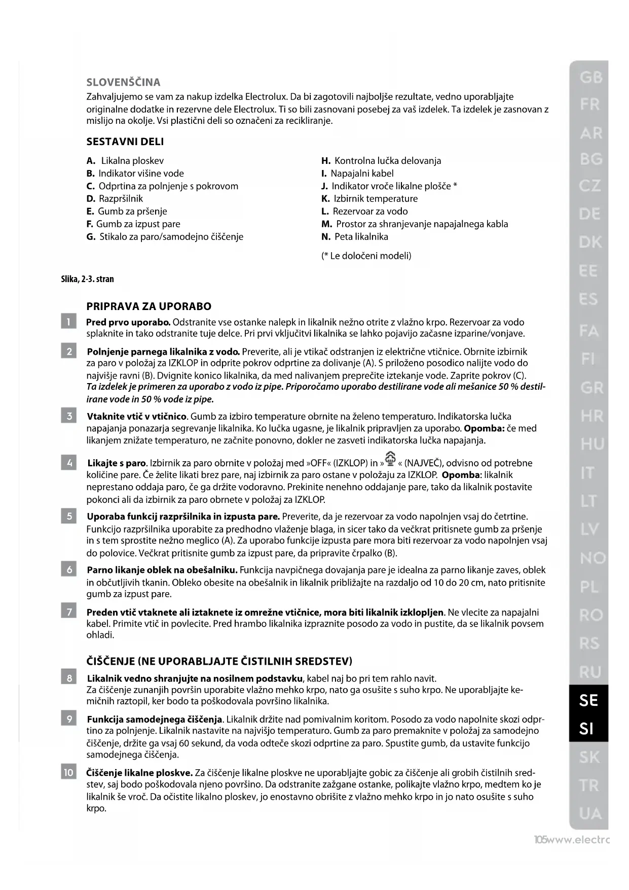 SLOVENŠČINA Zahvaljujemo se vam za nakup izdelka Electrolux. Da bi zagotovili najboljše rezultate, vedno uporabljajte originalne dodatke in rezervne dele Electrolux. Ti so bili zasnovani posebej za vaš izdelek. Ta izdelek je zasnovan z mislijo na okolje. Vsi plastični deli so označeni za recikliranje. SESTAVNI DELI A. Likalna ploskev B. Indikator višine vode C. Odprtina za polnjenje s pokrovom D. Razpršilnik E. Gumb za pršenje F. Gumb za izpust pare G. Stikalo za paro/samodejno čiščenje H. Kontrolna lučka delovanja
