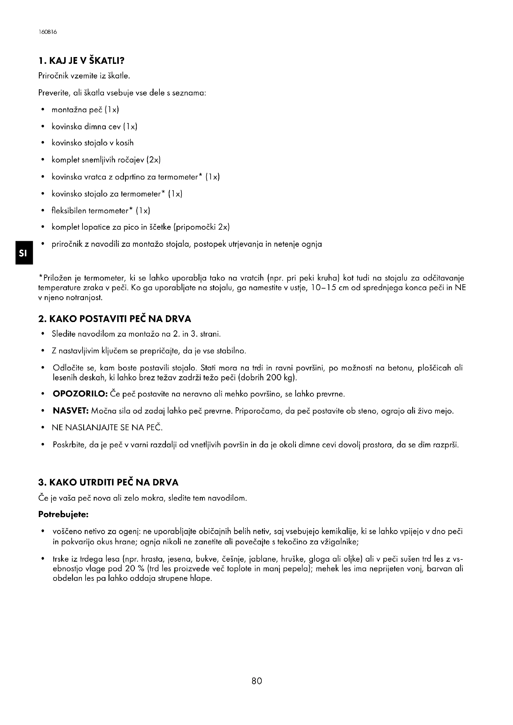 POMEMBNA OPOZORILA PRED NAMESTITVIJO IN UPORABO NAPRAVE PREBERITE VSA NAVODILA NEUPOŠTEVANJE NAVODIL LAHKO POVZROČI MATERIALNO ŠKODO, TELESNE POŠKODBE ALI CELO SMRT SLEDITE navodilom za utrjevanje peči na drva Če navodil za utrjevanje ne upoštevate, lahko peč poškodujete, garancija pa bo prenehala veljati VEDNO poskrbite, da so otroci in hišni ljubljenčki med uporabo peči na drva in po njej v varni razdalji od peči Priporočamo, da otroci, mlajši od 16 let, peč uporabljajo le pod nadzorom VEDNO poskrbite, da peč stoji na ravni površini Stojalo se NE SME nagibati Zasnove in specifikacij proizvajalca peči na drva nikakor NE spreminjajte Peči na drva NE uporabljajte v zaprtem prostoru Dimne cevi NE blokirajte UPORABLJAJTE SAMO neobdelan, dobro staran, suh trd les z vsebnostjo vlage, manjšo od 20 % V peči na drva NE kurite odpadkov Za netenje in vzdrževanje ognja nikoli NE uporabljajte vnetljivih tekočin ali goriv (npr tekočin za netenje ognja, bencina, dizelskega goriva, kerozina, olja in drugih vnetljivih kemičnih spojin) Pri izredno visokih notranjih temperaturah bodite PREVIDNI. Ustje in notranjost peči na drva se ZELO segrejeta, zato bodite pri uporabi previdni Zlasti pri dolgotrajni uporabi priporočamo, da temperatura zraka v peči ni višja od 350°C Pri tej temperaturi bo temperatura gline na dnu in v kupoli verjetno nad 450°C Med uporabo peči na drva in po njej NE segajte v peč z nezaščitenimi rokami Če se pojavijo opekline ali oparine, roke takoj potopite v mrzlo vodo in poiščite zdravniško pomoč POSKRBITE, da lonce ter druge pripomočke prijemate z dolgimi kuhinjskimi rokavicami in bodite pri tem previdni Med uporabo peči na drva in po njej iz peči NE vzemite gorečih polen ali žerjavice Peč NE sme biti preveč mokra Če postane mokra, sledite navodilom za utrjevanje in jo pred uporabo ustrezno posušite Ognja v peči na drva NE smete zmanjšati ali pogasiti z vodo, razen v nujnih primerih ZAGOTOVITE, da so vsi pripomočki, materiali, lonci in ponve, ki jih uporabljate v peči na drva, primerni za visoke temperature nad 450°C Pepel ODVRZITE v ustrezen smetnjak, ga stresite na kompost ali ga potresite po vrtu kot hranilo Poskrbite, da ne vdihavate pepela ali prahu TA NAVODILA SHRANITE IN JIH IMEJTE VEDNO PRI ROKI, DA SI JIH LAHKO PREBERETE. 160816SI