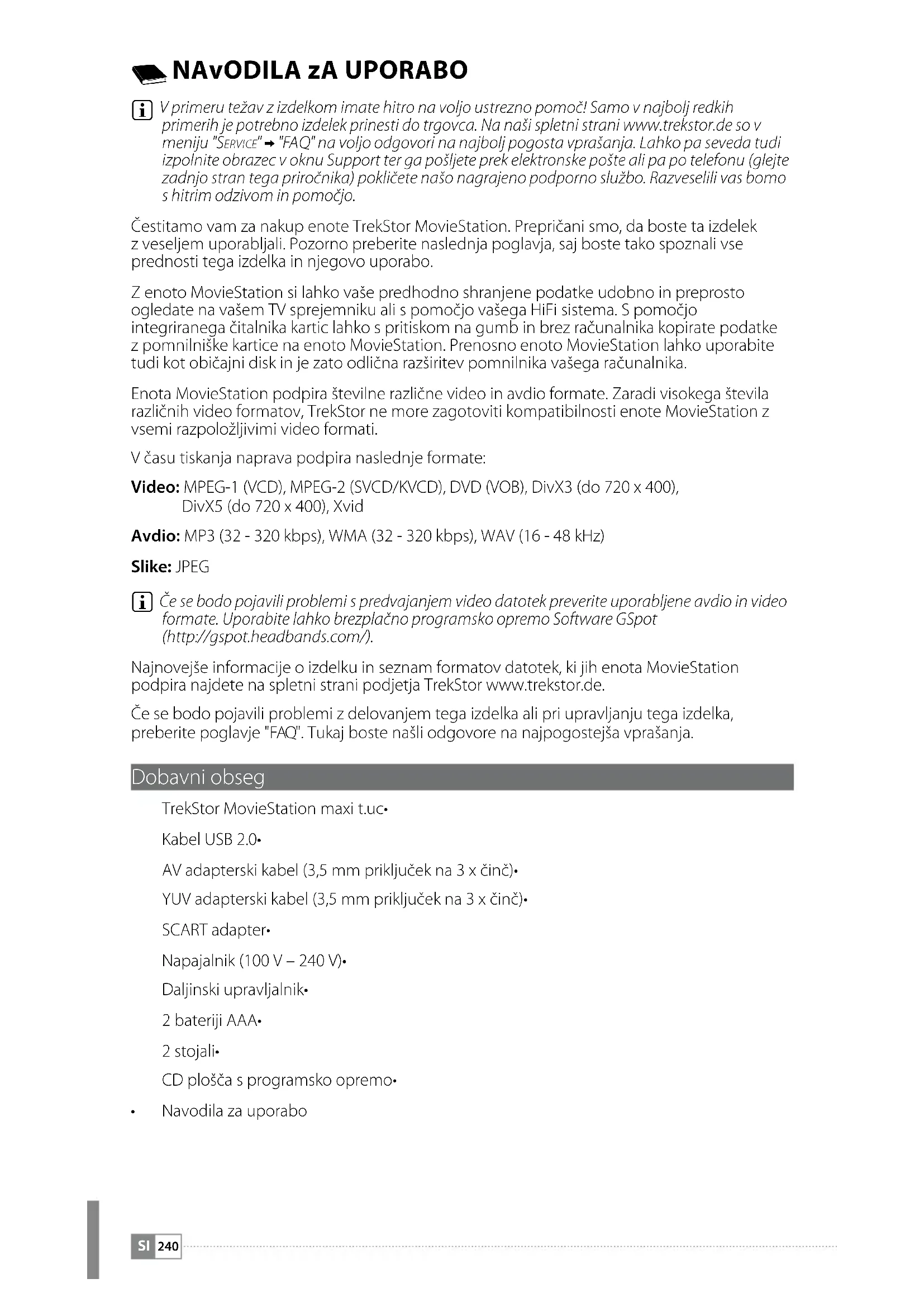 V primeru težav z izdelkom imate hitro na voljo ustrezno pomoč! Samo v najbolj redkih primerih je potrebno izdelek prinesti do trgovca. Na naši spletni strani www.trekstor.de so v meniju "Se r v i c e " + "FAQ" na voljo odgovori na najbolj pogosta vprašanja. Lahko pa seveda tudi izpolnite obrazec v oknu Support ter ga pošljete prek elektronske pošte ali pa po telefonu (glejte zadnjo stran tega priročnika) pokličete našo nagrajeno podporno službo. Razveselili vas bomo s hitrim odzivom in pomočjo. Čestitamo vam za nakup enote TrekStor MovieStation. Prepričani smo, da boste ta izdelek z veseljem uporabljali. Pozorno preberite naslednja poglavja, saj boste tako spoznali vse prednosti tega izdelka in njegovo uporabo. Z enoto MovieStation si lahko vaše predhodno shranjene podatke udobno in preprosto ogledate na vašem TV sprejemniku ali s pomočjo vašega HiFi sistema. S pomočjo integriranega čitalnika kartic lahko s pritiskom na gumb in brez računalnika kopirate podatke z pomnilniške kartice na enoto MovieStation. Prenosno enoto MovieStation lahko uporabite tudi kot običajni disk in je zato odlična razširitev pomnilnika vašega računalnika. Enota MovieStation podpira številne različne video in avdio formate. Zaradi visokega števila različnih video formatov, TrekStor ne more zagotoviti kompatibilnosti enote MovieStation z vsemi razpoložljivimi video formati. V času tiskanja naprava podpira naslednje formate: Video: MPEG-1 (VCD), MPEG-2 (SVCD/KVCD), DVD (VOB), DivX3 (do 720 x 400), DivX5 (do 720 x 400), Xvid Avdio: MP3 (32 - 320 kbps), WMA (32 - 320 kbps), WAV (16 - 48 kHz) Slike: JPEG