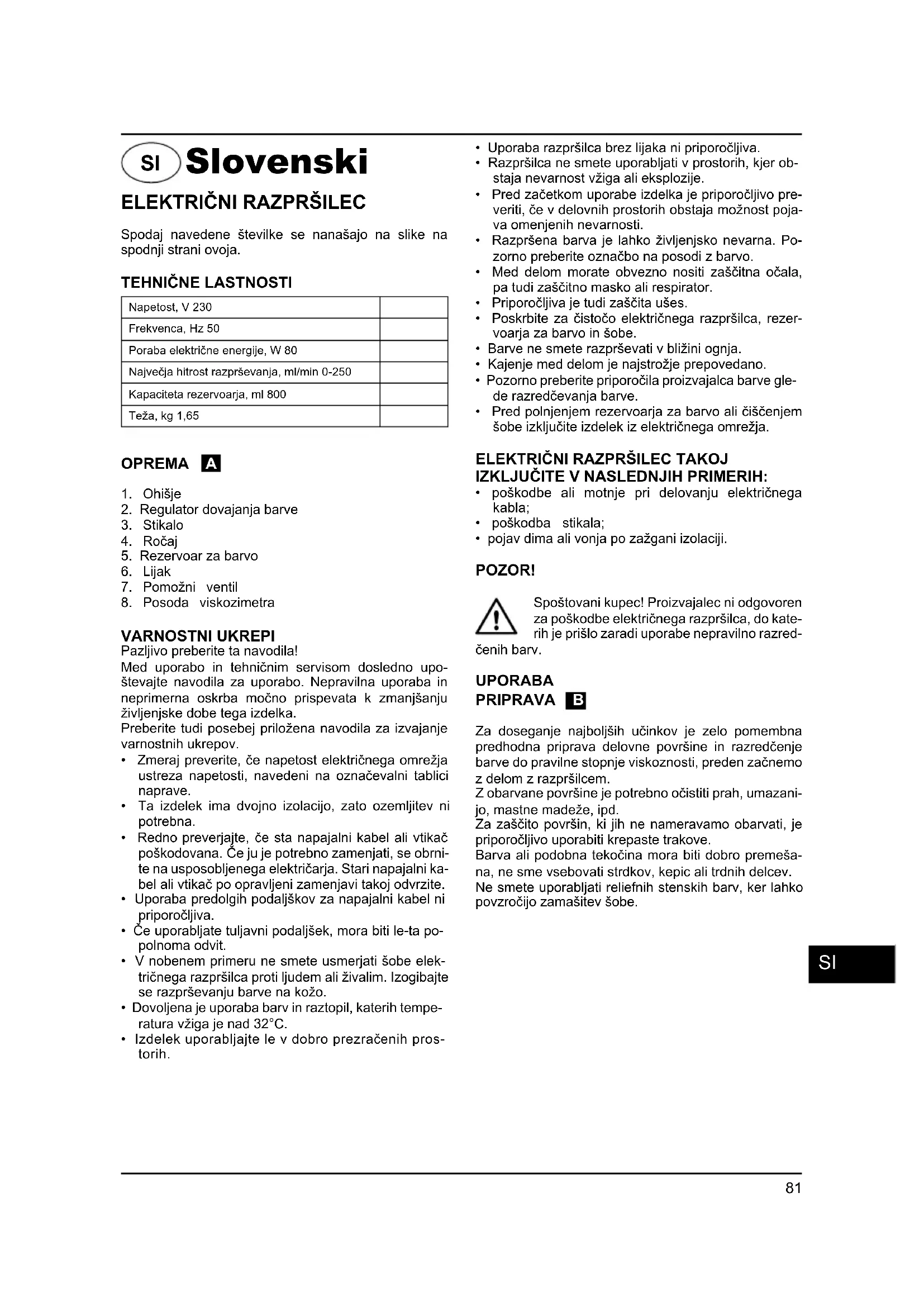 Napetost, V 230Frekvenca, Hz 50Poraba električne energije, W 80Največja hitrost razprševanja, ml/min 0-250Kapaciteta rezervoarja, ml 800Teža, kg 1,65 OPREMA A