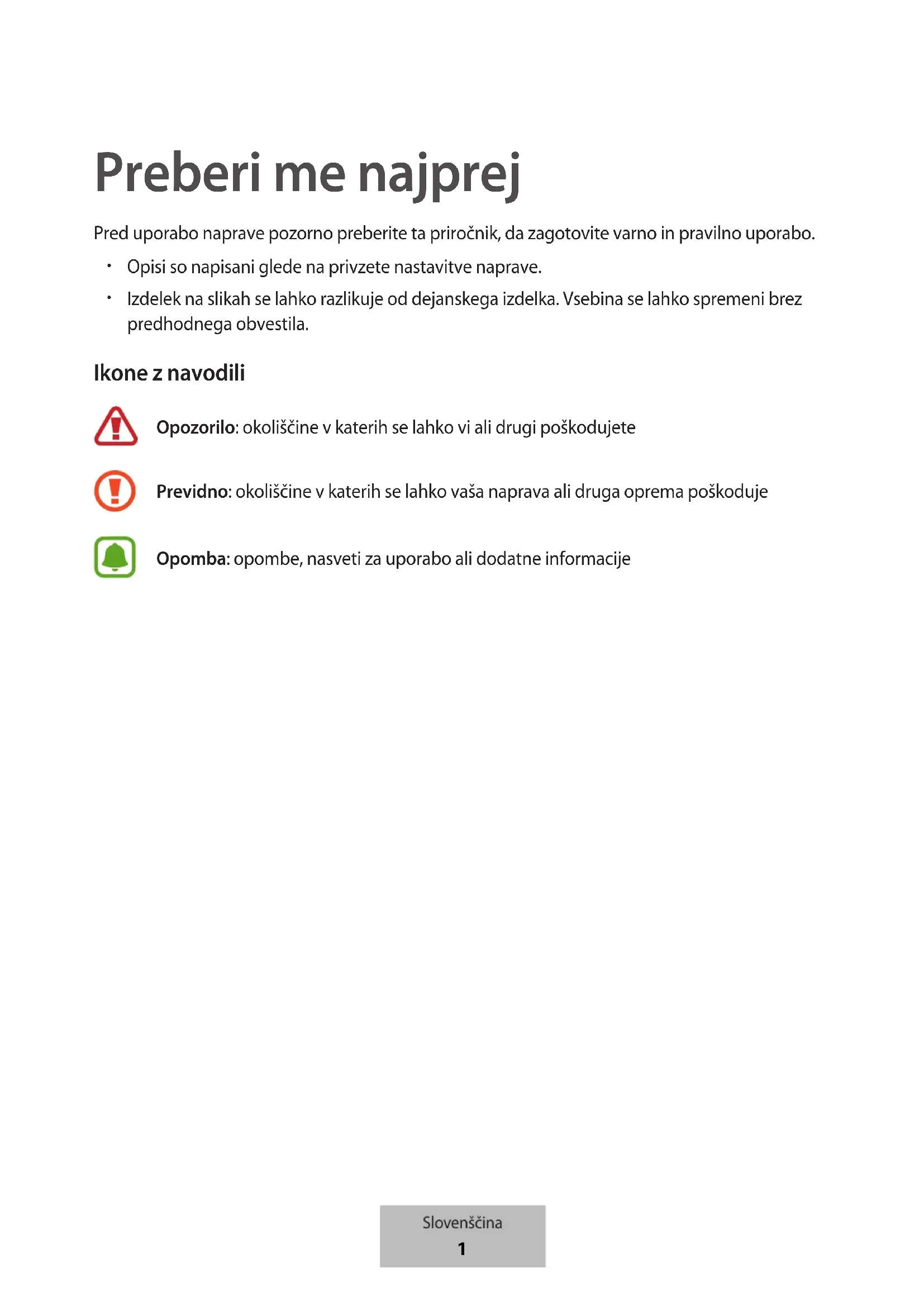 Izdelek na slikah se lahko razlikuje od dejanskega izdelka. Vsebina se lahko spremeni brez predhodnega obvestila. Ikone z navodili Opozorilo: okoliščine v katerih se lahko vi ali drugi poškodujete Previdno: okoliščine v katerih se lahko vaša naprava ali druga oprema poškoduje Opomba: opombe, nasveti za uporabo ali dodatne informacije Slovenščina