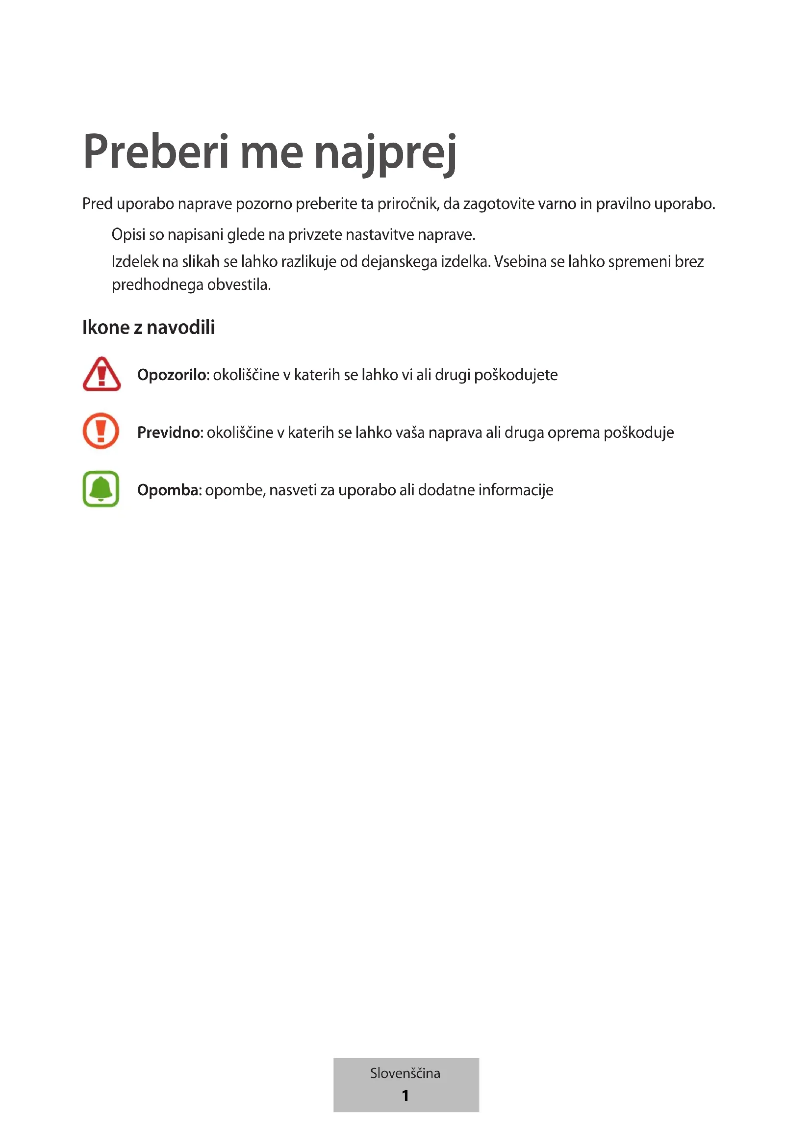 Izdelek na slikah se lahko razlikuje od dejanskega izdelka. Vsebina se lahko spremeni brez predhodnega obvestila. Ikone z navodili Opozorilo: okoliščine v katerih se lahko vi ali drugi poškodujete Previdno: okoliščine v katerih se lahko vaša naprava ali druga oprema poškoduje Opomba: opombe, nasveti za uporabo ali dodatne informacije Slovenščina
