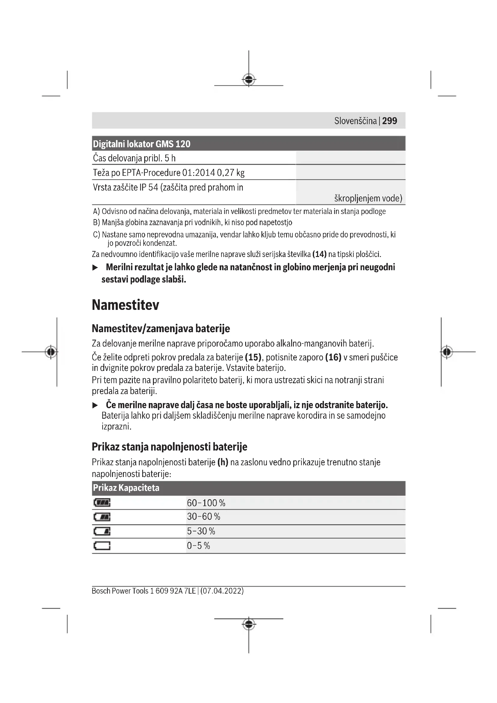 Baterija 1×9V6LR61 1 609 92A 7LE | (07.04.2022) Bosch Power ToolsSlovenščina | 299 Digitalni lokator GMS 120 Čas delovanja pribl. 5h Teža po EPTA-Procedure01:2014 0,27kg Vrsta zaščite IP 54 (zaščita pred prahom in škropljenjem vode) A) Odvisno od načina delovanja, materiala in velikosti predmetov ter materiala in stanja podloge B) Manjša globina zaznavanja pri vodnikih, ki niso pod napetostjo C) Nastane samo neprevodna umazanija, vendar lahko kljub temu občasno pride do prevodnosti, ki jo povzroči kondenzat. Za nedvoumno identifikacijo vaše merilne naprave služi serijska številka (14) na tipski ploščici. u Merilni rezultat je lahko glede na natančnost in globino merjenja pri neugodni sestavi podlage slabši. Namestitev Namestitev/zamenjava baterije Za delovanje merilne naprave priporočamo uporabo alkalno-manganovih baterij. Če želite odpreti pokrov predala za baterije(15), potisnite zaporo(16) v smeri puščice in dvignite pokrov predala za baterije. Vstavite baterijo. Pri tem pazite na pravilno polariteto baterij, ki mora ustrezati skici na notranji strani predala za bateriji. u Če merilne naprave dalj časa ne boste uporabljali, iz nje odstranite baterijo. Baterija lahko pri daljšem skladiščenju merilne naprave korodira in se samodejno izprazni. Prikaz stanja napolnjenosti baterije Prikaz stanja napolnjenosti baterije(h) na zaslonu vedno prikazuje trenutno stanje napolnjenosti baterije: Prikaz Kapaciteta 60−100% 30−60% 5−30% 0−5% Bosch Power Tools 1 609 92A 7LE | (07.04.2022)300 | Slovenščina Delovanje u Merilno napravo zavarujte pred vlago in neposrednim sončnim sevanjem. u Merilne naprave ne izpostavljajte ekstremnim temperaturam ali temperaturnim nihanjem. Pri večjih temperaturnih nihanjih počakajte, da se temperatura ustali, šele nato vklopite napravo. Ekstremne temperature ali temperaturna nihanja lahko negativno vplivajo na natančnost merilnega orodja in prikaz na prikazovalniku. u Preprečite močne udarce ali padec merilne naprave. Po izrazitih zunanjih vplivih ali če opazite težave v delovanju merilne naprave, predajte merilno napravo v pregled pooblaščenemu servisu Bosch. u Odvisno od načina lahko različne okoliščine negativno vplivajo na točnost merilnih rezultatov. Med njih sodijo npr. bližina naprav, ki proizvajajo močna električna, magnetna ali elektromagnetna polja, mokrota, konstrukcijski materiali, ki vsebujejo kovine, z aluminijem prekrito izolacijo ali prevodne tapete ali ploščice. Zato pred vrtanjem, žaganjem ali rezkanjem v stene, strope ali tla upoštevajte tudi druge vire informacij (npr. gradbene načrte). u Merilno napravo držite le za predvideno oprijemalno površino(8), da se izognete vplivom na meritev. u Na območje senzorja(13) na zadnji strani merilne naprave ne nameščajte nalepk ali oznak. Predvsem kovinske tablice vplivajo na rezultate meritev. Med merjenjem ne nosite rokavic in pazite na zadostno ozemljitev. Če ozemljitev ni primerna, lahko prepoznavanje električnih vodnikov ne deluje pravilno. Ne merite v bližini naprav, ki oddajajo močna električna, magnetna ali elektromagnetna polja. Po možnosti pri vseh napravah, ki lahko vplivajo na merjenje, izklopite ustrezne funkcije ali pa jih izklopite v celoti. Uporaba Vklop/izklop u Pred vklopom merilne naprave se prepričajte, da območje senzorja(13) ni vlažno. Po potrebi merilno napravo osušite s krpo. u Če je bilo merilno orodje izpostavljeno močnim temperaturnim spremembam, pred vklopom počakajte, da se temperatura izravna. Za vklop merilne naprave pritisnite tipko za vklop/izklop(5). 1 609 92A 7LE | (07.04.2022) Bosch Power ToolsSlovenščina | 301 Za izklop merilne naprave pritisnite tipko za vklop/izklop(5). Če v pribl.5min ne pritisnete nobene tipke na merilni napravi ali zaznate predmetov, se merilna naprava zaradi varčevanja z baterijo samodejno izklopi. Vklop/izklop osvetlitve zaslona S tipko za osvetlitev zaslona(6) lahko vklopite in izklopite osvetlitev zaslona. Vklop/izklop zvočnega signala S tipko za zvočni signal(7) lahko zvočni signal vklopite ali izklopite. Če je zvočni signal izklopljen, se na zaslonu pojavi prikaz za zvočni signal(a). Delovanje (glejteslikoB) Merilna naprava pregleduje podlago pod območjem senzorja(13) v smeri merjenja A do največje globine zaznavanja. Zazna predmete, ki se razlikujejo od materiala stene. Merilno napravo pomaknite v ravni črti v smeri B po steni. Merilno napravo prek podlage vedno premikajte z rahlim pritiskom, ne da bi jo privzdigovali ali spreminjali pritisno silo. Med merjenjem morajo ostati drsniki(12) vedno v stiku s površino. Merjenje Merilno napravo postavite na površino, ki jo želite preiskati, in jo pomaknite v smeri B. – Če se merilna naprava približa predmetu, se odklon na prikazu meritev(i) poveča, svetlobni obroč(1) pa zasveti rumeno. – Če se merilna naprava oddalji od predmeta, se odklon zmanjša. – Nad sredino predmeta ima prikaz meritev največji odklon; svetlobni obroč(1) zasveti rdeče in zasliši se zvočni signal. Pri manjših ali globlje ležečih predmetih lahko svetlobni obroč(1) še naprej sveti rumeno in zvočnega signala ni. u Svetlobni obroč oz. zvočni signal ne prikaže širših predmetov v celoti. Za natančnejšo določitev lege predmeta merilno napravo večkrat (3-krat) povlecite čez predmet sem in tja. V vseh načinih delovanja se samodejno vklopi fino merilo(j). Fino merilo prikazuje popoln odklon, če je predmet na sredini senzorja ali je na prikazu meritev(i) dosežen največji možni odklon. Poleg tega v načinih delovanja za suho gradnjo in kovine sveti tudi prikaz sredine predmetaCENTER(k). Širše predmete v podlagi prepoznate po dalj časa trajajočem in večjem odklonu prikaza meritev(i) in finega merila(j). Svetlobni obroč(1) sveti rumeno. Čas trajanja visokega odklona približno ustreza širini predmeta. Bosch Power Tools 1 609 92A 7LE | (07.04.2022)302 | Slovenščina Če iščete zelo majhne ali globoko lež