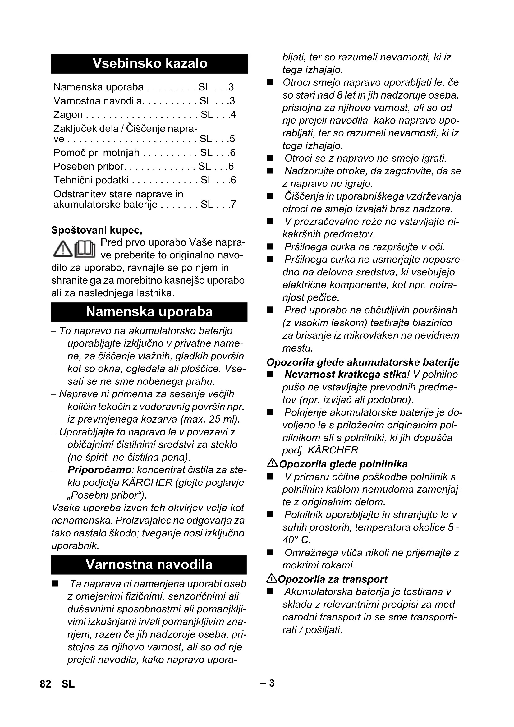 ěrka, široká (2 Artikl) Objednací č.: 2.633-005.0 Stěrka, úzká (2 kusy) Objednací č.: 2.633-104.0 Technické změny vyhrazeny. Uložení přístroje Pomoc při poruchách Postřikovací láhev nepostřikuje Zařízení se nerozbíhá Pruhy při čištění Voda vytéká z větracích štěrbin Zvláštní příslušenství Technické údaje Ochrana IP X4 Objem zásobníku na zne- čištěnou vodu. 100 ml Provozní doba při plně nabitém akumulátoru 20 min Jmenovité napětí akumu- látoru 3,6 V Jmenovitý výkon zařízení 12 W Doba nabíjení vybitého akumulátoru 2 hod. Výstupní napětí nabíječky 5,5 V Výstupní proud nabíječky 600 mA Hladina akustického tlaku (EN 60704-2-1) 54 dB(A) Hmotnost 0,7 kg Typ akumulátoru Li-Ion 80 CS– 7 Toto zařízení obsahuje zabudovaný aku- mulátor, který je třeba před likvidací staré- ho zařízení vymontovat. Riziko zkratu Nedotýkejte se kontaktů ani vedení. Nebezpečí výbuchu Akumulátory nevystavujte silnému slu- nečnímu záření, teplu ani ohni. Nebezpečí zranění při zkratu, po- leptání žíravinou nebo při úniku dráždivých výparů Neotvírejte akumulátor. Přístroj smí být otevřen pouze z důvodu odstranění akumulátoru. Vyjměte akumulátor a ekologicky jej zlikvidujte (ve sběrně nebo v prodejně). Starý přístroj a akumulátor zlikvidujte Vymontujte akumulátor a zlikvidujte jej 81CS– 3 Spoštovani kupec, Pred prvo uporabo Vaše napra- ve preberite to originalno navo- dilo za uporabo, ravnajte se po njem in shranite ga za morebitno kasnejšo uporabo ali za naslednjega lastnika. – To napravo na akumulatorsko baterijo uporabljajte izključno v privatne name- ne, za čiščenje vlažnih, gladkih površin kot so okna, ogledala ali ploščice. Vse- sati se ne sme nobenega prahu. – Naprave ni primerna za sesanje večjih količin tekočin z vodoravnig površin npr. iz prevrnjenega kozarva (max. 25 ml). – Uporabljajte to napravo le v povezavi z običajnimi čistilnimi sredstvi za steklo (ne špirit, ne čistilna pena). – Priporočamo: koncentrat čistila za ste- klo podjetja KÄRCHER (glejte poglavje „Posebni pribor“). Vsaka uporaba izven teh okvirjev velja kot nenamenska. Proizvajalec ne odgovarja za tako nastalo škodo; tveganje nosi izključno uporabnik. Ta naprava ni namenjena uporabi oseb z omejenimi fizičnimi, senzoričnimi ali duševnimi sposobnostmi ali pomanjklji- vimi izkušnjami in/ali pomanjkljivim zna- njem, razen če jih nadzoruje oseba, pri- stojna za njihovo varnost, ali so od nje prejeli navodila, kako napravo upora- bljati, ter so razumeli nevarnosti, ki iz tega izhajajo. Otroci smejo napravo uporabljati le, če so stari nad 8 let in jih nadzoruje oseba, pristojna za njihovo varnost, ali so od nje prejeli navodila, kako napravo upo- rabljati, ter so razumeli nevarnosti, ki iz tega izhajajo. Otroci se z napravo ne smejo igrati. Nadzorujte otroke, da zagotovite, da se z napravo ne igrajo. Čiščenja in uporabniškega vzdrževanja otroci ne smejo izvajati brez nadzora. V prezračevalne reže ne vstavljajte ni- kakršnih predmetov. Pršilnega curka ne razpršujte v oči. Pršilnega curka ne usmerjajte neposre- dno na delovna sredstva, ki vsebujejo električne komponente, kot npr. notra- njost pečice. Pred uporabo na občutljivih površinah (z visokim leskom) testirajte blazinico za brisanje iz mikrovlaken na nevidnem mestu. Opozorila glede akumulatorske baterije Nevarnost kratkega stika! V polnilno pušo ne vstavljajte prevodnih predme- tov (npr. izvijač ali podobno). Polnjenje akumulatorske baterije je do- voljeno le s priloženim originalnim pol- nilnikom ali s polnilniki, ki jih dopušča podj. KÄRCHER. Opozorila glede polnilnika V primeru očitne poškodbe polnilnik s polnilnim kablom nemudoma zamenjaj- te z originalnim delom. Polnilnik uporabljajte in shranjujte le v suhih prostorih, temperatura okolice 5 - 40° C. Omrežnega vtiča nikoli ne prijemajte z mokrimi rokami. 몇 Opozorila za transport Akumulatorska baterija je testirana v skladu z relevantnimi predpisi za med- narodni transport in se sme transporti- rati / pošiljati. Vsebinsko kazalo Namenska uporaba . . . . . . . . . SL . . .3 Varnostna navodila. . . . . . . . . . SL . . .3 Zagon . . . . . . . . . . . . . . . . . . . . SL . . .4 Zaključek dela / Čiščenje napra- ve . . . . . . . . . . . . . . . . . . . . . . . SL . . .5 Pomoč pri motnjah . . . . . . . . . . SL . . .6 Poseben pribor. . . . . . . . . . . . . SL . . .6 Tehnični podatki . . . . . . . . . . . . SL . . .6 Odstranitev stare naprave in akumulatorske baterije . . . . . . . SL . . .7 Namenska uporaba Varnostna navodila 82 SL– 4 Embalažo je mogoče reciklirati. Pro- simo, da embalaže ne odlagate med gospodinjski odpad, pač pa jo oddajte v po- novno predelavo. Stare naprave vsebujejo dragocene reciklirne materiale in snovi, ki ne smejo priti v okolje. Naprave in aku- mulatorske baterije v njej se zato ne sme zavreči preko gospodinjskih odpadkov. Med odpadke ju lahko brezplačno odstrani- te preko lokalno razpoložljivih sistemov vračanja in zbirnih sistemov. Opozorila k sestavinam (REACH) Aktualne informacije o sestavinah najdete na: www.kaercher.com/REACH Nevarnost Za neposredno grozečo nevarnost, ki vodi do težkih telesnih poškodb ali smrti. 몇 Opozorilo Za možno nevarno situacijo, ki bi lahko vo- dila do težkih telesnih poškodb ali smrti. Pozor Za možno nevarno situacijo, ki lahko vodi do lahkih poškodb ali materialne škode. Pri razpakiranju preverite ali v vsebini pake- ta manjka pribor oz. ali obstajajo poškodbe. V primeru transportnih poškodb obvestite svojega prodajalca. Slike glejte na strani 2 Slika 1 Polnilnik s polnilnim kablom 2 Osnovna naprava 3 Polnilna puša 4 Indikator polnjenja / delovanja 5 Nogice 6Ročaj 7 Stikalo na stroju (ON/OFF) 8 Rezervoar za umazano vodo, snemljiv 9 Zapiralo, rezervoar za umazano vodo 10 Ločilnik 11 Deblokada, ločilnik 12 Nastavek z brisalci, širok 13 Nastavek z