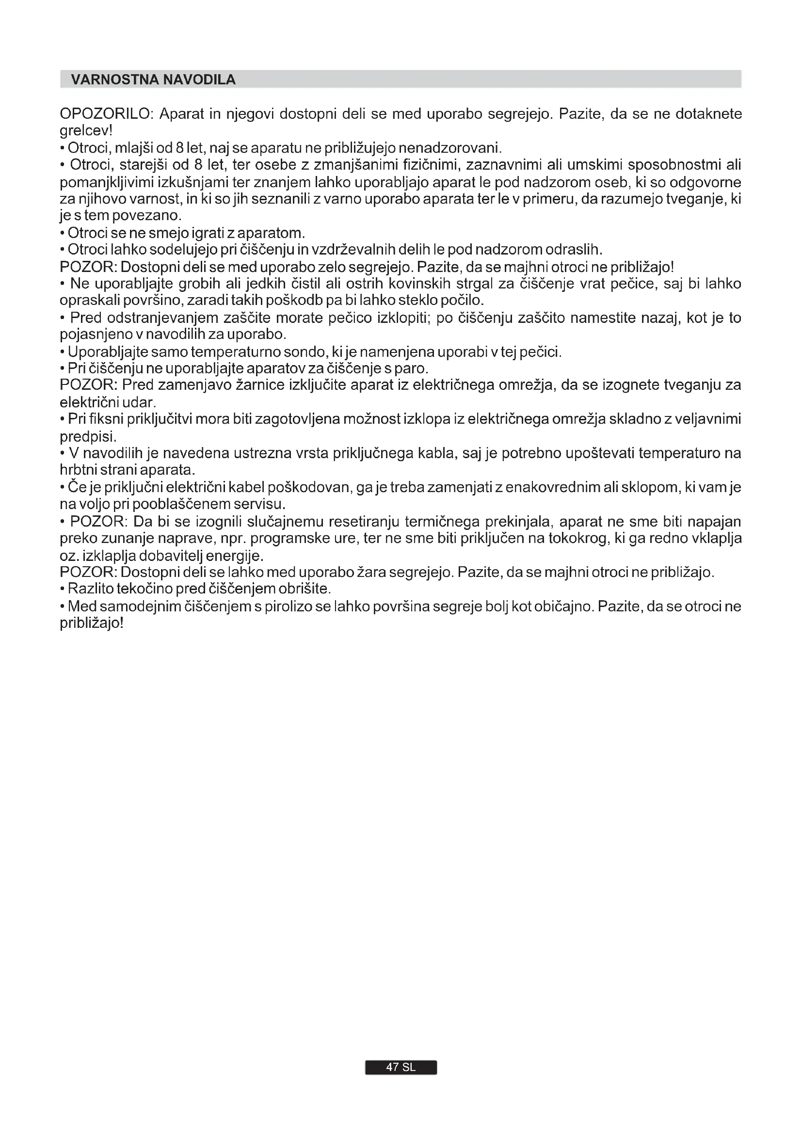 - Med samodejnim čiščenjem s pirolizo se lahko površina segreje bolj kot običajno. Pazite, da se otroci ne približajo! VARNOSTNA NAVODILA 47 SLDeli aparata, ki prihajajo v stik z živili, so izdelani skladno z določili, navedenimi v direktivi 89/106. Z oznako na tem proizvodu izjavljamo, na lastno odgovornost, da je proizvod skladen z vsemi evropskimi zahtevami o varnosti, zdravju in varstvu okolja, ki se v zakonodaji nanašajo na ta izdelek.