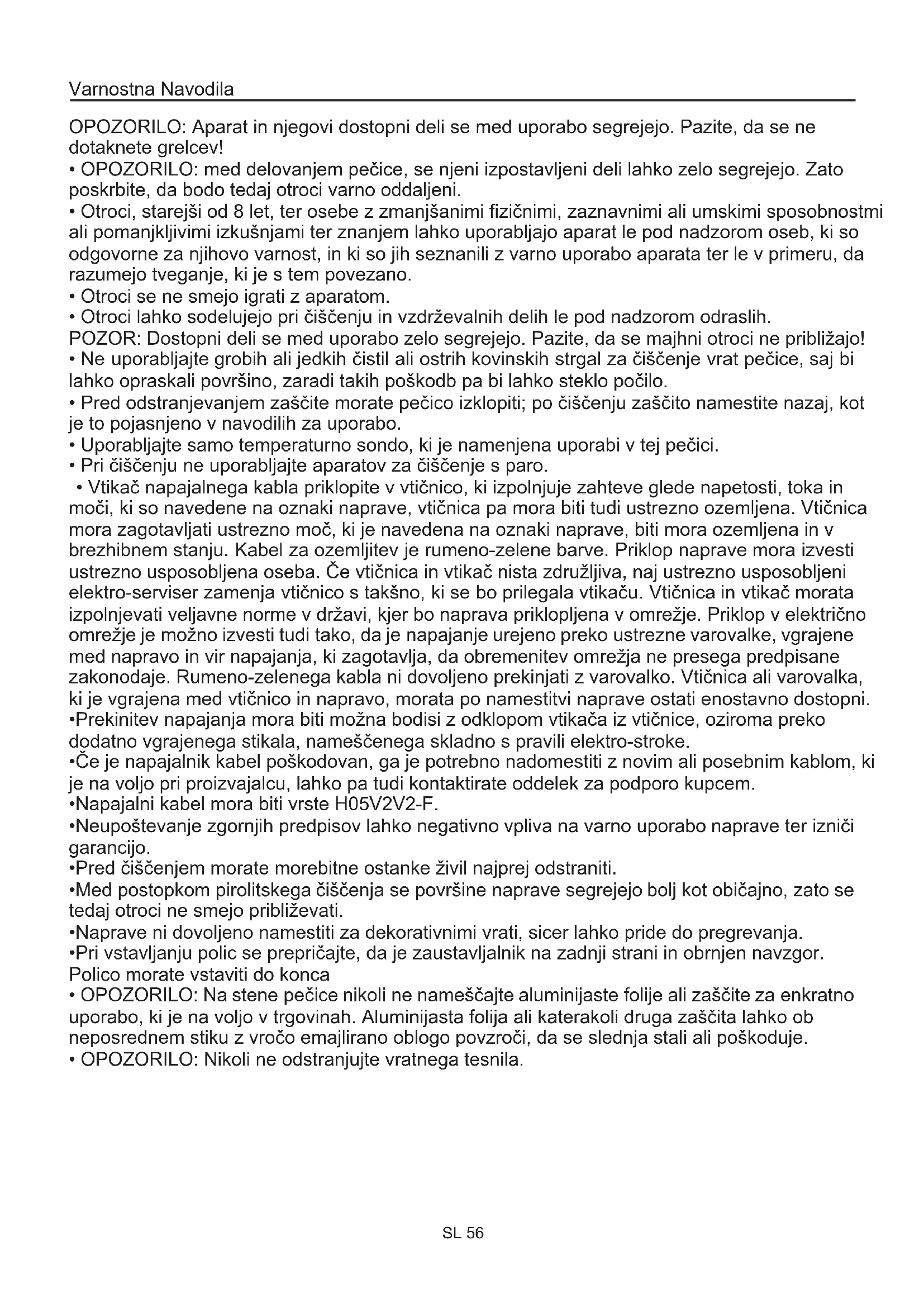 Povzetek SL 57Pozorno preberite navodila, da boste lahko izrabili vse možnosti, ki vam jih ponuja pečica. Priporočamo, da navodila za priključitev in uporabo shranite. Pred vgradnjo pečice si zapišite serijsko številko, saj jo boste potrebovali, ko boste potrebovali pomoč pooblaščenega servisa. Ko dobite svojo novo pečico, se najprej prepričajte, da med transportom ni prišlo do poškodb. Če je pečica poškodovana, se takoj obrnite na prodajalca. Če niste prepričani, se posvetujte s strokovnjakom. Odstranite vso embalažo in jo odnesite na ustrezno odlagališče. Pazite, da predvsem plastične vrečke, polistirol in žeblji ne pridejo v roke majhnim otrokom. Proizvajalec ne prevzema odgovornosti za morebitno škodo ali poškodbe, če ta navodila niso bila upoštevana! Opomba: Funkcije, lastnosti in oprema pečice, navedeni v tem priročniku, se lahko spreminjajo odvisno od modela pečice.