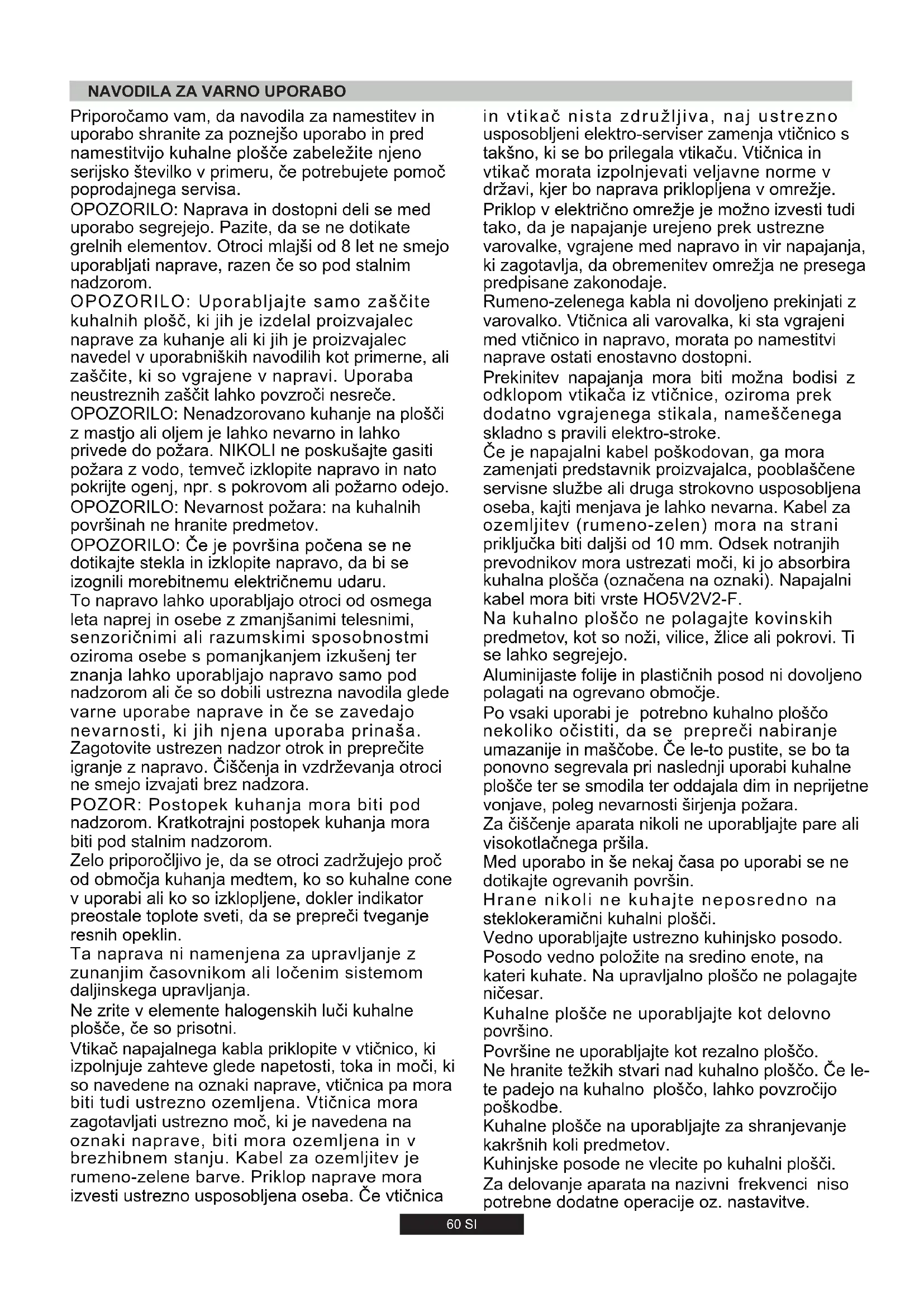 6SI0 in vtikač nista združljiva, naj ustrezno usposobljeni elektro-serviser zamenja vtičnico s takšno, ki se bo prilegala vtikaču. Vtičnica in vtikač morata izpolnjevati veljavne norme v državi, kjer bo naprava priklopljena v omrežje. Priklop v električno omrežje je možno izvesti tudi tako, da je napajanje urejeno prek ustrezne varovalke, vgrajene med napravo in vir napajanja, ki zagotavlja, da obremenitev omrežja ne presega predpisane zakonodaje. Rumeno-zelenega kabla ni dovoljeno prekinjati z varovalko. Vtičnica ali varovalka, ki sta vgrajeni med vtičnico in napravo, morata po namestitvi naprave ostati enostavno dostopni. Prekinitev napajanja mora biti možna bodisi z odklopom vtikača iz vtičnice, oziroma prek dodatno vgrajenega stikala, nameščenega skladno s pravili elektro-stroke. Če je napajalni kabel poškodovan, ga mora zamenjati predstavnik proizvajalca, pooblaščene servisne službe ali druga strokovno usposobljena oseba, kajti menjava je lahko nevarna. Kabel za ozemljitev (rumeno-zelen) mora na strani priključka biti daljši od 10 mm. Odsek notranjih prevodnikov mora ustrezati moči, ki jo absorbira kuhalna plošča (označena na oznaki). Napajalni kabel mora biti vrste HO5V2V2-F. Na kuhalno ploščo ne polagajte kovinskih predmetov, kot so noži, vilice, žlice ali pokrovi. Ti se lahko segrejejo. Aluminijaste folije in plastičnih posod ni dovoljeno polagati na ogrevano območje. Po vsaki uporabi je potrebno kuhalno ploščo nekoliko očistiti, da se prepreči nabiranje umazanije in maščobe. Če le-to pustite, se bo ta ponovno segrevala pri naslednji uporabi kuhalne plošče ter se smodila ter oddajala dim in neprijetne vonjave, poleg nevarnosti širjenja požara. Za čiščenje aparata nikoli ne uporabljajte pare ali visokotlačnega pršila. Med uporabo in še nekaj časa po uporabi se ne dotikajte ogrevanih površin. Hrane nikoli ne kuhajte neposredno na steklokeramični kuhalni plošči. Vedno uporabljajte ustrezno kuhinjsko posodo. Posodo vedno položite na sredino enote, na kateri kuhate. Na upravljalno ploščo ne polagajte ničesar. Kuhalne plošče ne uporabljajte kot delovno površino. Površine ne uporabljajte kot rezalno ploščo. Ne hranite težkih stvari nad kuhalno ploščo. Če le- te padejo na kuhalno ploščo, lahko povzročijo poškodbe. Kuhalne plošče na uporabljajte za shranjevanje kakršnih koli predmetov. Kuhinjske posode ne vlecite po kuhalni plošči. Za delovanje aparata na nazvnfrekvencnso potrebne dodatne operacje oz. nastavtve.KODA IZDELKA T Identifikacijska plošča (nameščena pod spodnjim ohišjem kuhalne plošče)