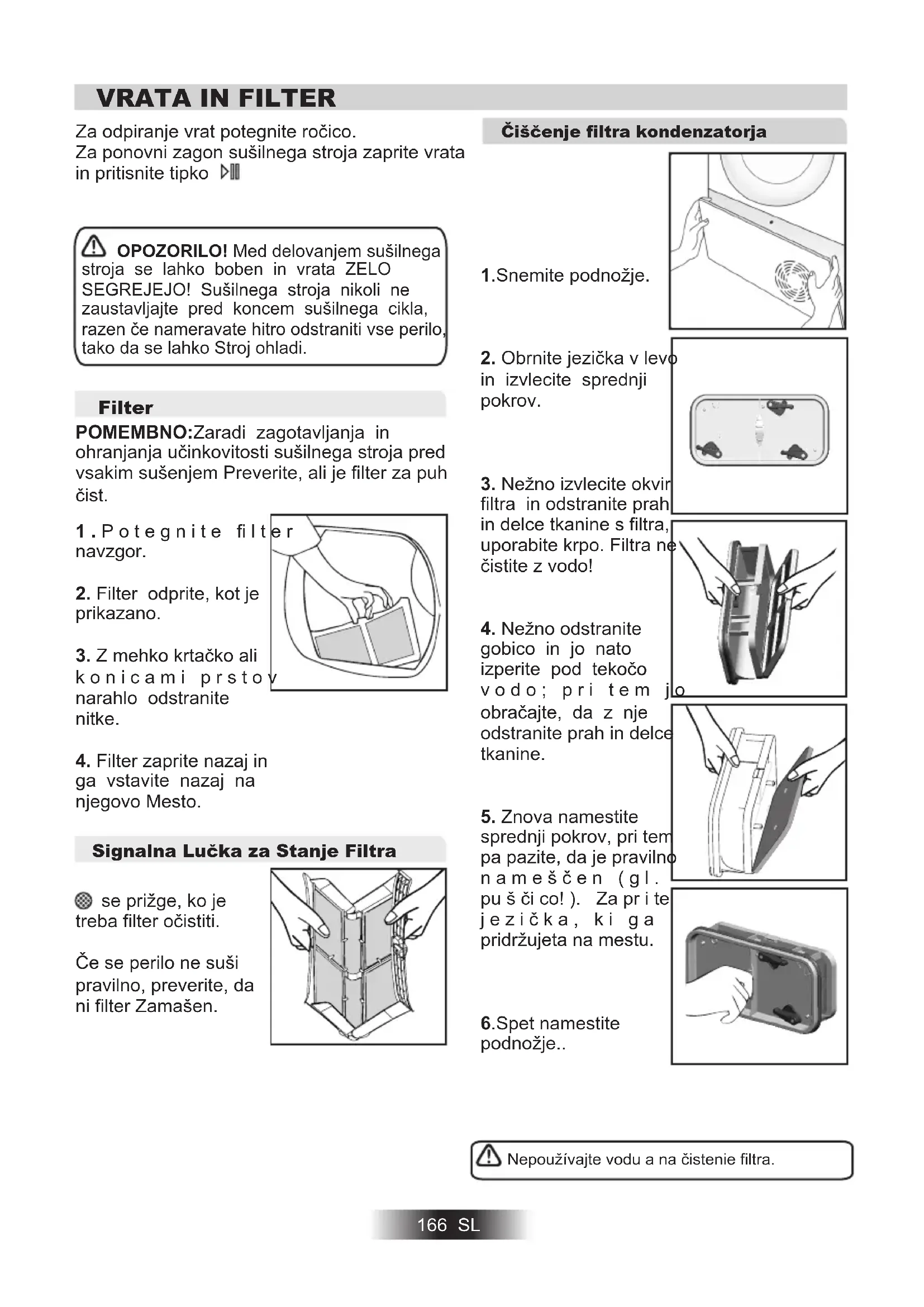 165 SL Program Mix & Dry Rapid 40 Min. Jeans Anti Crease Perfect Home Idealno Za Perilo, ki ga ni potrebno likati, ampak ga po sušenju obesite na obešalnik. Program traja pribl. 2 uri in 30 minut. Clothes you don’t need to iron, but just hang after the drying cycle. Time: around 2h and 30 min. Perilo, ki ga želite zložiti in shraniti brez likanja, npr. srajce iz mešanice vlaken, nogavice, otroška oblačila. Program traja pribl. 2 uri 45 minut. Perilo, ki ga želite posušiti do konca, npr. brisače, kopalne halje, prti, rjuhe. Program traja pribl. 3 ure. Za hkratno sušenje perila iz bombaža in sintetike. Zagotavlja prihranek na času, saj vam ni potrebno ločevati perila in sušiti vsake vrste posebej. Program traja pribl. 2 uri (največja dovoljena količina 4 kg). Za sušenje srajc iz bombaža in sintetičnih tkanin. Program traja 1 uro za 2 kg srajc iz sintetičnih tkanin (pribl. 10 srajc), 1 uro 20 minut za 3 kg srajc iz bombaža (pribl. 10 srajc). Stroj srajce posuši in osveži, tako da so pripravljene za ponovno uporabo, v samo 40 minutah. Senzorski sistem ndazira temperaturo in zagotavlja vsakič najboljše rezultate. Za največ 2 kg perila. Przeznaczony do suszenia ubrań jeans’owych ( 5 sztuk lub max 4kg). Program trwa około 2 godzin – jego długość jest uzależniona od wielkości załadunku i stopnia odwirowania ubrań podczas prania. Program JEANS może być używany także do suszenia innych ubrań, ale tylko bawełnianych (100%bawełny); proszę nie mieszać ubrań o różnych kolorach ani nie suszyć ubrań z haftami lub innymi ozdobami. Perilo, ki ga želite samo osvežiti. Primerno za perilo, ki je bilo nekaj časa shranjeno v košu za likanje, ali ste ga sušili na prostem ali na radiatorju. Program vsebuje posebno fazo za odpravljanje gub iz perila, ki sprošča vlakna in olajša likanje. Program traja 9 minut, sledi 3-minutna faza ohlajanja. Če želite, lahko sami določite trajanje programa sušenja - od 30 do 180 minut. Če nastavite "20 min", poteka sušenje s hladnim zrakom, kar je idealno za osvežitev perila in odstranitev morebitnega vonja. volnena oblačila: Program se lahko uporablja, da posuši do 1 kg perila (okoli 3 puloverje ).Priporočljivo je, da pred sušenjem obrnete vsa oblačila.čas se lahko spremeni zaradi dimenzije in debeline perila in izbranega ožemanja med pranjem.Ob koncu cikla so oblačila pripravljena, da se oblečejo, vendar če so le ta bolj težka, so lahko robovi malce mokri : predlagamo, da jih posušite naravno.Priporočljivo je, da izpraznite oblačila na samem koncu cikla.Priporočljivo je, da izpraznite oblačila na samem koncu cikla.Pozor: proces polstenja volne je nepovraten; posušite izključno oblačila s simbolom "primerno za sušenje " ; ta program ni primeren za akrilna oblačila. Osvežitev volne Srajce Hitri 40' Za likanje Za v omaro Suho brez likanjaVRATA IN FILTER 166 SL Čiščenje filtra kondenzatorja Za odpiranje vrat potegnite ročico. Za ponovni zagon sušilnega stroja zaprite vrata in pritisnite tipko OPOZORILO! Med delovanjem sušilnega stroja se lahko boben in vrata ZELO SEGREJEJO! Sušilnega stroja nikoli ne zaustavljajte pred koncem sušilnega cikla, razen če nameravate hitro odstraniti vse perilo, tako da se lahko Stroj ohladi. Signalna Lučka za Stanje Filtra se prižge, ko je treba filter očistiti. Če se perilo ne suši pravilno, preverite, da ni filter Zamašen. Filter POMEMBNO:Zaradi zagotavljanja in ohranjanja učinkovitosti sušilnega stroja pred vsakim sušenjem Preverite, ali je filter za puh čist. 1 . P o t e g n i t e fi l t e r navzgor.