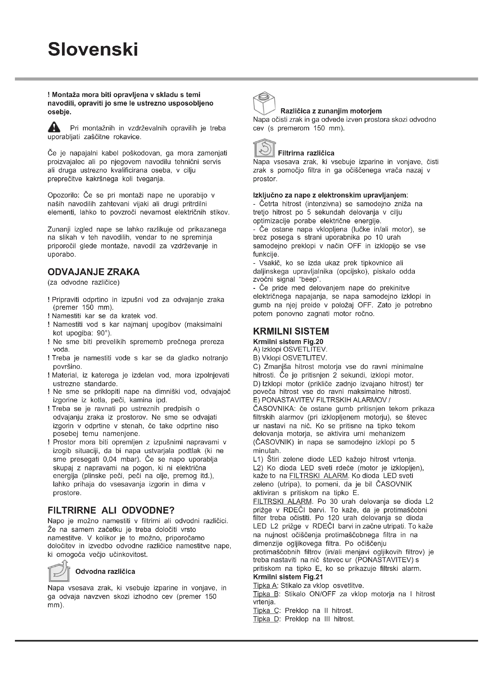 - Blokáda svislého teleskopového podnosu (pokud je pŕídán do sady) Blíkají-li všechny LED-y, je teleskopový podnos blokován. Počkejte 30 sekund a stiskněte tlačítko nahoru nebo dolů, pro uvolnění podnosu. Blíka-li tlačítko nahoru/dolů, není tukový filtr ve správné poloze. Nastavte jej správně. Je-li podnos blokován, zkontrolujte, zda nedošlo k odpojení napájecího kabelu. Pokud problém přetrvává, zavolejte technický servis.Slovenski ! Montaža mora biti opravljena v skladu s temi navodili, opraviti jo sme le ustrezno usposobljeno osebje. Pri montažnih in vzdrževalnih opravilih je treba uporabljati zaščitne rokavice. Če je napajalni kabel poškodovan, ga mora zamenjati proizvajalec ali po njegovem navodilu tehnični servis ali druga ustrezno kvalificirana oseba, v cilju preprečitve kakršnega koli tveganja. Opozorilo: Če se pri montaži nape ne uporabijo v naših navodilih zahtevani vijaki ali drugi pritrdilni elementi, lahko to povzroči nevarnost električnih stikov. Zunanji izgled nape se lahko razlikuje od prikazanega na slikah v teh navodilih, vendar to ne spreminja priporočil glede montaże, navodil za vzdrževanje in uporabo. ODVAJANJE ZRAKA (za odvodne različice) ! Pripraviti odprtino in izpušni vod za odvajanje zraka (premer 150 mm). ! Namestiti kar se da kratek vod. ! Namestiti vod s kar najmanj upogibov (maksimalni kot upogiba: 90°). ! Ne sme biti prevelikih sprememb prečnega prereza voda. ! Treba je namestiti vode s kar se da gladko notranjo površino. ! Material, iz katerega je izdelan vod, mora izpolnjevati ustrezne standarde. ! Ne sme se priklopiti nape na dimniški vod, odvajajoč izgorine iz kotla, peči, kamina ipd. ! Treba se je ravnati po ustreznih predpisih o odvajanju zraka iz prostorov. Ne sme se odvajati izgorin v odprtine v stenah, če take odprtine niso posebej temu namenjene. ! Prostor mora biti opremljen z izpušnimi napravami v izogib situaciji, da bi napa ustvarjala podtlak (ki ne sme presegati 0,04 mbar). Če se napo uporablja skupaj z napravami na pogon, ki ni električna energija (plinske peči, peči na olje, premog itd.), lahko prihaja do vsesavanja izgorin in dima v prostore. FILTRIRNE ALI ODVODNE? Napo je možno namestiti v filtrirni ali odvodni različici. Že na samem začetku je treba določiti vrsto namestitve. V kolikor je to možno, priporočamo določitev in izvedbo odvodne različice namestitve nape, ki omogoča večjo učinkovitost. Odvodna različica Napa vsesava zrak, ki vsebuje izparine in vonjave, in ga odvaja navzven skozi izhodno cev (premer 150 mm). Različica z zunanjim motorjem Napa očisti zrak in ga odvede izven prostora skozi odvodno cev (s premerom 150 mm). Filtrirna različica Napa vsesava zrak, ki vsebuje izparine in vonjave, čisti zrak s pomočjo filtra in ga očiščenega vrača nazaj v prostor. Izključno za nape z elektronskim upravljanjem: - Četrta hitrost (intenzivna) se samodejno zniža na tretjo hitrost po 5 sekundah delovanja v cilju optimizacije porabe električne energije. - Če ostane napa vklopljena (lučke in/ali motor), se brez posega s strani uporabnika po 10 urah samodejno preklopi v način OFF in izklopijo se vse funkcije. - Vsakič, ko se izda ukaz prek tipkovnice ali daljinskega upravljalnika (opcijsko), piskalo odda zvočni signal “beep”. - Če pride med delovanjem nape do prekinitve električnega napajanja, se napa samodejno izklopi in gumb na njej preide v položaj OFF. Zato je potrebno potem ponovno zagnati motor ročno. KRMILNI SISTEM Krmilni sistem Fig.20 A) Izklopi OSVETLITEV. B) Vklopi OSVETLITEV. C) Zmanjša hitrost motorja vse do ravni minimalne hitrosti. Če je pritisnjen 2 sekundi, izklopi motor. D) Izklopi motor (prikliče zadnjo izvajano hitrost) ter poveča hitrost vse do ravni maksimalne hitrosti.