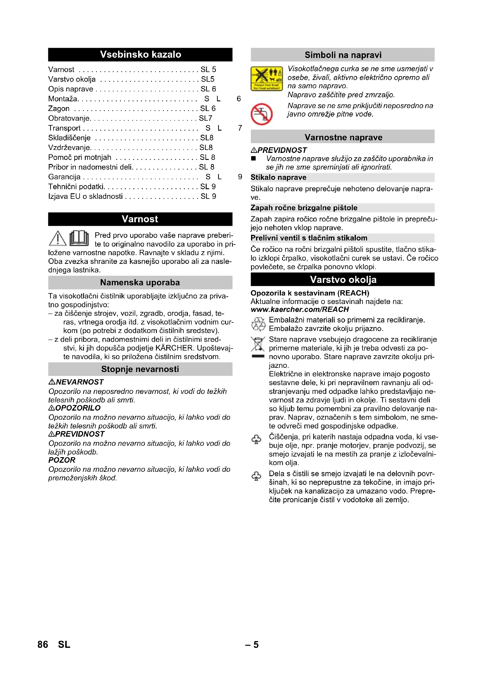 90 dB(A) Technické změny jsou vyhrazeny. EU prohlášení o shodě Výrobek: Vysokotlaký čistič Typ: 1.676-xxx Příslušné směrnice EU: 2000/14/ES 2014/30/EU 2006/42/ES (+2009/127/ES) 2011/65/EU Použité harmonizační normy EN 50581 EN 55014–1: 2006+A1: 2009+A2: 2011 EN 55014–2: 2015 EN 60335–1 EN 60335–2–79 EN 61000–3–2: 2014 EN 61000–3–3: 2013 EN 62233: 2008 Použitý postup posuzování shody: 2000/14/ES: Příloha V Hladinu akustického dB(A) Namerenou: 88 Garantovanou: 90 Winnenden, 2016/04/01 CEO Head of Approbation 85CS– 5 Pred prvo uporabo vaše naprave preberi- te to originalno navodilo za uporabo in pri- ložene varnostne napotke. Ravnajte v skladu z njimi. Oba zvezka shranite za kasnejšo uporabo ali za nasle- dnjega lastnika. Ta visokotlačni čistilnik uporabljajte izključno za priva- tno gospodinjstvo: – za čiščenje strojev, vozil, zgradb, orodja, fasad, te- ras, vrtnega orodja itd. z visokotlačnim vodnim cur- kom (po potrebi z dodatkom čistilnih sredstev). – z deli pribora, nadomestnimi deli in čistilnimi sred- stvi, ki jih dopušča podjetje KÄRCHER. Upoštevaj- te navodila, ki so priložena čistilnim sredstvom. NEVARNOST Opozorilo na neposredno nevarnost, ki vodi do težkih telesnih poškodb ali smrti. 몇 OPOZORILO Opozorilo na možno nevarno situacijo, ki lahko vodi do težkih telesnih poškodb ali smrti. 몇 PREVIDNOST Opozorilo na možno nevarno situacijo, ki lahko vodi do lažjih poškodb. POZOR Opozorilo na možno nevarno situacijo, ki lahko vodi do premoženjskih škod. 몇 PREVIDNOST Varnostne naprave služijo za zaščito uporabnika in se jih ne sme spreminjati ali ignorirati. Stikalo naprave preprečuje nehoteno delovanje napra- ve. Zapah zapira ročico ročne brizgalne pištole in prepreču- jejo nehoten vklop naprave. Če ročico na ročni brizgalni pištoli spustite, tlačno stika- lo izklopi črpalko, visokotlačni curek se ustavi. Če ročico povlečete, se črpalka ponovno vklopi. Opozorila k sestavinam (REACH) Aktualne informacije o sestavinah najdete na: www.kaercher.com/REACH Vsebinsko kazalo Varnost . . . . . . . . . . . . . . . . . . . . . . . . . . . . . SL 5 Varstvo okolja . . . . . . . . . . . . . . . . . . . . . . . . SL5 Opis naprave . . . . . . . . . . . . . . . . . . . . . . . . . SL 6 Montaža. . . . . . . . . . . . . . . . . . . . . . . . . . . . .SL 6 Zagon . . . . . . . . . . . . . . . . . . . . . . . . . . . . . . SL 6 Obratovanje. . . . . . . . . . . . . . . . . . . . . . . . . . SL7 Transport . . . . . . . . . . . . . . . . . . . . . . . . . . . .SL 7 Skladiščenje . . . . . . . . . . . . . . . . . . . . . . . . . SL8 Vzdrževanje. . . . . . . . . . . . . . . . . . . . . . . . . . SL8 Pomoč pri motnjah . . . . . . . . . . . . . . . . . . . . SL 8 Pribor in nadomestni deli. . . . . . . . . . . . . . . . SL 8 Garancija . . . . . . . . . . . . . . . . . . . . . . . . . . . .SL 9 Tehnični podatki. . . . . . . . . . . . . . . . . . . . . . . SL 9 Izjava EU o skladnosti . . . . . . . . . . . . . . . . . . SL 9 Varnost Namenska uporaba Stopnje nevarnosti Simboli na napravi Visokotlačnega curka se ne sme usmerjati v osebe, živali, aktivno električno opremo ali na samo napravo. Napravo zaščitite pred zmrzaljo. Naprave se ne sme priključiti neposredno na javno omrežje pitne vode. Varnostne naprave Stikalo naprave Zapah ročne brizgalne pištole Prelivni ventil s tlačnim stikalom Varstvo okolja Embalažni materiali so primerni za recikliranje. Embalažo zavrzite okolju prijazno. Stare naprave vsebujejo dragocene za recikliranje primerne materiale, ki jih je treba odvesti za po- novno uporabo. Stare naprave zavrzite okolju pri- jazno. Električne in elektronske naprave imajo pogosto sestavne dele, ki pri nepravilnem ravnanju ali od- stranjevanju med odpadke lahko predstavljajo ne- varnost za zdravje ljudi in okolje. Ti sestavni deli so kljub temu pomembni za pravilno delovanje na- prav. Naprav, označenih s tem simbolom, ne sme- te odvreči med gospodinjske odpadke. Čiščenja, pri katerih nastaja odpadna voda, ki vse- buje olje, npr. pranje motorjev, pranje podvozij, se smejo izvajati le na mestih za pranje z izločevalni- kom olja. Dela s čistili se smejo izvajati le na delovnih povr- šinah, ki so neprepustne za tekočine, in imajo pri- ključek na kanalizacijo za umazano vodo. Prepre- čite pronicanje čistil v vodotoke ali zemljo. 86 SL– 6 V tem navodilu za uporabo je opisana maksimalna oprema. Glede na model prihaja do razlik v obsegu do- bave (glejte embalažo). Obseg dobave Vaše naprave je prikazan na embalaži. Pri jemanju stroja iz embalaže preverite popolnost vse- bine. Pri manjkajočem priboru ali transportnih škodah obve- stite Vašega prodajalca. Za slike glejte razklopno stran! 1 Visokotlačni priključek 2 Stikalo naprave „0/OFF“ / „I/ON“ 3 Shranjevalna kljuka za omrežni priključni kabel 4 Shranjevalo za visokotlačno gibko cev 5 Transportni ročaj 6 Vodni priključek z vgrajenim sitom 7 Gibka cev za sesanje čistila s filtrom za čistilo in po- krovom 8 Rezervoar za čistilno sredstvo 9 Spojni del za priključek za vodo 10 Shranjevalo za brizgalno cev 11 Shranjevalo za ročno brizgalno pištolo 12 Omrežni priključni vodnik z omrežnim vtičem 13 Transportno kolo 14 Ročna brizgalna pištola 15 Zapah ročne brizgalne pištole 16 Sponke za visokotlačno cev 17 Visokotlačna cev 18 Brizgalna cev z reguliranjem tlaka (Vario Power) Za običajne čistilne naloge. Delovni tlak se lahko zvezno regulira med "Min" in Max". V položaju „Mix“ se lahko dodaja čistilno sredstvo. Za nastavljanje delovnega tlaka spustite ročico roč- ne brizgalne pištole in brizgalno cev zavrtite na že- leni položaj. 19 Brizgalna cev s strgalom za umazanijo Za trdovratno umazanijo Pred zagonom montirajte napravi prosto priložene dele. Za slike glejte razklopno stran! Slika Transportna kolesa vtaknite in zaskočite. Slika Nataknite in privijte transportni ročaj. Slika Priložen spoj