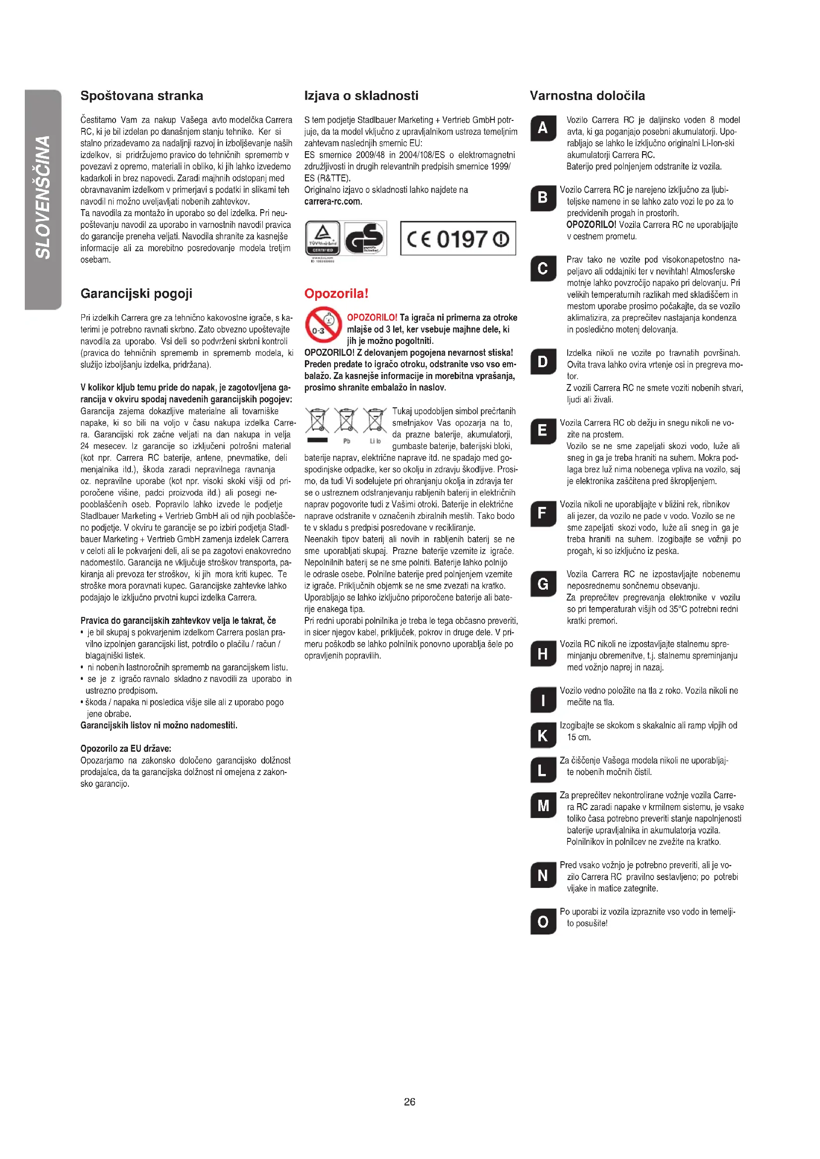- škoda / napaka ni posledica višje sile ali z uporabo pogo jene obrabe. Garancijskih listov ni možno nadomestiti. Opozorilo za EU države: Opozarjamo na zakonsko določeno garancijsko dolžnost prodajalca, da ta garancijska dolžnost ni omejena z zakon- sko garancijo. Izjava o skladnosti S tem podjetje Stadlbauer Marketing + Vertrieb GmbH potr- juje, da ta model vključno z upravljalnikom ustreza temeljnim zahtevam naslednjih smernic EU: ES smernice 2009/48 in 2004/108/ES o elektromagnetni združljivosti in drugih relevantnih predpisih smernice 1999/ ES (R&TTE). Originalno izjavo o skladnosti lahko najdete na carrera-rc.com. Opozorila! OPOZORILO! Ta igrača ni primerna za otroke mlajše od 3 let, ker vsebuje majhne dele, ki jih je možno pogoltniti. OPOZORILO! Z delovanjem pogojena nevarnost stiska! Preden predate to igračo otroku, odstranite vso vso em- balažo. Za kasnejše informacije in morebitna vprašanja, prosimo shranite embalažo in naslov. Tukaj upodobljen simbol prečrtanih smetnjakov Vas opozarja na to, da prazne baterije, akumulatorji, gumbaste baterije, baterijski bloki, baterije naprav, električne naprave itd. ne spadajo med go- spodinjske odpadke, ker so okolju in zdravju škodljive. Prosi- mo, da tudi Vi sodelujete pri ohranjanju okolja in zdravja ter se o ustreznem odstranjevanju rabljenih baterij in električnih naprav pogovorite tudi z Vašimi otroki. Baterije in električne naprave odstranite v označenih zbiralnih mestih. Tako bodo te v skladu s predpisi posredovane v recikliranje. Neenakih tipov baterij ali novih in rabljenih baterij se ne sme uporabljati skupaj. Prazne baterije vzemite iz igrače. Nepolnilnih baterij se ne sme polniti. Baterije lahko polnijo le odrasle osebe. Polnilne baterije pred polnjenjem vzemite iz igrače. Priključnih objemk se ne sme zvezati na kratko. Uporabljajo se lahko izključno priporočene baterije ali bate- rije enakega tipa. Pri redni uporabi polnilnika je treba le tega občasno preveriti, in sicer njegov kabel, priključek, pokrov in druge dele. V pri- meru poškodb se lahko polnilnik ponovno uporablja šele po opravljenih popravilih. Varnostna določila