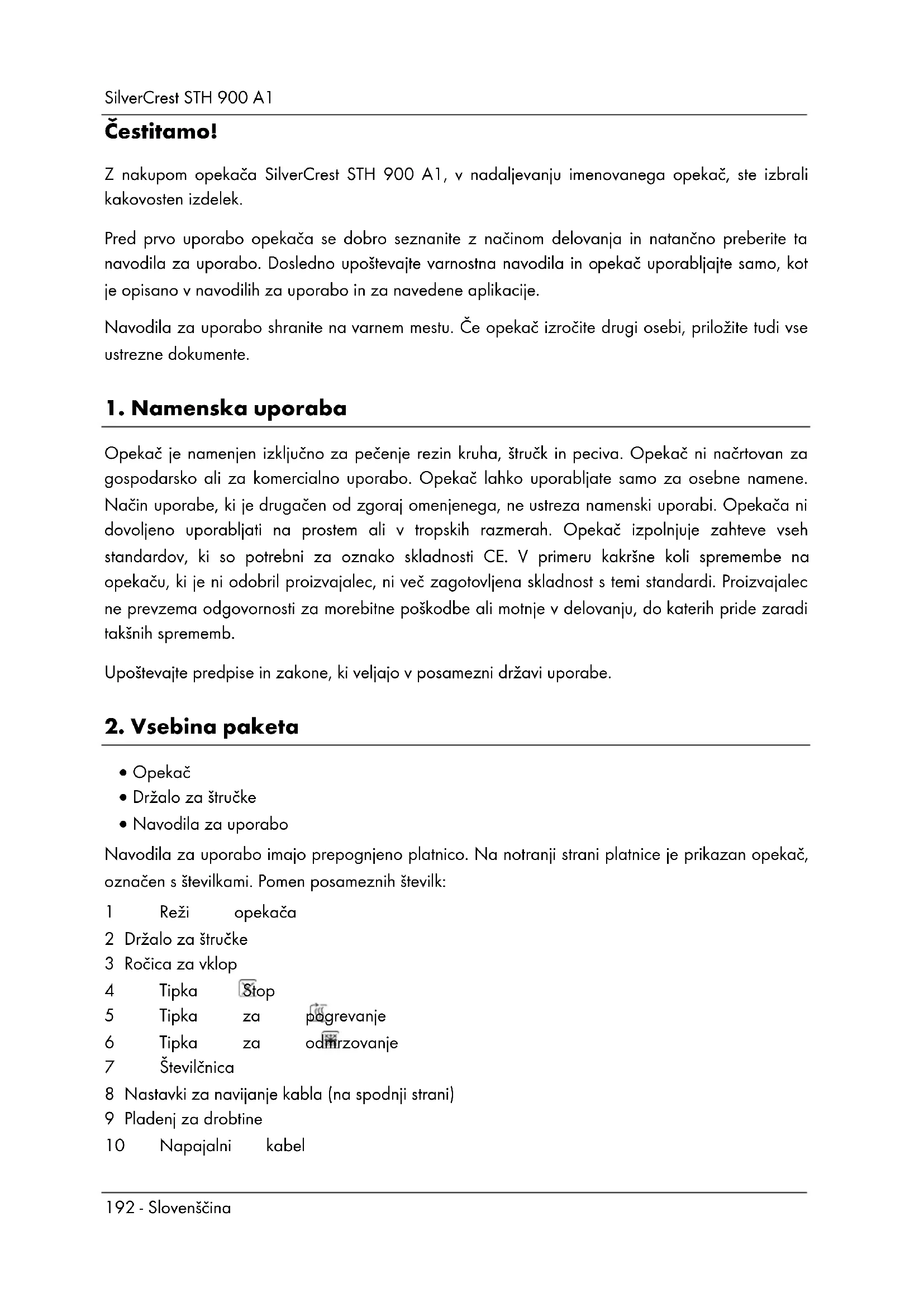 - Navodila za uporabo Navodila za uporabo imajo prepognjeno platnico. Na notranji strani platnice je prikazan opekač, označen s številkami. Pomen posameznih številk: 1 Reži opekača 2 Držalo za štručke 3 Ročica za vklop 4 Tipka Stop 5 Tipka za pogrevanje 6 Tipka za odmrzovanje 7 Številčnica 8 Nastavki za navijanje kabla (na spodnji strani) 9 Pladenj za drobtine 10 Napajalni kabelSilverCrest STH 900 A1 Slovenščina - 193