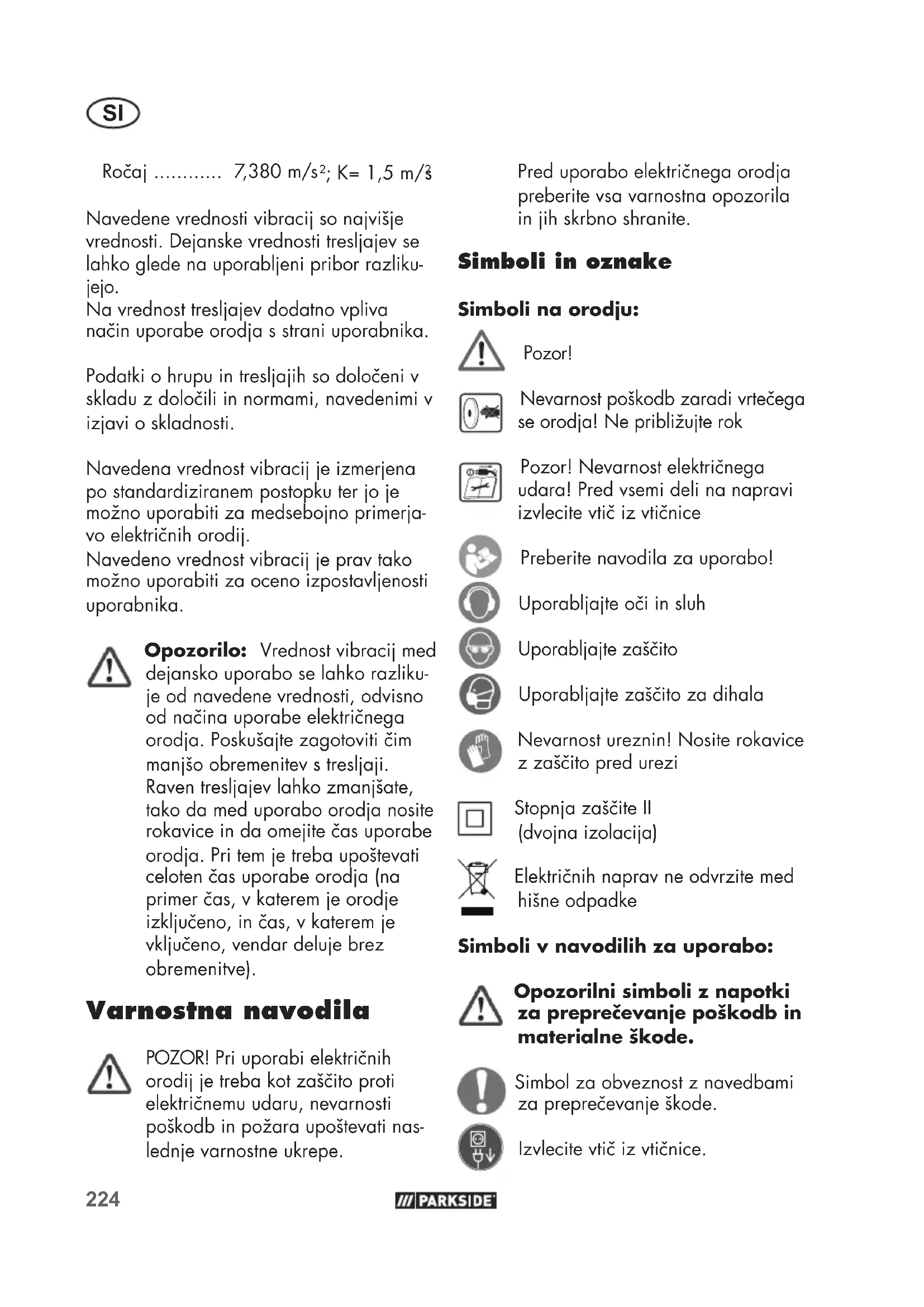Navedene vrednosti vibracij so najvišje vrednosti. Dejanske vrednosti tresljajev se lahko glede na uporabljeni pribor razliku- jejo. Na vrednost tresljajev dodatno vpliva načinuporabeorodjasstraniuporabnika. Podatkiohrupuintresljajihsodoločeniv skladuzdoločiliinnormami,navedenimiv izjavi o skladnosti. Navedena vrednost vibracij je izmerjena po standardiziranem postopku ter jo je možnouporabitizamedsebojnoprimerja- voelektričnihorodij. Navedeno vrednost vibracij je prav tako možnouporabitizaocenoizpostavljenosti uporabnika. Opozorilo: Vrednost vibracij med dejansko uporabo se lahko razliku- je od navedene vrednosti, odvisno odnačinauporabeelektričnega orodja.Poskušajtezagotovitičim manjšo obremenitev s tresljaji. Raven tresljajev lahko zmanjšate, tako da med uporabo orodja nosite rokaviceindaomejitečasuporabe orodja. Pri tem je treba upoštevati celotenčasuporabeorodja(na primerčas,vkateremjeorodje izključeno,inčas,vkateremje vključeno,vendardelujebrez obremenitve). Varnostna navodila POZOR!Priuporabielektričnih orodijjetrebakotzaščitoproti električnemuudaru,nevarnosti poškodbinpožaraupoštevatinas- lednje varnostne ukrepe. Preduporaboelektričnegaorodja preberite vsa varnostna opozorila in jih skrbno shranite. Simboli in oznake Simboli na orodju: Pozor! Nevarnostpoškodbzaradivrtečega seorodja!Nepribližujterok Pozor!Nevarnostelektričnega udara!Predvsemidelinanapravi izvlecitevtičizvtičnice Preberitenavodilazauporabo! Uporabljajteočiinsluh Uporabljajtezaščito Uporabljajtezaščitozadihala Nevarnostureznin!Nositerokavice zzaščitopredurezi StopnjazaščiteII (dvojna izolacija) Električnihnapravneodvrzitemed hišne odpadke Simboli v navodilih za uporabo: Opozorilni simboli z napotki za preprečevanje poškodb in materialne škode. Simbol za obveznost z navedbami zapreprečevanješkode. Izvlecitevtičizvtičnice.SI