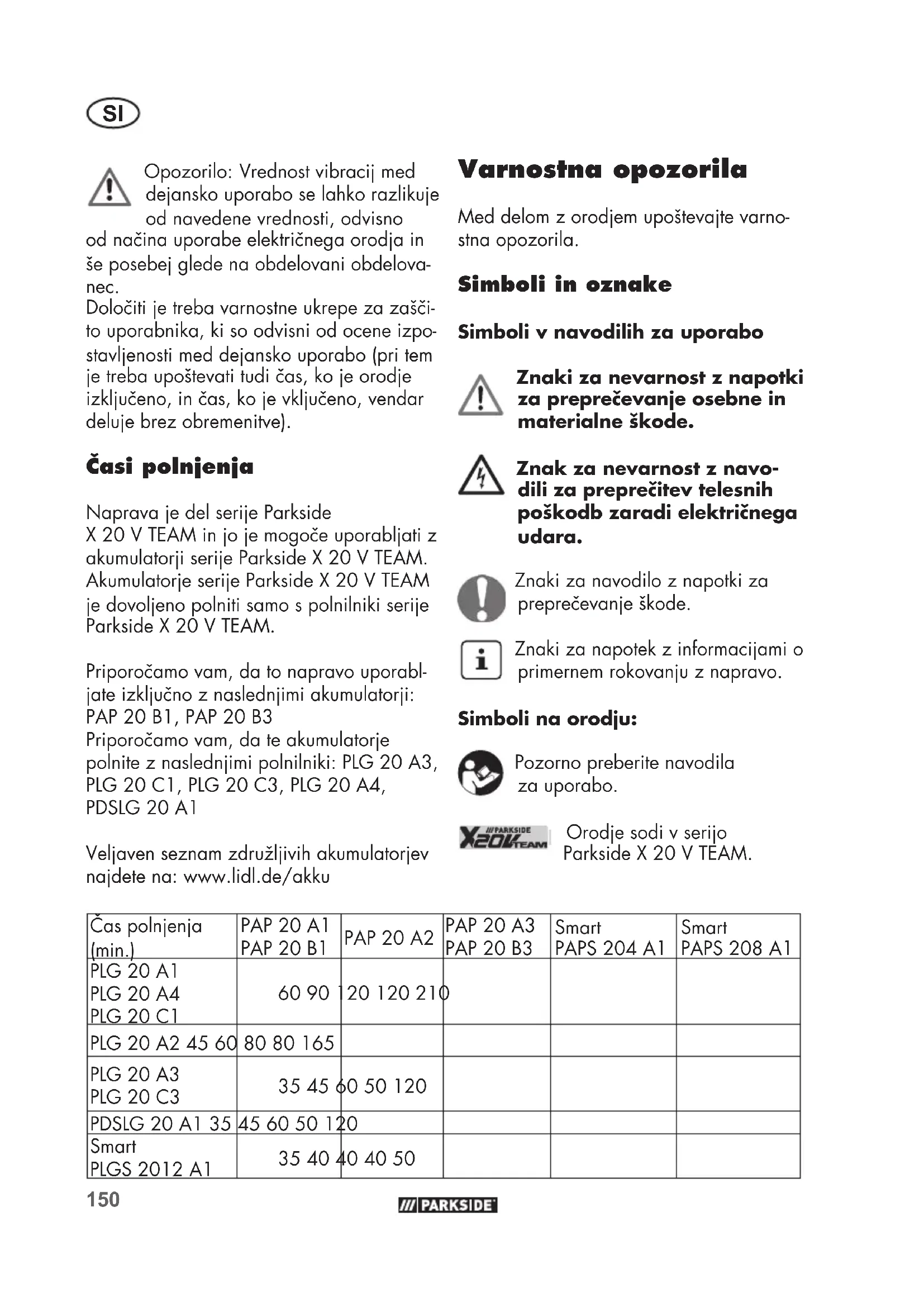 Opozorilo: Vrednost vibracij med dejansko uporabo se lahko razlikuje od navedene vrednosti, odvisno od načina uporabe električnega orodja in še posebej glede na obdelovani obdelova- nec. Določiti je treba varnostne ukrepe za zašči- to uporabnika, ki so odvisni od ocene izpo- stavljenosti med dejansko uporabo (pri tem je treba upoštevati tudi čas, ko je orodje izključeno, in čas, ko je vključeno, vendar deluje brez obremenitve). Časipolnjenja Naprava je del serije Parkside X20VTEAM in jo je mogoče uporabljati z akumulatorji serije Parkside X20VTEAM. Akumulatorje serije Parkside X20V TEAM je dovoljeno polniti samo s polnilniki serije Parkside X20V TEAM. Priporočamo vam, da to napravo uporabl- jate izključno z naslednjimi akumulatorji: