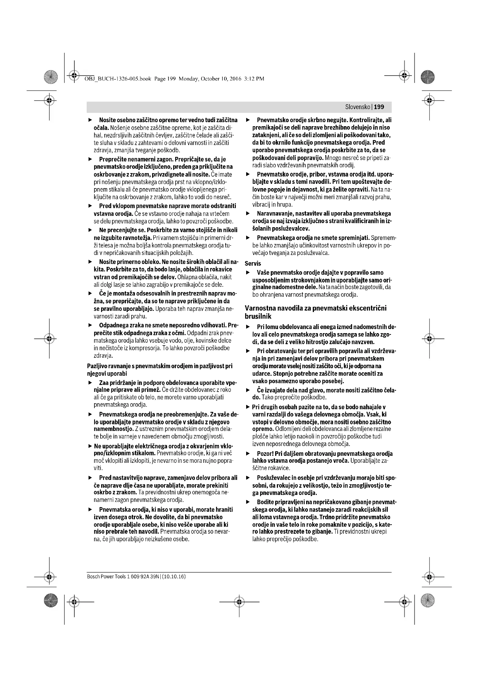 Pred vgradnjo, obratovanjem, po- pravilom, vzdržeanjem in zamenjavo nadomestnih delov ter pred pričetkom dela si v bližini pnevmatskega orodja preberite in upoštevajte vsa navo- dila. Neupoštevanje varnostnih navodil v nadaljevanju lahko povzroči težke poškodbe. Dobro shranite vsa varnostna navodila in jo izročite poslu- ževalcu naprave. Varnost na delovnem mestu Pazite na površine, ki bi lahko zaradi uporabe stroja po- stale spolzke in na nevarnosti spotaknitve zaradi zrač- ne ali hidravlične gibke cevi. Spodrsljaji, spotaknitve in padci so glavni vzroki poškodb na delovnem mestu. S pnevmatskim orodjem ne smete delati v okolju, kjer je nevarnost eksplozije, ker tam obstajajo gorljive te- kočine, plini ali prah. Pri obdelavi obdelovanca lahko pri- de do iskrenja, ki lahko povzroči vnetje prahu ali pare. Ko uporabljate pnevmatsko orodje, morate poskrbeti za to, da otroci in obiskovalci ne pridejo blizu delovne- mu mestu. Če druge osebe zmotijo vašo pozornost, lahko izgubite nadzor nad pnevmatskim orodjem. Varnost pnevmatskih orodij Zračnega toka nikoli ne usmerjajte proti sebi ali proti drugim osebam in odvajajte hladen zrak stran od rok. Stisnjeni zrak lahko povzroči resne poškodbe. Kontrolirajte priključke in oskrbovalne vode. Vse vzdr- ževalne enote, sklopke in gibke cevi morajo glede na tlak in količino zraka biti projektirane v skladu s tehničnimi podat- ki. Prenizek tlak negativno vpliva na delovanje pnevmat- skega orodja, previsok tlak lahko povzroči materialne ško- de in poškodbe. Zaščitite gibke cevi pred prepogibi, zoženji, topili in ostrimi robovi. Poskrbite za to, da se gibke cevi ne bo- do nahajale v bližini vročine, olja in rotirajočih se delov. Nemudoma odstranite poškodovano gibko cev. Zaradi poškodovanega oskrbovalnega voda lahko tlačna gibka cev udarja naokoli in povzroči poškodbe. Dvigajoč prah ali ostružki lahko privedejo do težkih poškodb oči. Pazite na to, da so objemke gibke cevi vselej trdno za- tegnjene. Če objemke gibke cevi niso trdno zategnjene ali če so poškodovane, lahko zrak nekontrolirano uhaja. Varnost oseb Bodite pozorni, pazite na to, kar delajte in razumno de- lajte s pnevmatskim orodjem. Pnevmatskega orodja ne uporabljajte, kadar ste zaspani ali pod vplivom drog, al- kohola ali zdravil. Le trenutek nepazljivosti pri uporabi pnevmatskega orodja lahko vodi do resnih poškodb. OPOZORILO OBJ_BUCH-1326-005.book Page 198 Monday, October 10, 2016 3:12 PMSlovensko | 199 Bosch Power Tools 1 609 92A 39N | (10.10.16) Nosite osebno zaščitno opremo ter vedno tudi zaščitna očala. Nošenje osebne zaščitne opreme, kot je zaščita di- hal, nezdrsljivih zaščitnih čevljev, zaščitne čelade ali zašči- te sluha v skladu z zahtevami o delovni varnosti in zaščiti zdravja, zmanjša tveganje poškodb. Preprečite nenamerni zagon. Prepričajte se, da je pnevmatsko orodje izključeno, preden ga priključite na oskrbovanje z zrakom, privzdignete ali nosite. Če imate pri nošenju pnevmatskega orodja prst na vklopno/izklo- pnem stikalu ali če pnevmatsko orodje vklopljenega pri- ključite na oskrbovanje z zrakom, lahko to vodi do nesreč. Pred vklopom pnevmatske naprave morate odstraniti vstavna orodja. Če se vstavno orodje nahaja na vrtečem se delu pnevmatskega orodja, lahko to povzroči poškodbe. Ne precenjujte se. Poskrbite za varno stojišče in nikoli ne izgubite ravnotežja. Pri varnem stojišču in primerni dr- ži telesa je možna boljša kontrola pnevmatskega orodja tu- di v nepričakovanih situacijskih položajih. Nosite primerno obleko. Ne nosite širokih oblačil ali na- kita. Poskrbite za to, da bodo lasje, oblačila in rokavice vstran od premikajočih se delov. Ohlapna oblačila, nakit ali dolgi lasje se lahko zagrabijo v premikajoče se dele. Če je montaža odsesovalnih in prestreznih naprav mo- žna, se prepričajte, da so te naprave priključene in da se pravilno uporabljajo. Uporaba teh naprav zmanjša ne- varnosti zaradi prahu. Odpadnega zraka ne smete neposredno vdihovati. Pre- prečite stik odpadnega zraka z očmi. Odpadni zrak pnev- matskega orodja lahko vsebuje vodo, olje, kovinske delce in nečistoče iz kompresorja. To lahko povzroči poškodbe zdravja. Pazljivo ravnanje s pnevmatskim orodjem in pazljivost pri njegovi uporabi Zaa pridržanje in podporo obdelovanca uporabite vpe- njalne priprave ali primež. Če držite obdelovanec z roko ali če ga pritiskate ob telo, ne morete varno uporabljati pnevmatskega orodja. Pnevmatskega orodja ne preobremenjujte. Za vaše de- lo uporabljajte pnevmatsko orodje v skladu z njegovo namembnostjo. Z ustreznim pnevmatskim orodjem dela- te bolje in varneje v navedenem območju zmogljivosti. Ne uporabljajte električnega orodja z okvarjenim vklo- pno/izklopnim stikalom. Pnevmatsko orodje, ki ga ni več moč vklopiti ali izklopiti, je nevarno in se mora nujno popra- viti. Pred nastavitvijo naprave, zamenjavo delov pribora ali če naprave dlje časa ne uporabljate, morate prekiniti oskrbo z zrakom. Ta previdnostni ukrep onemogoča ne- namerni zagon pnevmatskega orodja. Pnevmatska orodja, ki niso v uporabi, morate hraniti izven dosega otrok. Ne dovolite, da bi pnevmatsko orodje uporabljale osebe, ki niso vešče uporabe ali ki niso prebrale teh navodil. Pnevmatska orodja so nevar- na, če jih uporabljajo neizkušene osebe. Pnevmatsko orodje skrbno negujte. Kontrolirajte, ali premikajoči se deli naprave brezhibno delujejo in niso zataknjeni, ali če so deli zlomljeni ali poškodovani tako, da bi to okrnilo funkcijo pnevmatskega orodja. Pred uporabo pnevmatskega orodja poskrbite za to, da se poškodovani deli popravijo. Mnogo nesreč se pripeti za- radi slabo vzdrževanih pnevmatskih orodij. Pnevmatsko orodje, pribor, vstavna orodja itd. upora- bljajte v skladu s temi navodili. Pri tem upoštevajte de- lovne pogoje in dejavnost, ki ga želite opraviti. Na ta na- čin boste kar v največji možni meri zmanjšali razvoj prahu, vibracij in hrupa. Naravnavanje, na
