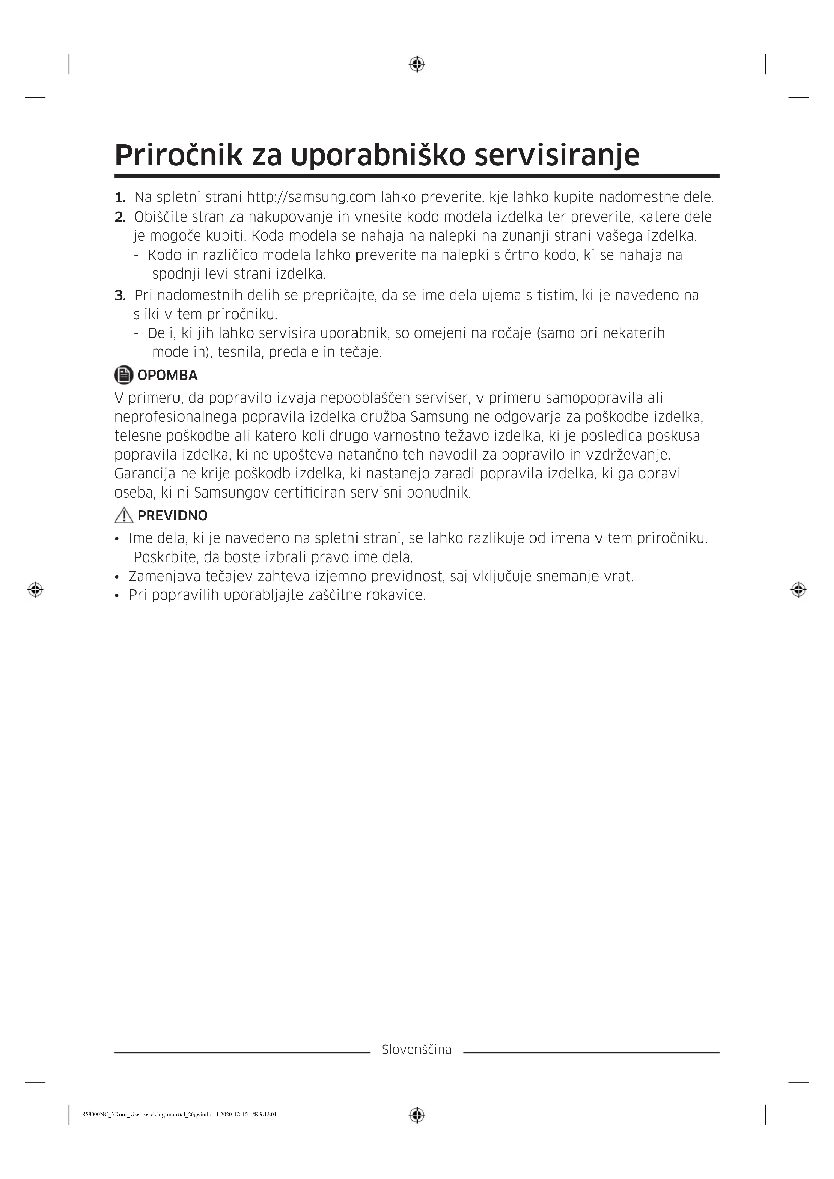 sliki v tem priročniku. - Deli, ki jih lahko servisira uporabnik, so omejeni na ročaje (samo pri nekaterih modelih), tesnila, predale in tečaje. OPOMBA V primeru, da popravilo izvaja nepooblaščen serviser, v primeru samopopravila ali neprofesionalnega popravila izdelka družba Samsung ne odgovarja za poškodbe izdelka, telesne poškodbe ali katero koli drugo varnostno težavo izdelka, ki je posledica poskusa popravila izdelka, ki ne upošteva natančno teh navodil za popravilo in vzdrževanje. Garancija ne krije poškodb izdelka, ki nastanejo zaradi popravila izdelka, ki ga opravi oseba, ki ni Samsungov certiciran servisni ponudnik. PREVIDNO
