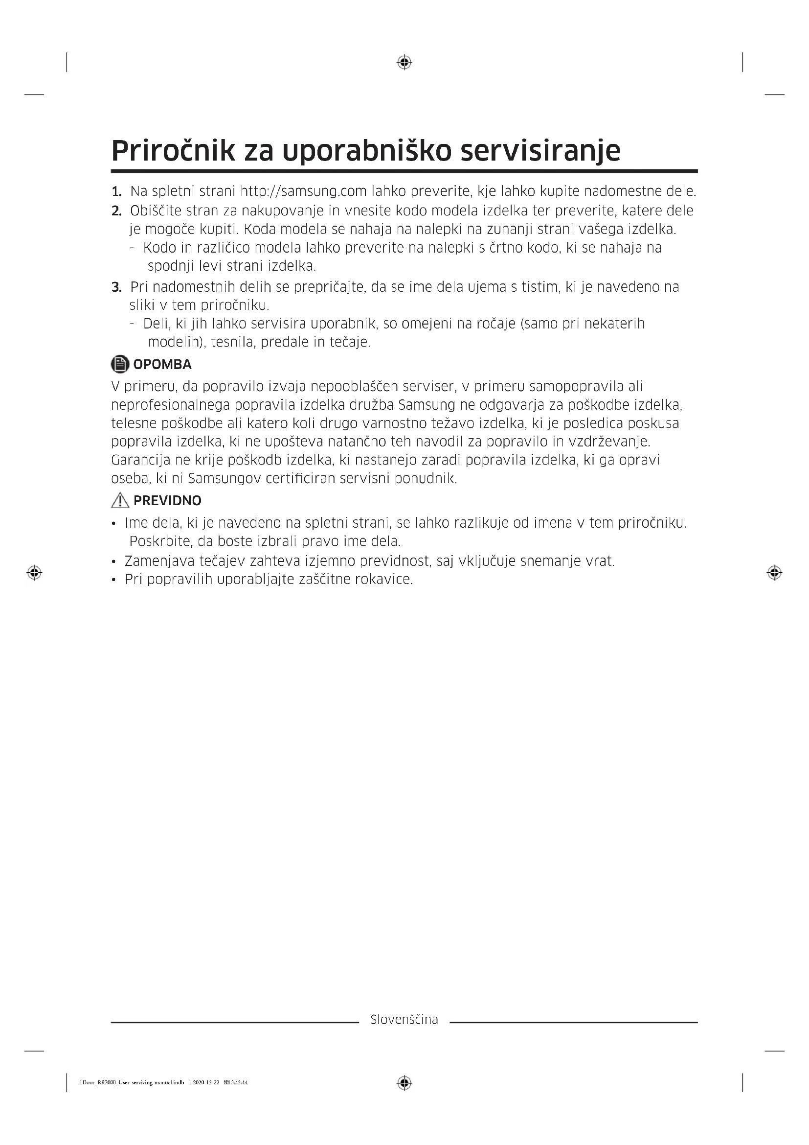 sliki v tem priročniku. - Deli, ki jih lahko servisira uporabnik, so omejeni na ročaje (samo pri nekaterih modelih), tesnila, predale in tečaje. OPOMBA V primeru, da popravilo izvaja nepooblaščen serviser, v primeru samopopravila ali neprofesionalnega popravila izdelka družba Samsung ne odgovarja za poškodbe izdelka, telesne poškodbe ali katero koli drugo varnostno težavo izdelka, ki je posledica poskusa popravila izdelka, ki ne upošteva natančno teh navodil za popravilo in vzdrževanje. Garancija ne krije poškodb izdelka, ki nastanejo zaradi popravila izdelka, ki ga opravi oseba, ki ni Samsungov certiciran servisni ponudnik. PREVIDNO