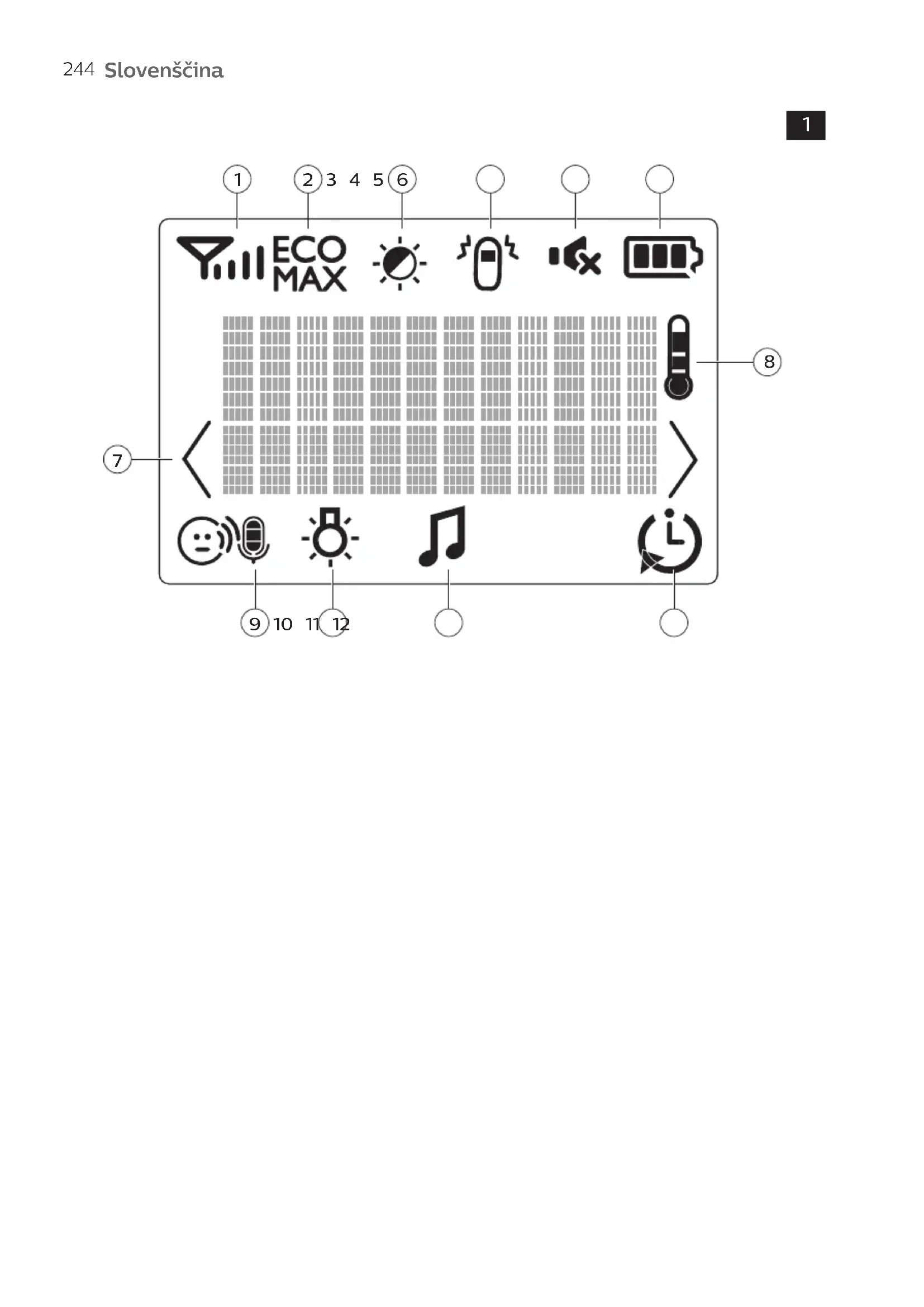 4 Na zaslonu utripa indicator načina Eco Max. Indikator povezave počasi utripa zeleno, kadar otroška enota ne oddaja signala starševski enoti.