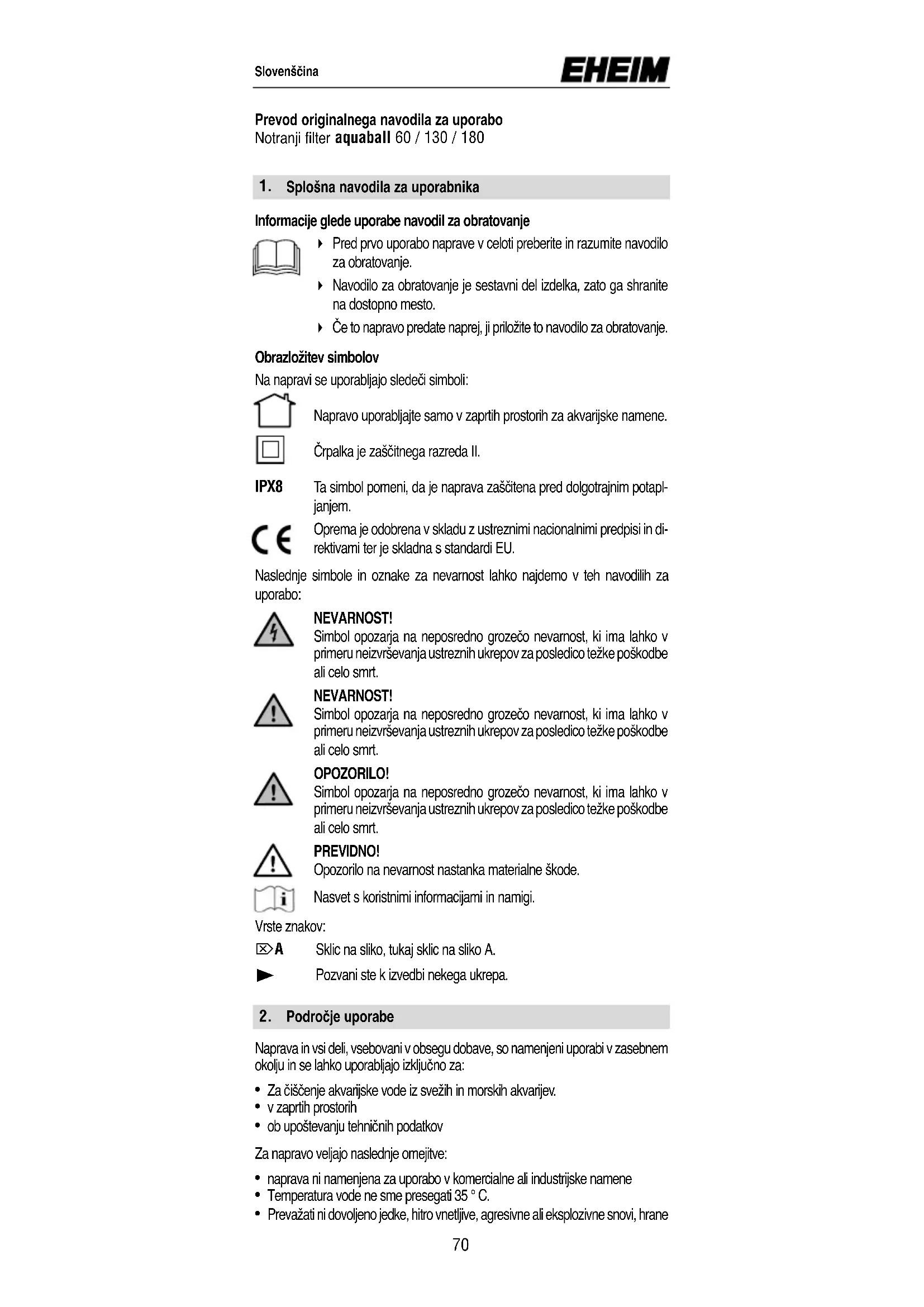 Zakończenie użytkowania1. Splošna navodila za uporabnika Informacije glede uporabe navodil za obratovanje 4 Pred prvo uporabo naprave v celoti preberite in razumite navodilo za obratovanje. 4 Navodilo za obratovanje je sestavni del izdelka, zato ga shranite na dostopno mesto. 4 Če to napravo predate naprej, ji priložite to navodilo za obratovanje. Obrazložitev simbolov Na napravi se uporabljajo sledeči simboli: Napravo uporabljajte samo v zaprtih prostorih za akvarijske namene. Črpalka je zaščitnega razreda II. IPX8 Ta simbol pomeni, da je naprava zaščitena pred dolgotrajnim potapl- janjem. Oprema je odobrena v skladu z ustreznimi nacionalnimi predpisi in di- rektivami ter je skladna s standardi EU. Naslednje simbole in oznake za nevarnost lahko najdemo v teh navodilih za uporabo: NEVARNOST! Simbol opozarja na neposredno grozečo nevarnost, ki ima lahko v primeru neizvrševanja ustreznih ukrepov za posledico težke poškodbe ali celo smrt. NEVARNOST! Simbol opozarja na neposredno grozečo nevarnost, ki ima lahko v primeru neizvrševanja ustreznih ukrepov za posledico težke poškodbe ali celo smrt. OPOZORILO! Simbol opozarja na neposredno grozečo nevarnost, ki ima lahko v primeru neizvrševanja ustreznih ukrepov za posledico težke poškodbe ali celo smrt. PREVIDNO! Opozorilo na nevarnost nastanka materialne škode. Nasvet s koristnimi informacijami in namigi. Vrste znakov: