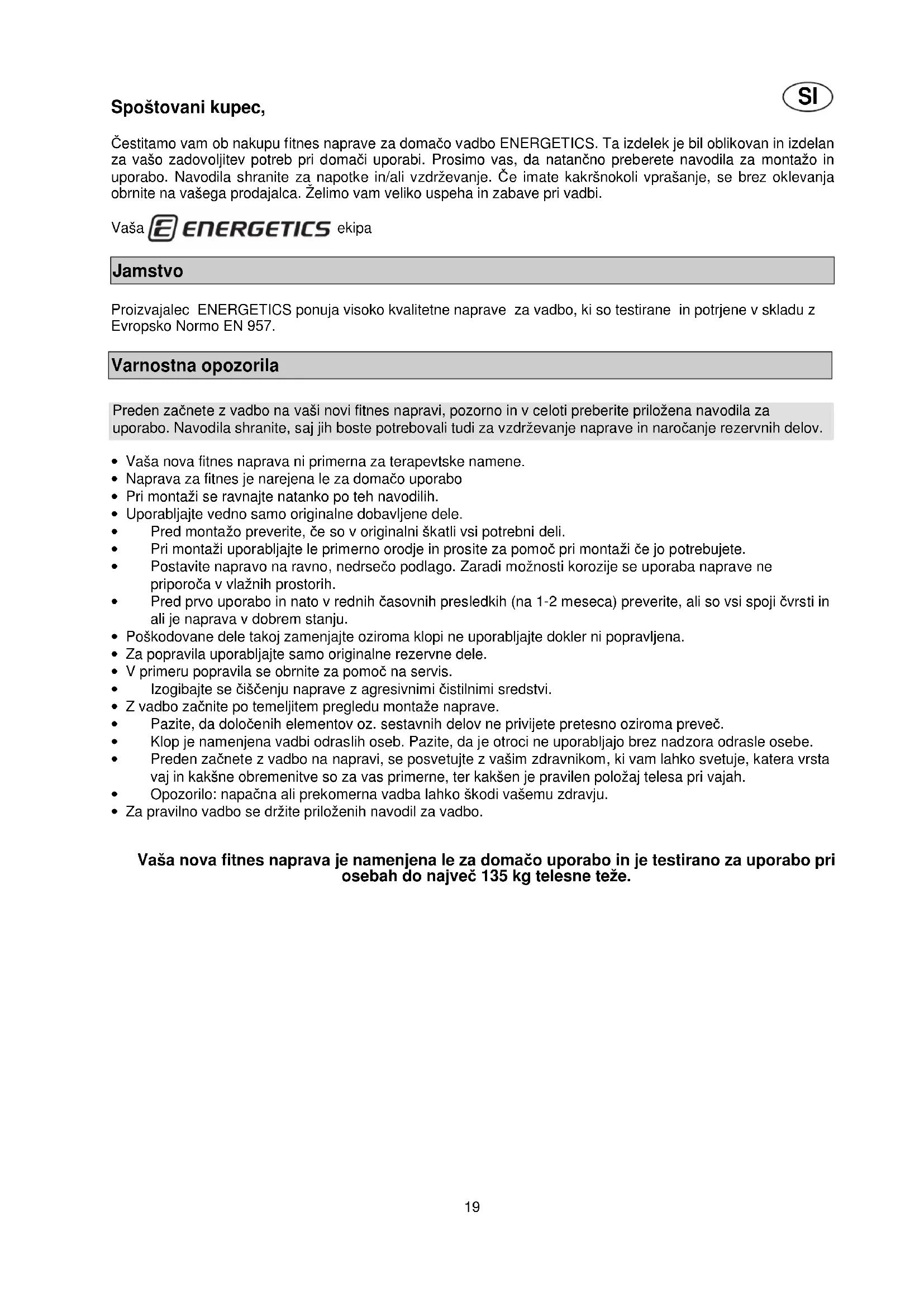Spoštovani kupec, Čestitamo vam ob nakupu fitnes naprave za domačo vadbo ENERGETICS. Ta izdelek je bil oblikovan in izdelan za vašo zadovoljitev potreb pri domači uporabi. Prosimo vas, da natančno preberete navodila za montažo in uporabo. Navodila shranite za napotke in/ali vzdrževanje. Če imate kakršnokoli vprašanje, se brez oklevanja obrnite na vašega prodajalca. Želimo vam veliko uspeha in zabave pri vadbi. Vaša ekipa Jamstvo Proizvajalec ENERGETICS ponuja visoko kvalitetne naprave za vadbo, ki so testirane in potrjene v skladu z Evropsko Normo EN 957. Varnostna opozorila