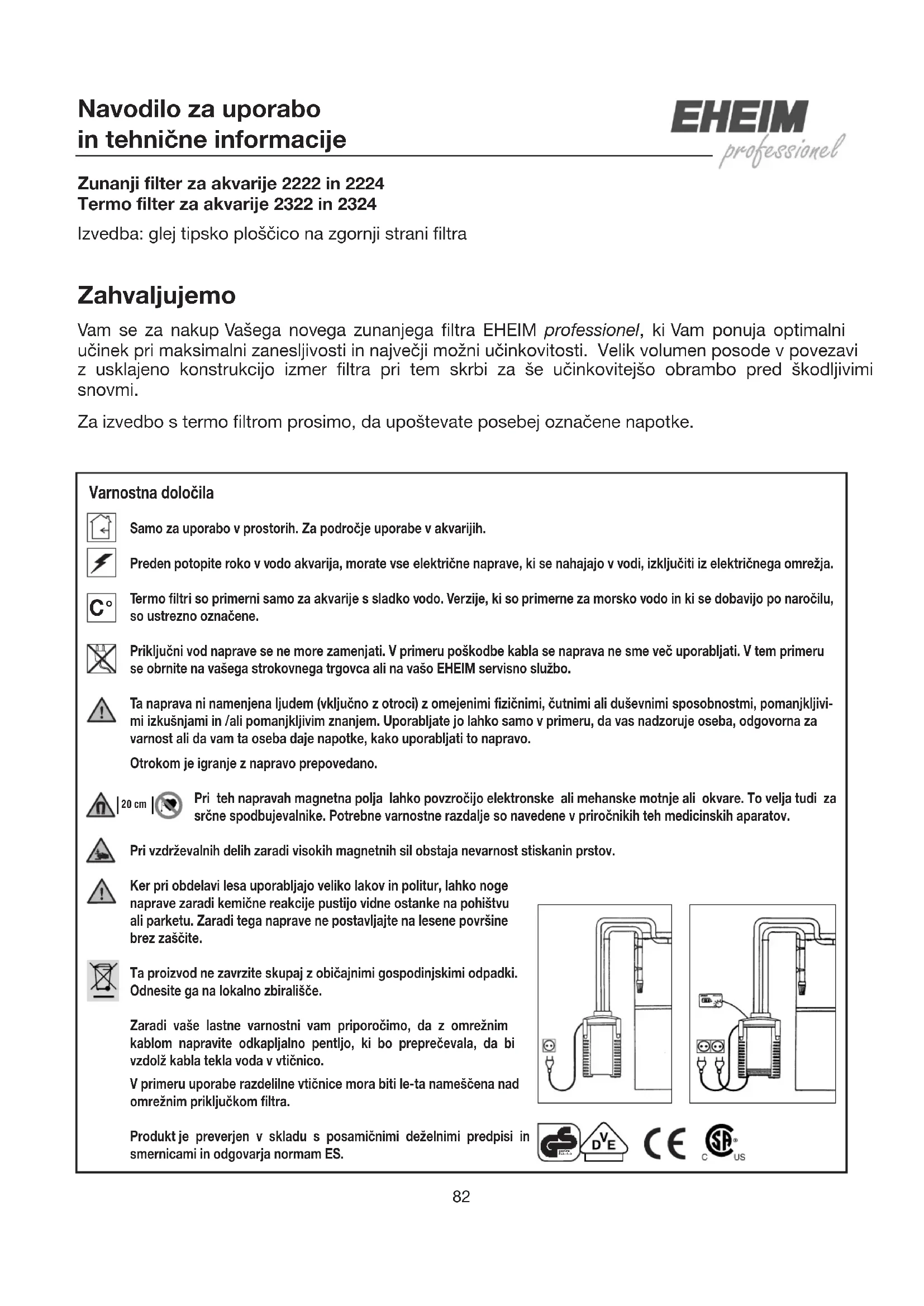 °82 Navodilo za uporabo in tehnične informacije Zunanji filter za akvarije 2222 in 2224 Termo filter za akvarije 2322 in 2324 Izvedba: glej tipsko ploščico na zgornji strani filtra Zahvaljujemo Vam se za nakup Vašega novega zunanjega filtra EHEIM professionel, ki Vam ponuja optimalni učinek pri maksimalni zanesljivosti in največji možni učinkovitosti. Velik volumen posode v povezavi z usklajeno konstrukcijo izmer filtra pri tem skrbi za še učinkovitejšo obrambo pred škodljivimi snovmi. Za izvedbo s termo filtrom prosimo, da upoštevate posebej označene napotke. Varnostna določila Samo za uporabo v prostorih. Za področje uporabe v akvarijih. Preden potopite roko v vodo akvarija, morate vse električne naprave, ki se nahajajo v vodi, izključiti iz električnega omrežja. Termo filtri so primerni samo za akvarije s sladko vodo. Verzije, ki so primerne za morsko vodo in ki se dobavijo po naročilu, so ustrezno označene.Priključni vod naprave se ne more zamenjati. V primeru poškodbe kabla se naprava ne sme več uporabljati. V tem primeruse obrnite na vašega strokovnega trgovca ali na vašo EHEIM servisno službo. Ta naprava ni namenjena ljudem (vključno z otroci) z omejenimi fizičnimi, čutnimi ali duševnimi sposobnostmi, pomanjkljivi- mi izkušnjami in /ali pomanjkljivim znanjem. Uporabljate jo lahko samo v primeru, da vas nadzoruje oseba, odgovorna zavarnost ali da vam ta oseba daje napotke, kako uporabljati to napravo.Otrokom je igranje z napravo prepovedano.Pri teh napravah magnetna polja lahko povzročijo elektronske ali mehanske motnje ali okvare. To velja tudi zasrčne spodbujevalnike. Potrebne varnostne razdalje so navedene v priročnikih teh medicinskih aparatov. Pri vzdrževalnih delih zaradi visokih magnetnih sil obstaja nevarnost stiskanin prstov.Ker pri obdelavi lesa uporabljajo veliko lakov in politur, lahko nogenaprave zaradi kemične reakcije pustijo vidne ostanke na pohištvuali parketu. Zaradi tega naprave ne postavljajte na lesene površinebrez zaščite.Ta proizvod ne zavrzite skupaj z običajnimi gospodinjskimi odpadki. Odnesite ga na lokalno zbirališče.Zaradi vaše lastne varnostni vam priporočimo, da z omrežnimkablom napravite odkapljalno pentljo, ki bo preprečevala, da bivzdolž kabla tekla voda v vtičnico.V primeru uporabe razdelilne vtičnice mora biti le-ta nameščena nadomrežnim priključkom filtra.Produkt je preverjen v skladu s posamičnimi deželnimi predpisi insmernicami in odgovarja normam ES.