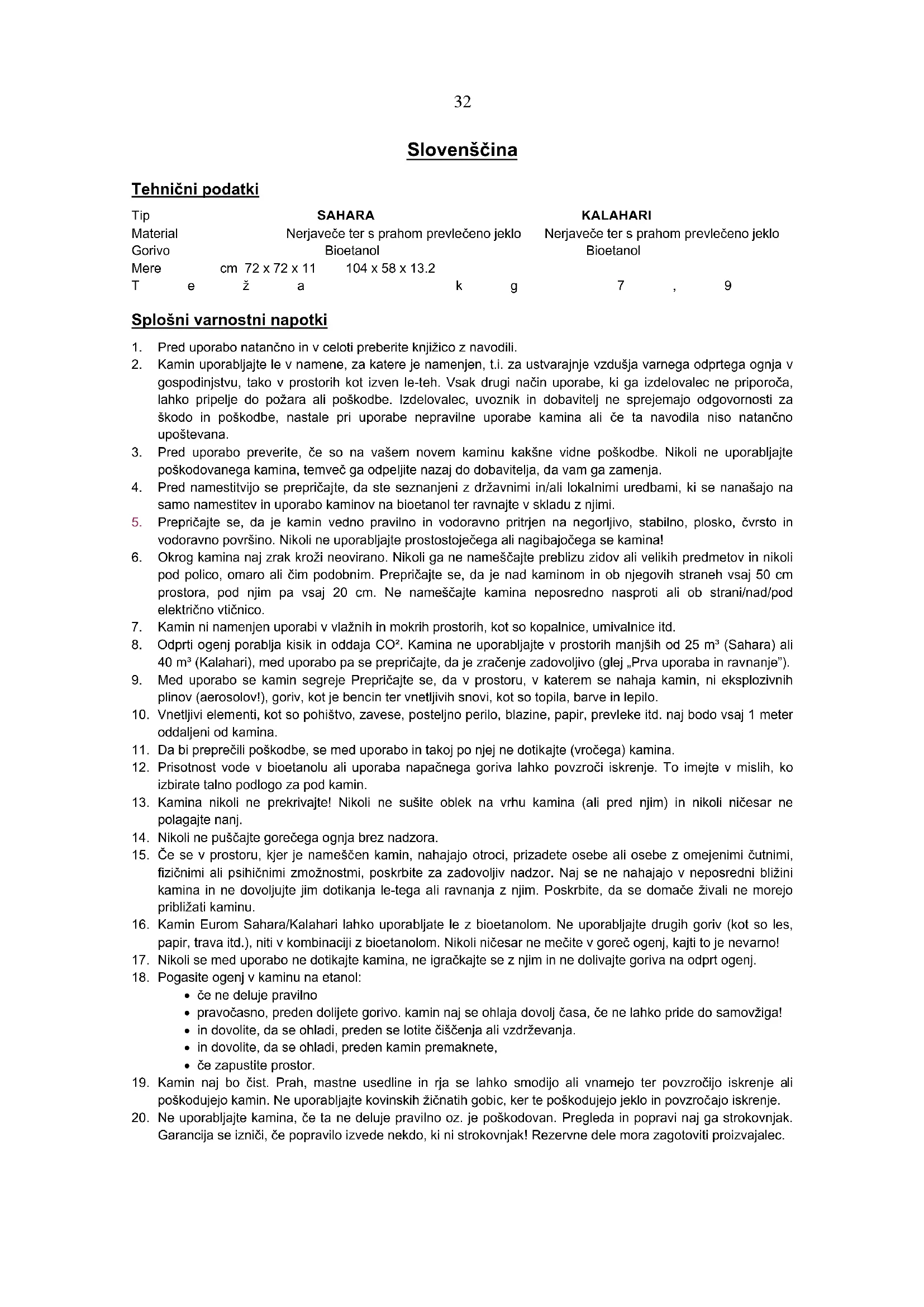 16. Kamin Eurom Sahara/Kalahari lahko uporabljate le z bioetanolom. Ne uporabljajte drugih goriv (kot so les,