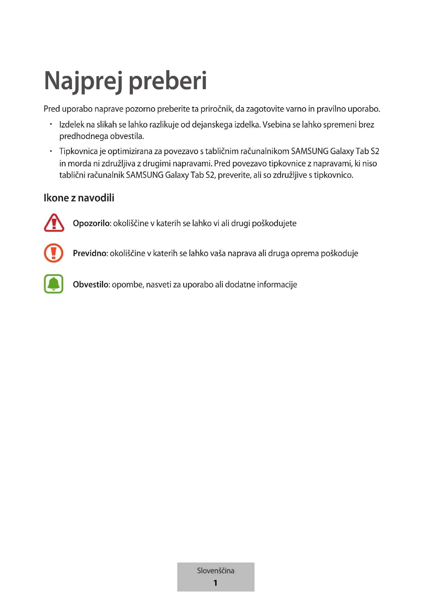 Tipkovnica je optimizirana za povezavo s tabličnim računalnikom SAMSUNG Galaxy Tab S2 in morda ni združljiva z drugimi napravami. Pred povezavo tipkovnice z napravami, ki niso tablični računalnik SAMSUNG Galaxy Tab S2, preverite, ali so združljive s tipkovnico. Ikone z navodili Opozorilo: okoliščine v katerih se lahko vi ali drugi poškodujete Previdno: okoliščine v katerih se lahko vaša naprava ali druga oprema poškoduje Obvestilo: opombe, nasveti za uporabo ali dodatne informacije Slovenščina