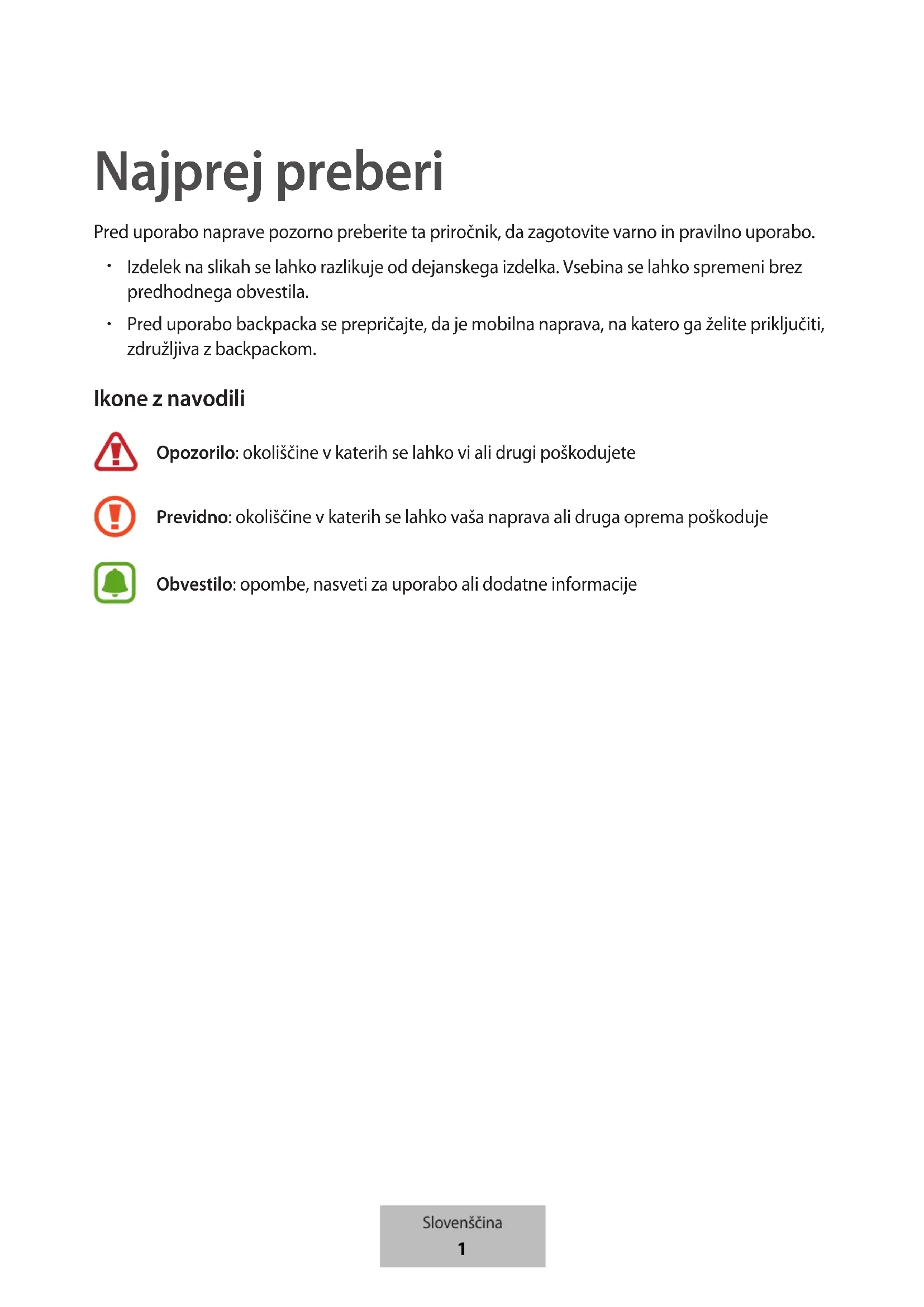 Pred uporabo backpacka se prepričajte, da je mobilna naprava, na katero ga želite priključiti, združljiva z backpackom. Ikone z navodili Opozorilo: okoliščine v katerih se lahko vi ali drugi poškodujete Previdno: okoliščine v katerih se lahko vaša naprava ali druga oprema poškoduje Obvestilo: opombe, nasveti za uporabo ali dodatne informacije Slovenščina