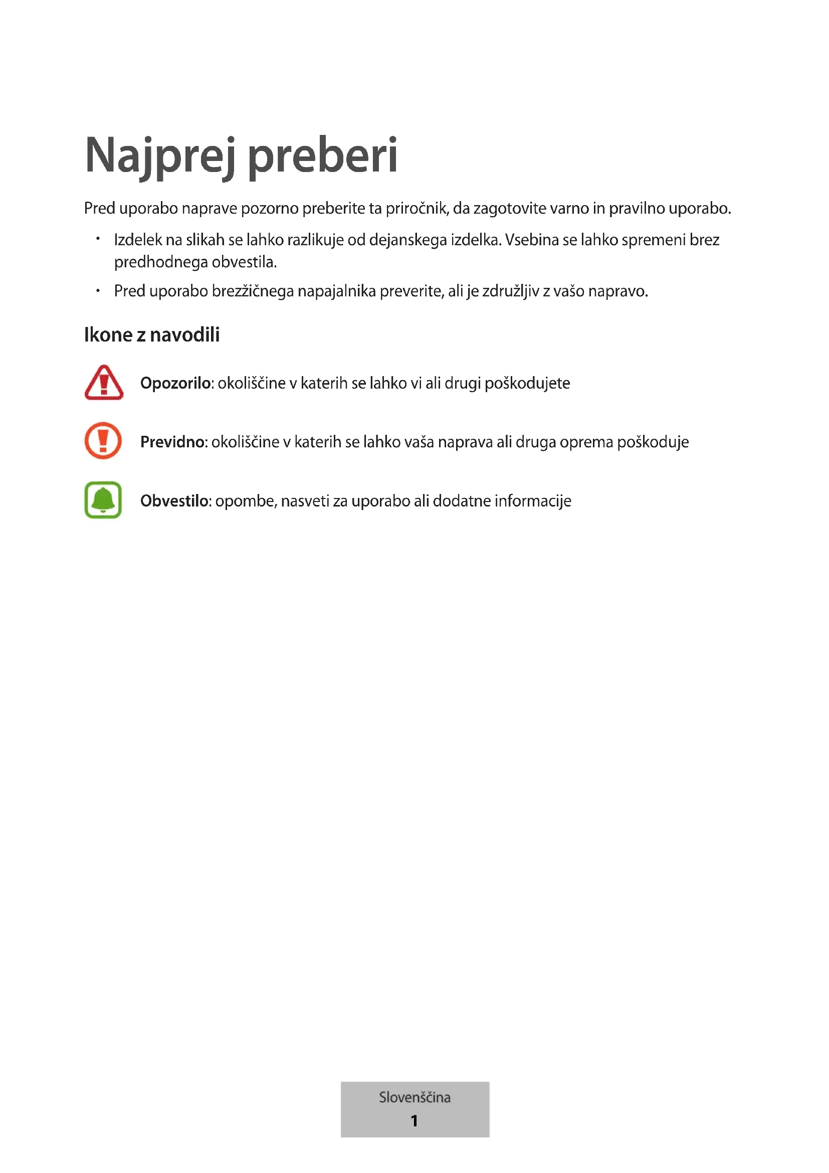 Pred uporabo brezžičnega napajalnika preverite, ali je združljiv z vašo napravo. Ikone z navodili Opozorilo: okoliščine v katerih se lahko vi ali drugi poškodujete Previdno: okoliščine v katerih se lahko vaša naprava ali druga oprema poškoduje Obvestilo: opombe, nasveti za uporabo ali dodatne informacije Slovenščina