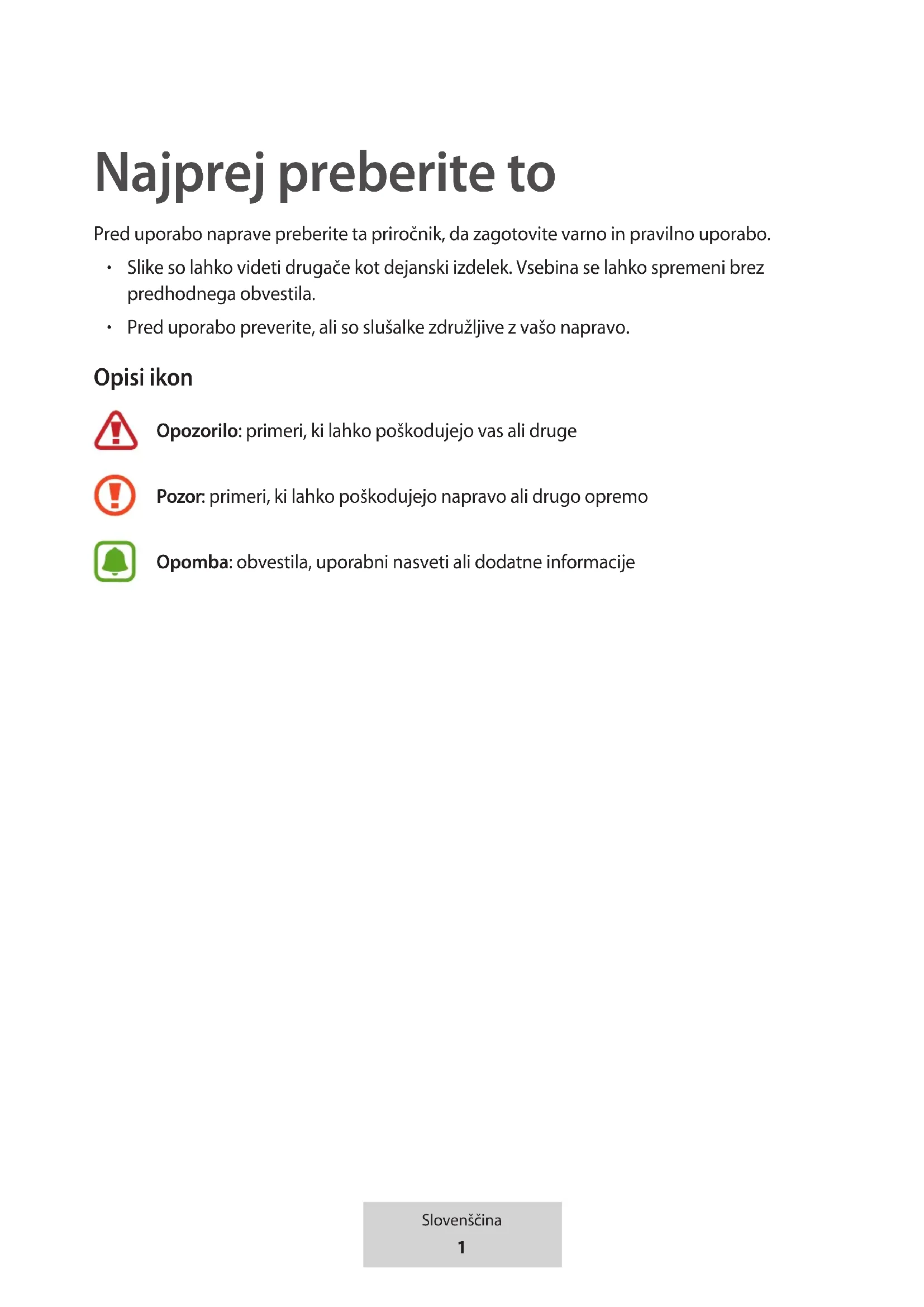 Pred uporabo preverite, ali so slušalke združljive z vašo napravo. Opisi ikon Opozorilo: primeri, ki lahko poškodujejo vas ali druge Pozor: primeri, ki lahko poškodujejo napravo ali drugo opremo Opomba: obvestila, uporabni nasveti ali dodatne informacije2 Slovenščina Začetek Vsebina paketa V kompletu morajo biti naslednji deli: